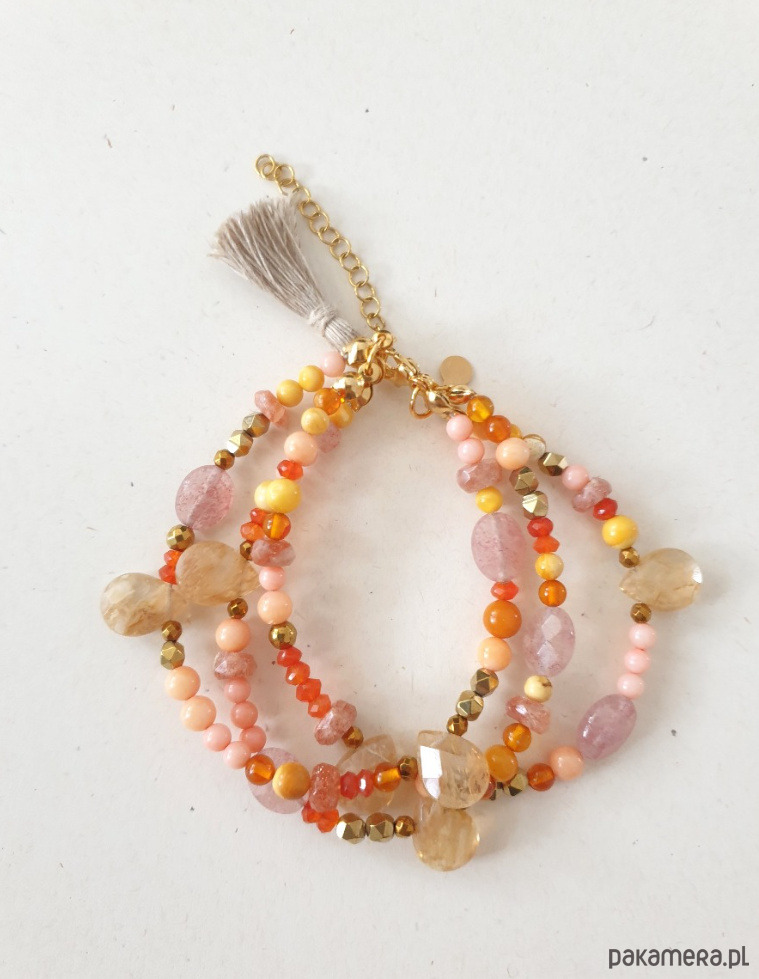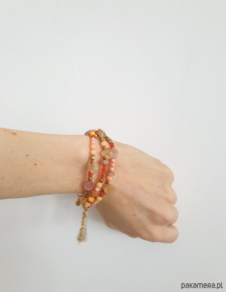 Autorska bransoletka z kolekcji TALIZMAN w stylu boho, etnicznym.Tworzona ręcznie z kamieni naturalnych, elementów ze stali szlachetnej (antyalergicznej) tu w kolorze złotym z lnianym chwostem. W kolorach pomarańczowym, żółtym, różowym. W tej kamienie: koral różowy,hematyt złoty, kamień słoneczny, karneol, żółty kalcyt (łezki) Pojedyncze egzemplarze ale można zamówić w podobnym charakterze i kolorze.