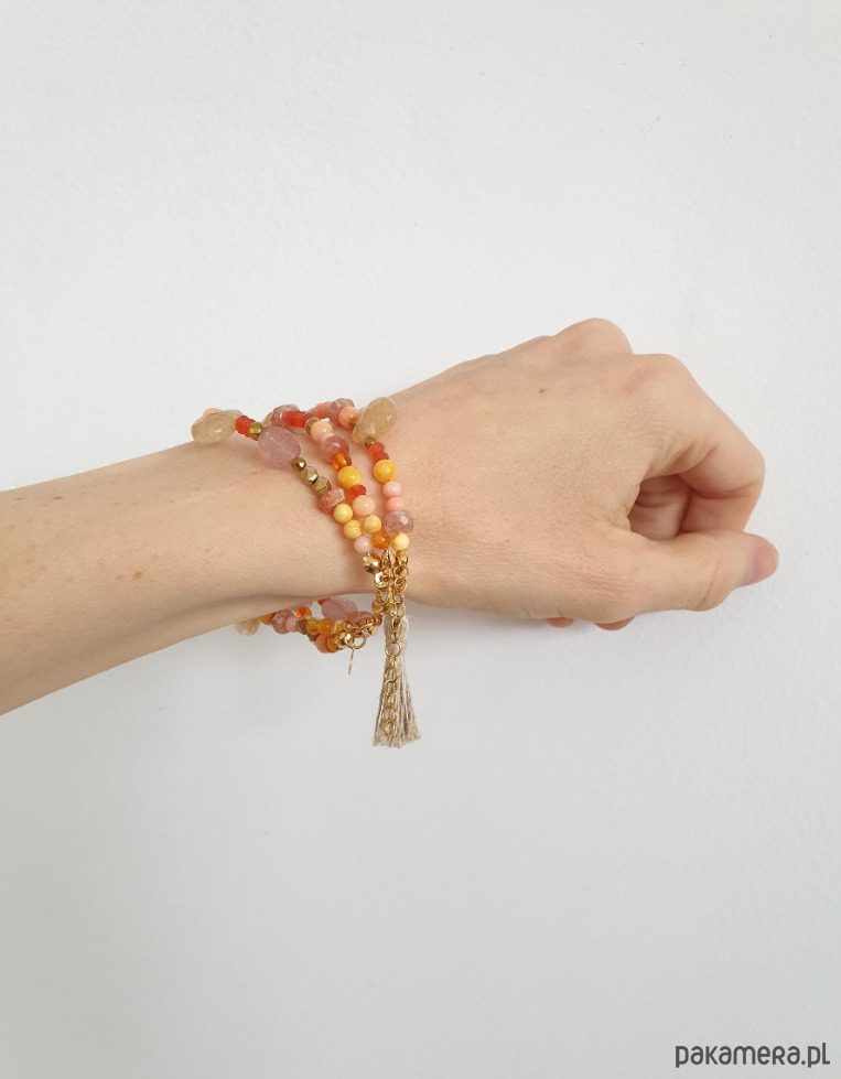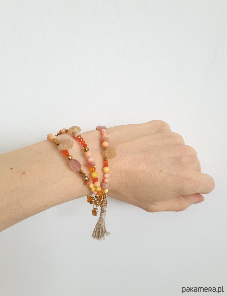 Autorska bransoletka z kolekcji TALIZMAN w stylu boho, etnicznym.Tworzona ręcznie z kamieni naturalnych, elementów ze stali szlachetnej (antyalergicznej) tu w kolorze złotym z lnianym chwostem. W kolorach pomarańczowym, żółtym, różowym. W tej kamienie: koral różowy,hematyt złoty, kamień słoneczny, karneol, żółty kalcyt (łezki) Pojedyncze egzemplarze ale można zamówić w podobnym charakterze i kolorze.
