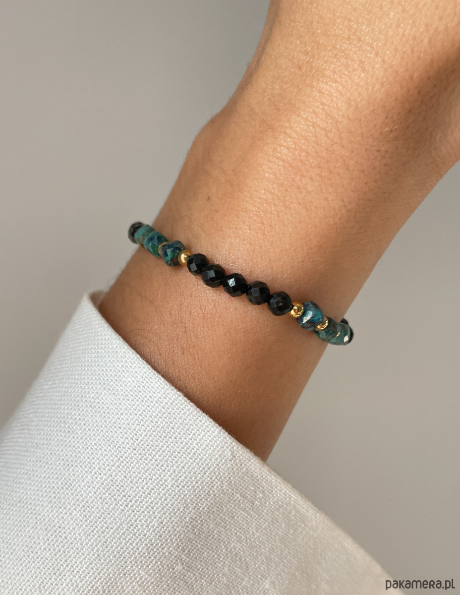 Wyrazista, a jednocześnie harmonijna bransoletka wykonana z naturalnych kamieni: czarnego turmalinu, turkusu afrykańskiego oraz złotych akcentów z hematytu. To talizman stworzony dla osób, które chcą czuć się bezpiecznie, pewnie i odważnie w codziennych wyzwaniach. Połączenie głębokiej czerni z odcieniami zieleni i złota nadaje biżuterii elegancki, a zarazem energetyczny charakter.