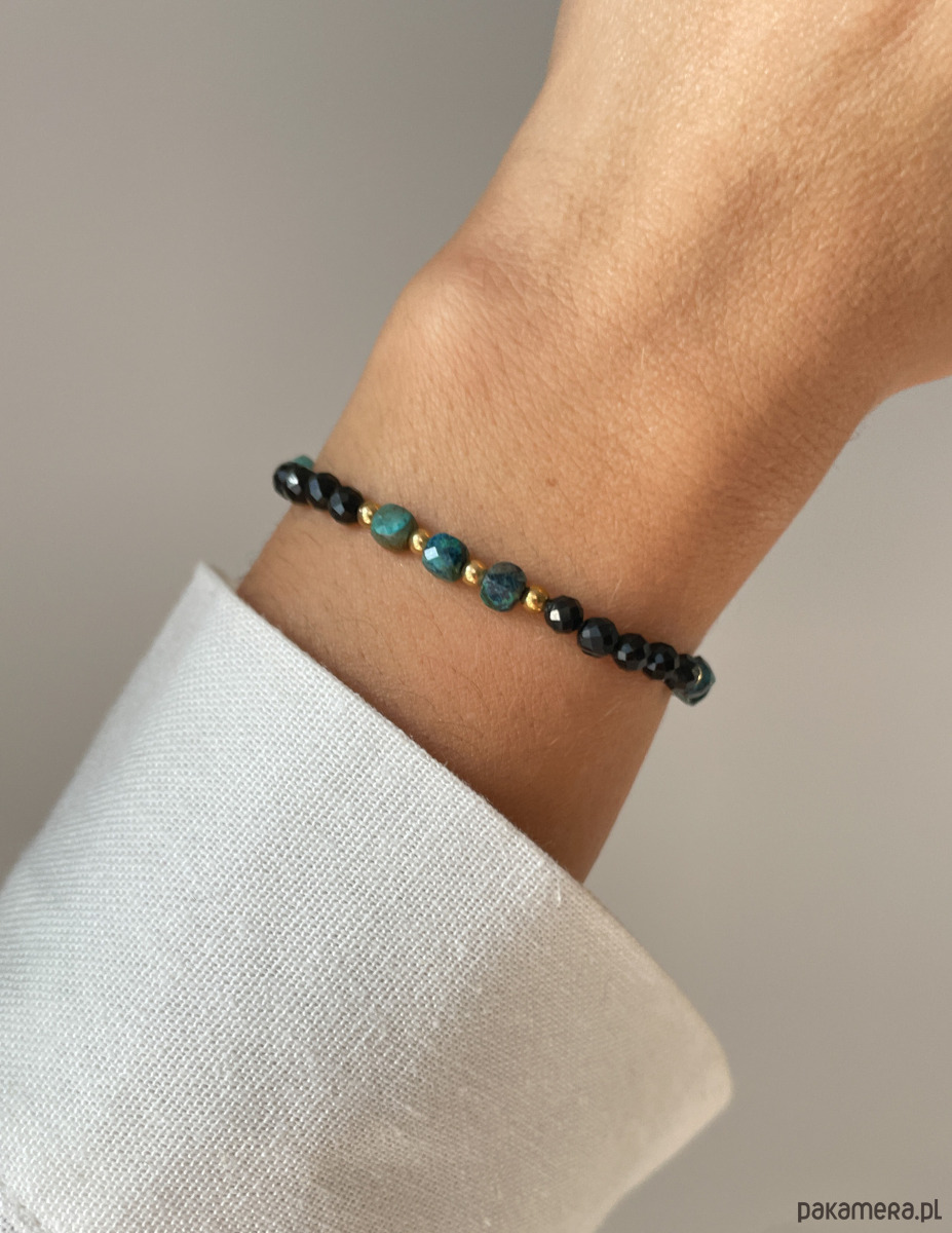 Cechy bransoletki:Kamień: turkus afrykański, hematyt (kolor złoty)Wielkość kamieni: turkus afrykański, czarny turmalin ok. 4 mm Wielkość kamienia hematyt: ok. 3 mm Kolor: zielony, czarny, złoty Materiał: wytrzymała elastyczna żyłka jubilerska