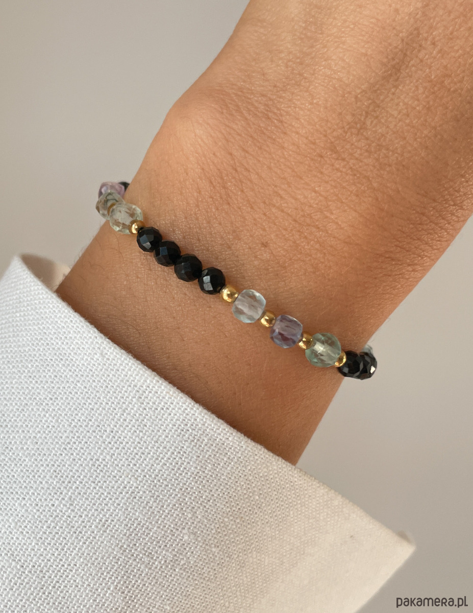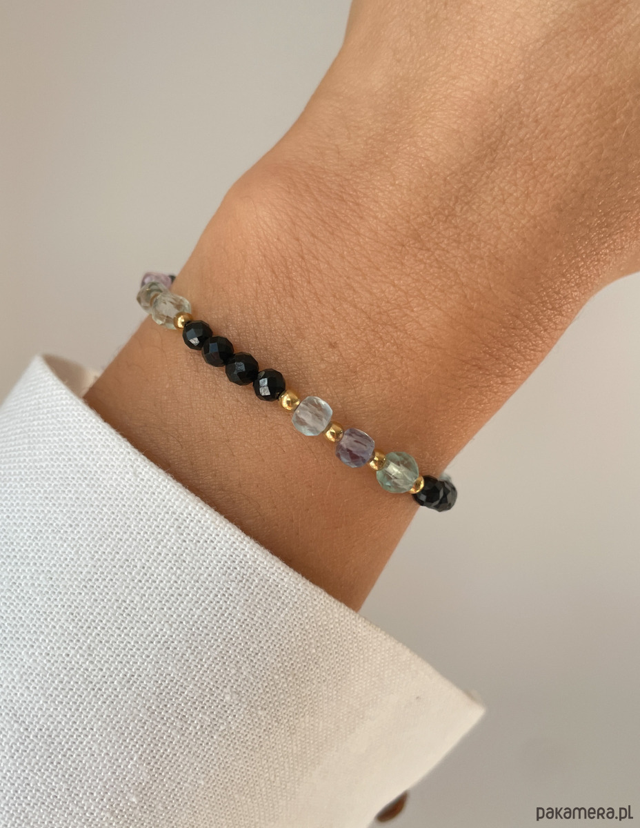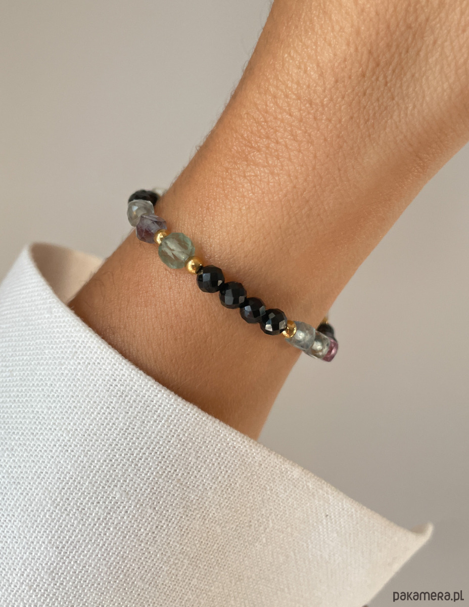 Ta bransoletka to fascynujące połączenie głębokiej ochrony z energią jasności umysłu. Wielobarwny Fluoryt, mieniący się odcieniami fioletu i zieleni, tworzy intrygujący kontrast z czernią Turmalinu, a złote akcenty dodają całości wyrafinowanego blasku.