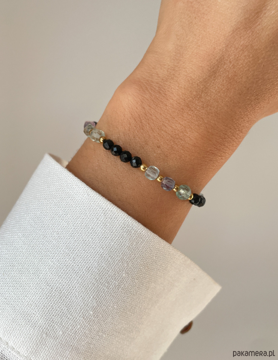 Bransoletka wykonana jest na wytrzymałej, elastycznej żyłce jubilerskiej, co zapewnia komfort noszenia i idealne dopasowanie. Kompozycja bazuje na kamieniach o wielkości ok. 4 mm (Czarny Turmalin i Fluoryt), które są subtelnie rozdzielone złotymi kuleczkami Hematytu (ok. 3 mm). To biżuteria, która przyciąga wzrok swoją kolorystyką i niesie ze sobą spokój oraz wsparcie dla intuicji.