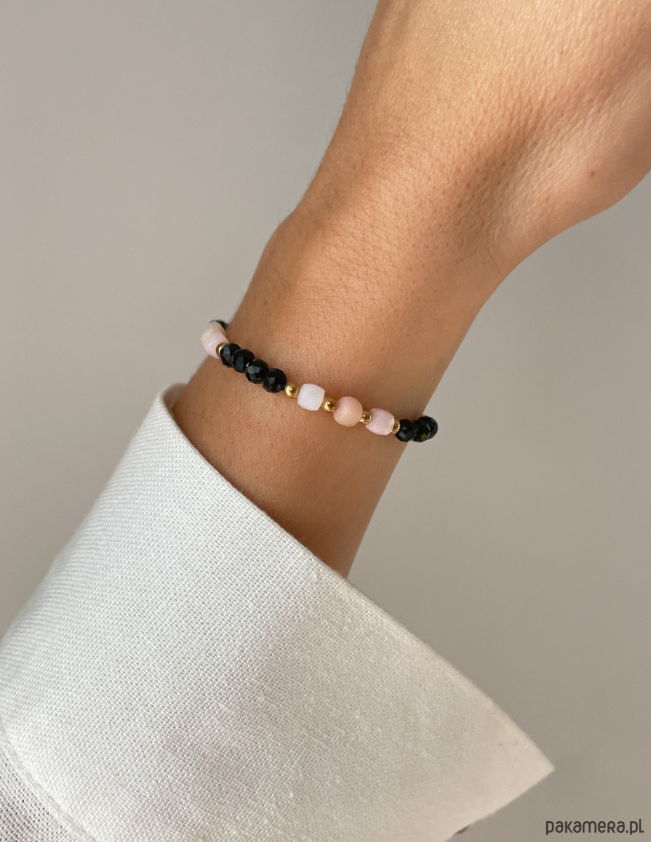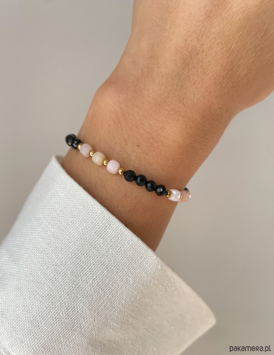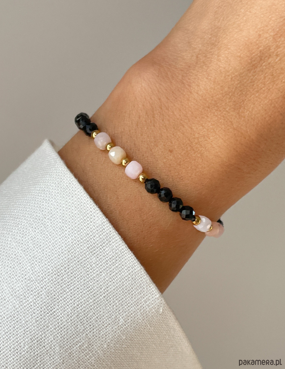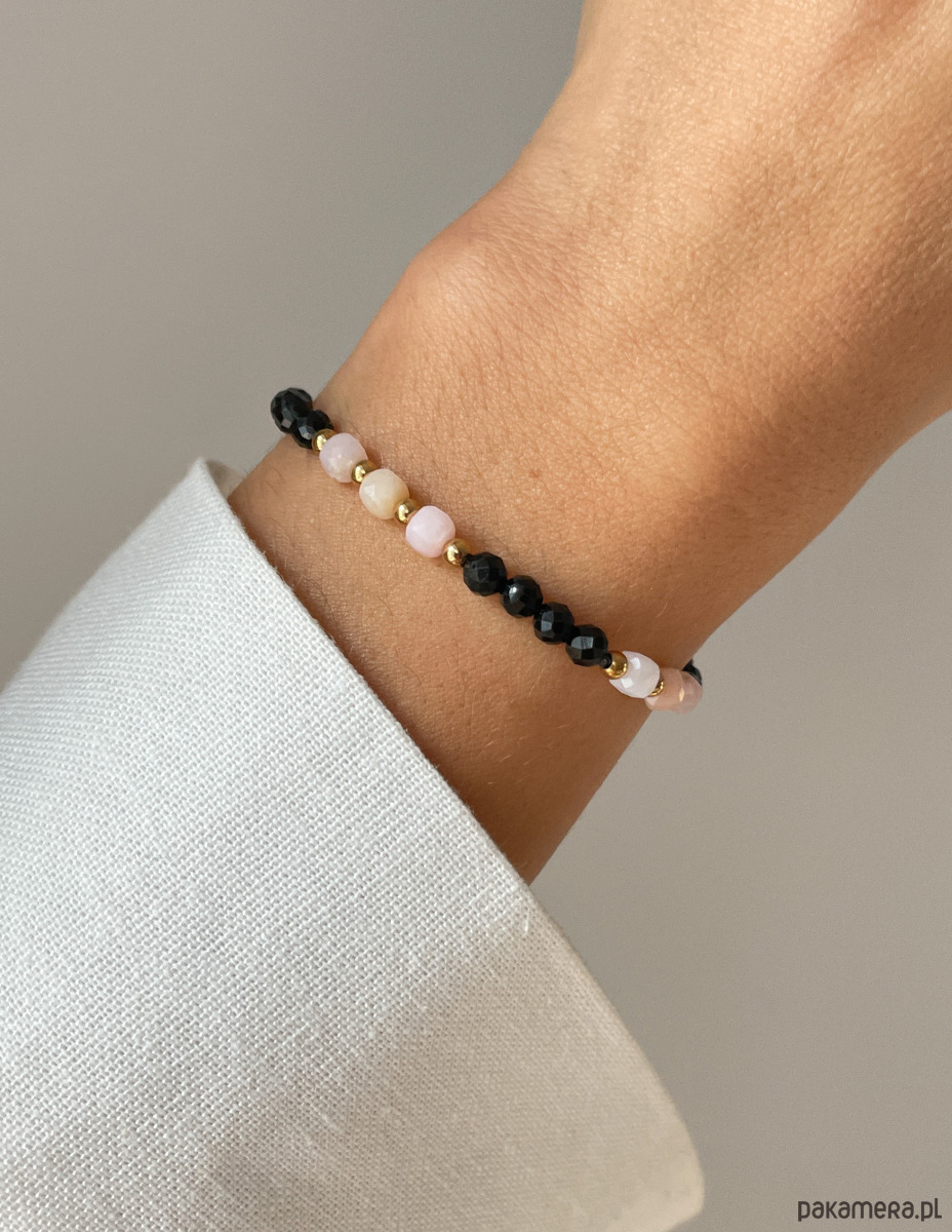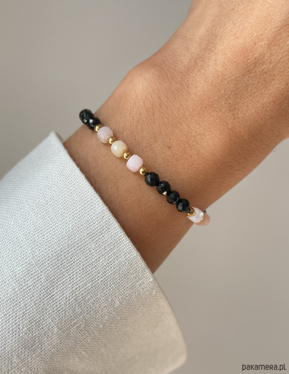 Cechy bransoletki:Kamień: czarny turmalin, opal, hematyt (kolor złoty)Wielkość kamieni: czarny turmalin, opal ok. 4 mm Wielkość kamienia hematyt: ok. 3 mm Kolor: czarny, pudrowy róż, złoty Materiał: wytrzymała elastyczna żyłka jubilerska