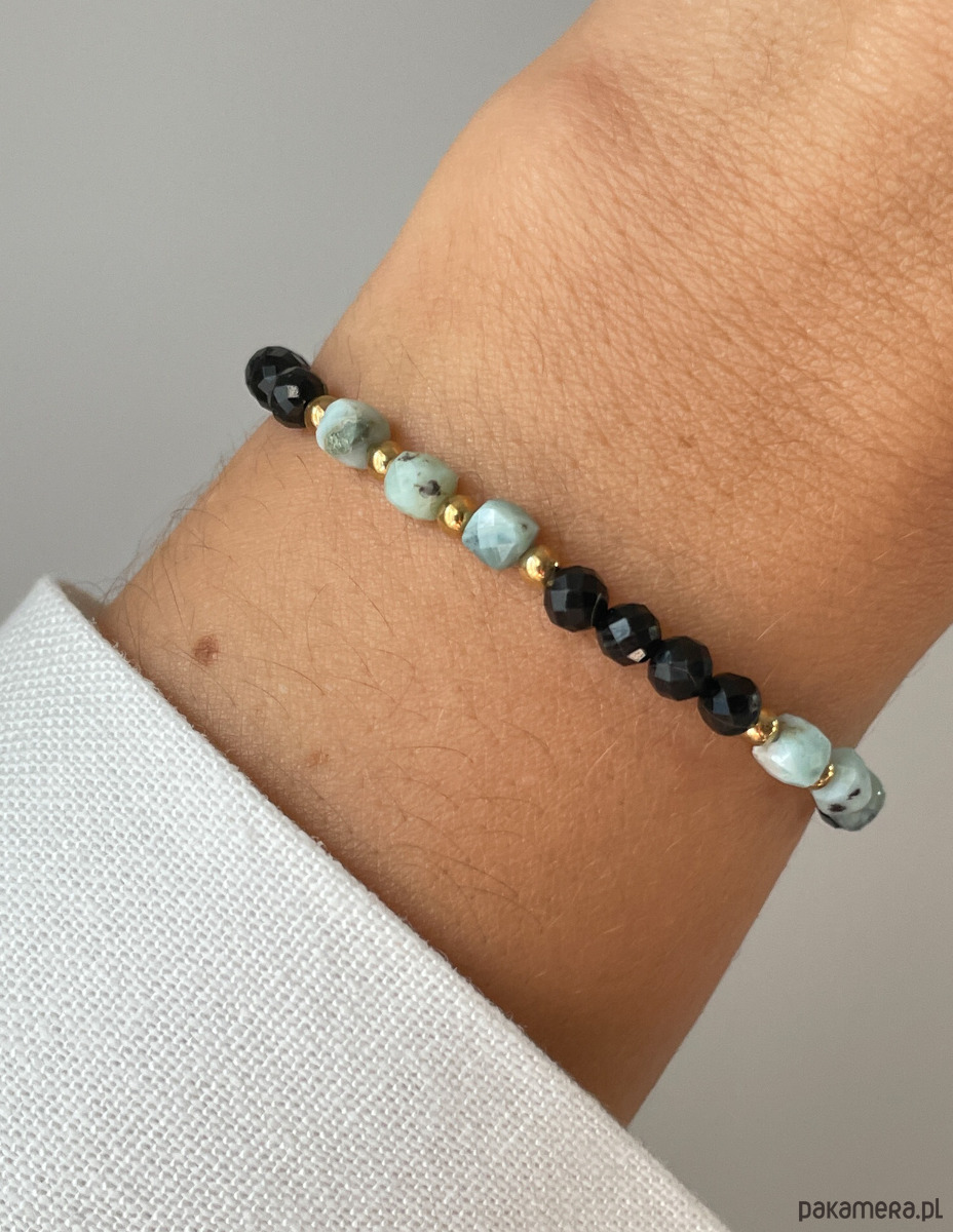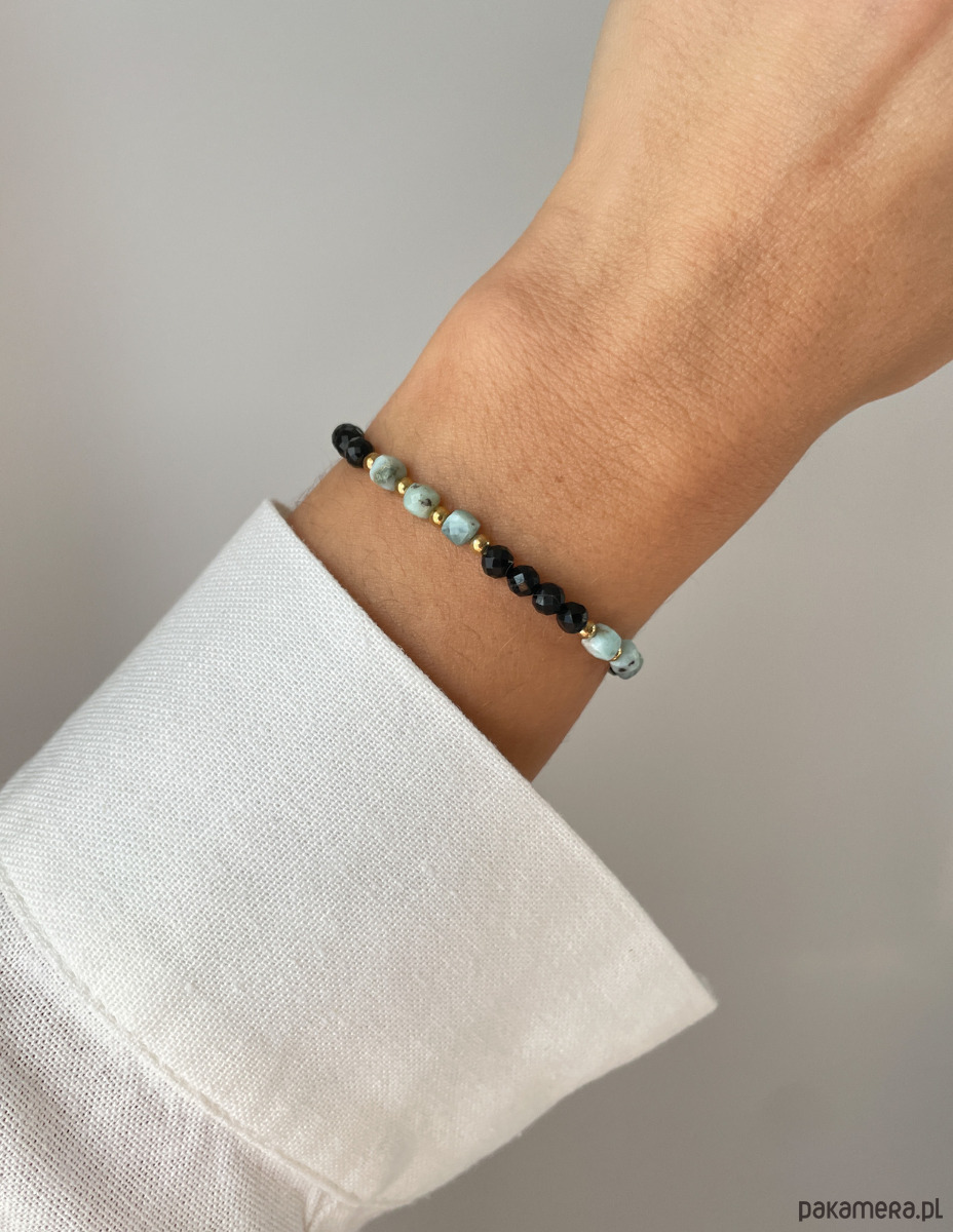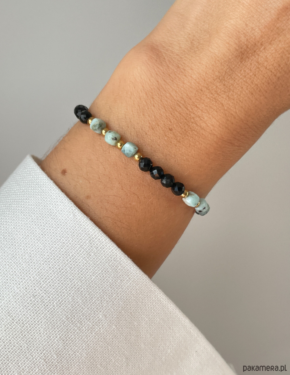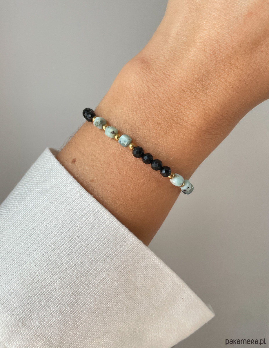 Cechy bransoletki:Kamienie: czarny turmalin, larimar, hematyt (kolor złoty)Wielkość kamieni: czarny turmalin, larimar ok. 4 mm Wielkość kamienia hematyt: ok. 3 mm Kolor: czarny, morski, seledynowy, złoty