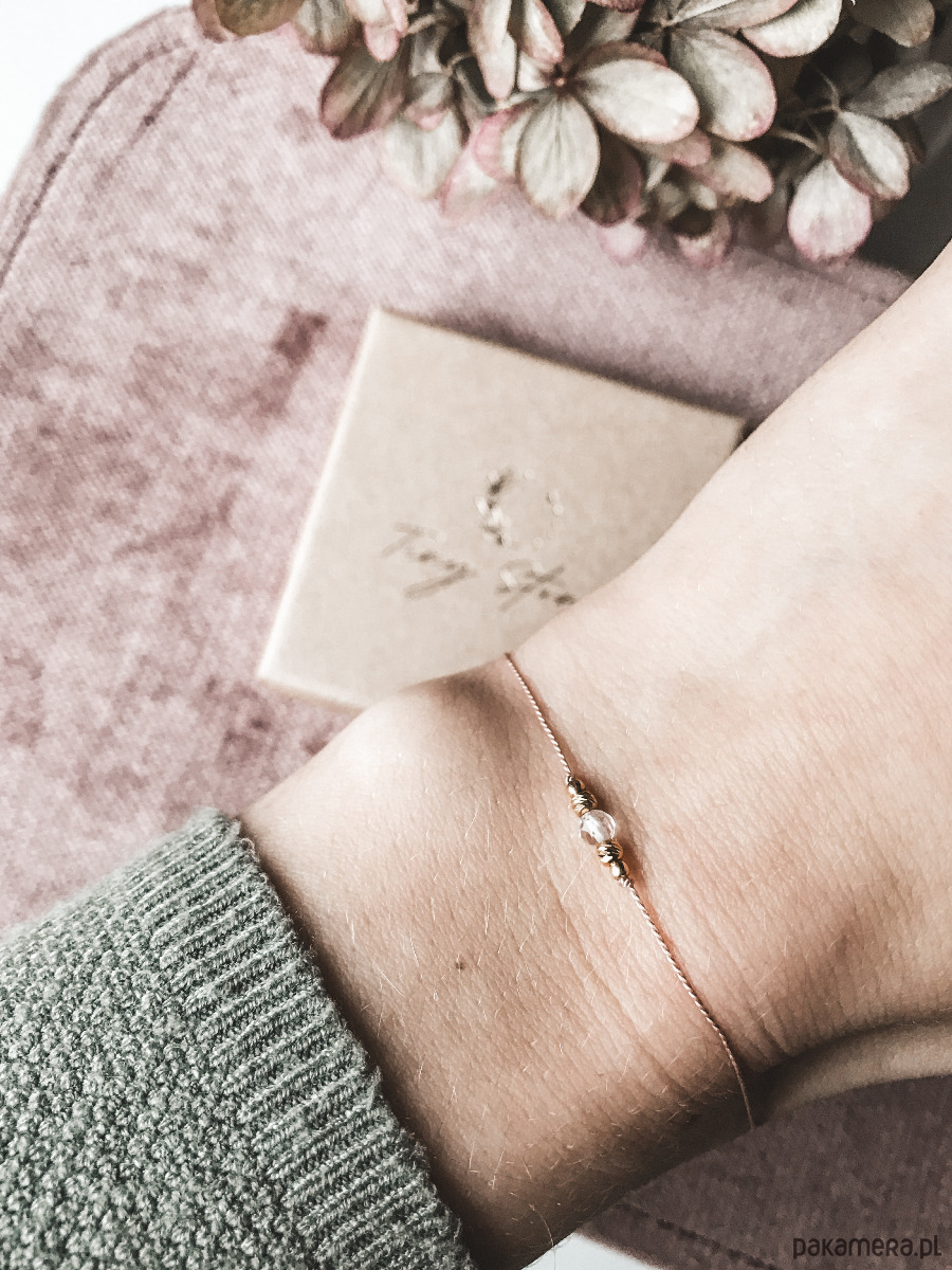 Ręcznie robiona bransoletka wykonana na jedwabnej nici z kamieni kryształu górskiego oraz srebrnych koralików próby 925 pozłacanych 24K złotem. Piękny przezroczysty kryształ górski prezentuje się niezwykle delikatnie i minimalistycznie idealnie współgrając z różową, jedwabną nicią.
