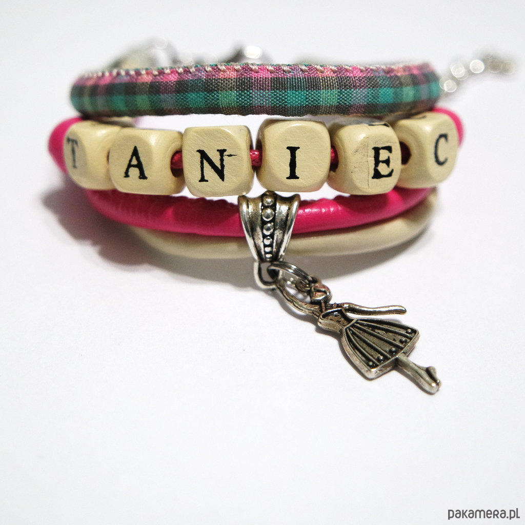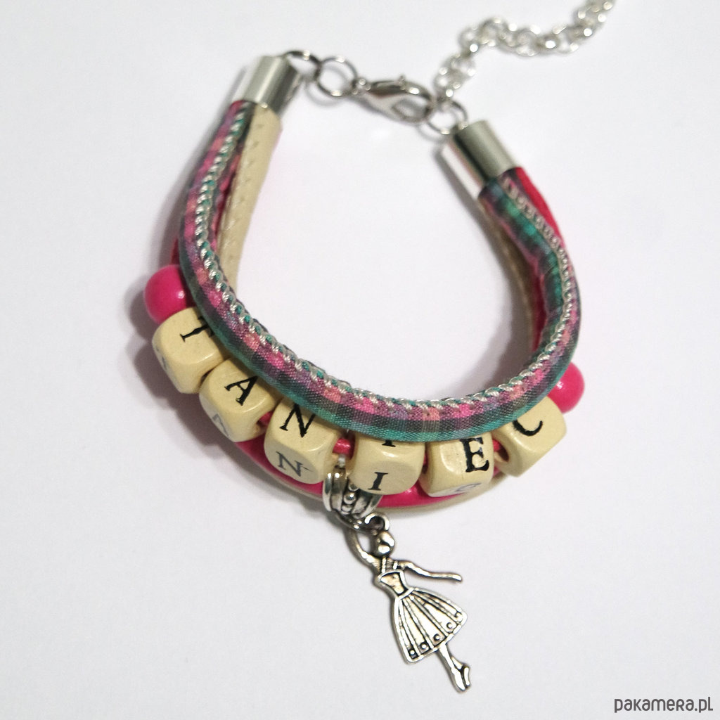 Bransoletka zrobiona jest z rzemieni ze skóry ekologicznej, materiału, sznurka oraz drewnianych koralików. Z napisem "Taniec".