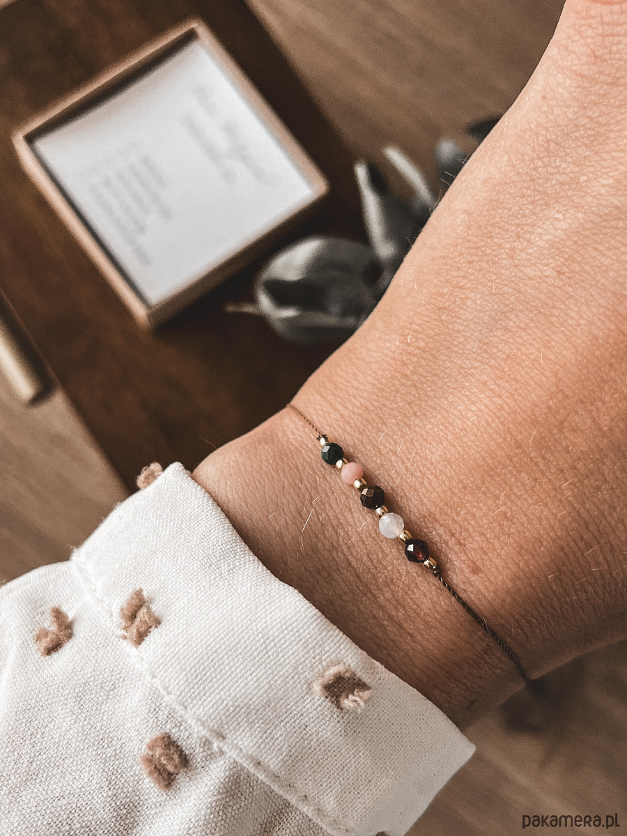 Bransoletka wykonana jest na wytrzymałej, nylonowej nici z różnorodnych kamieni naturalnych (granat, chalcedon, tygrysie oko, opal, malachit, wielkość kamieni ok. 3mm) oraz srebrnych koralików próby 925 pozłacanych 24K złotem.