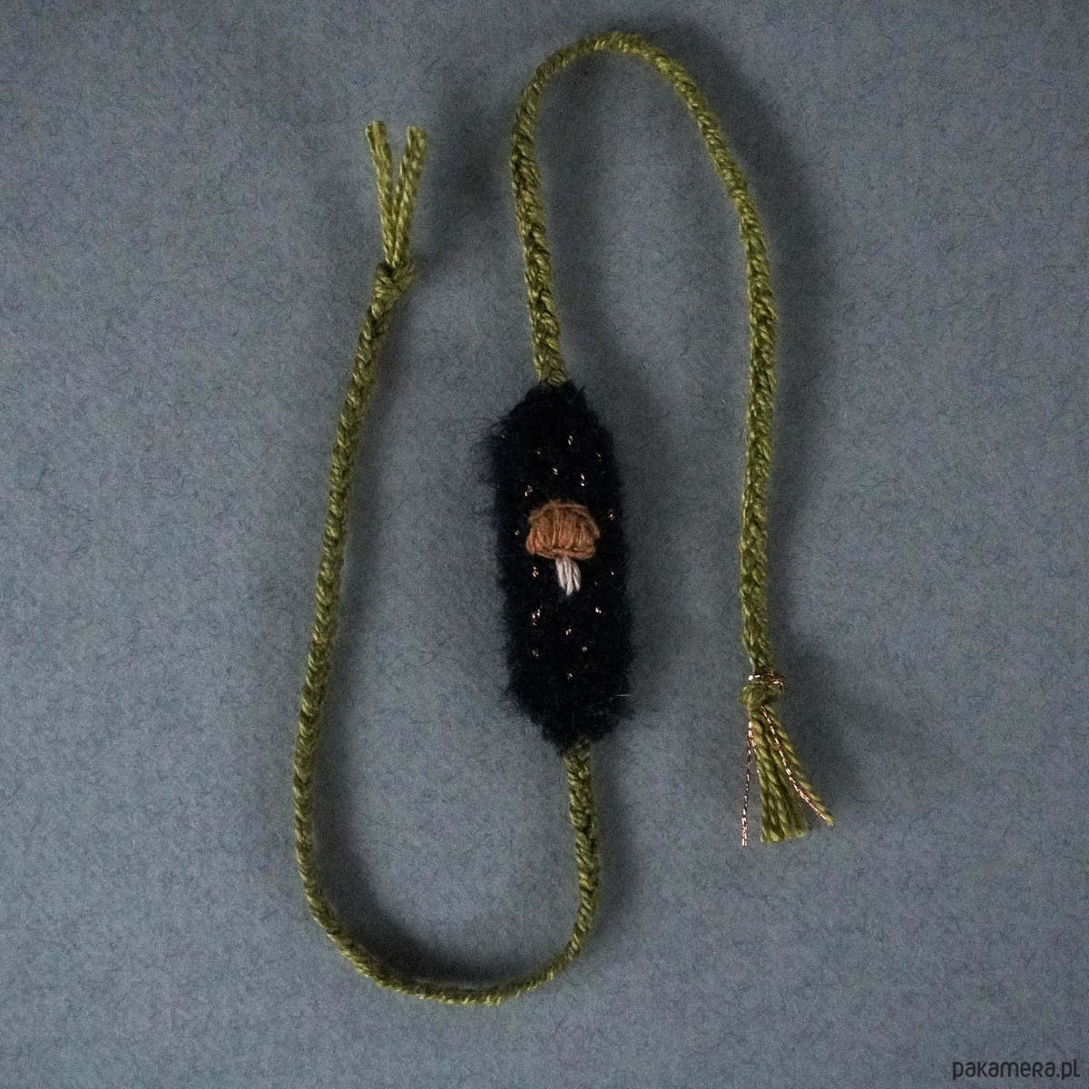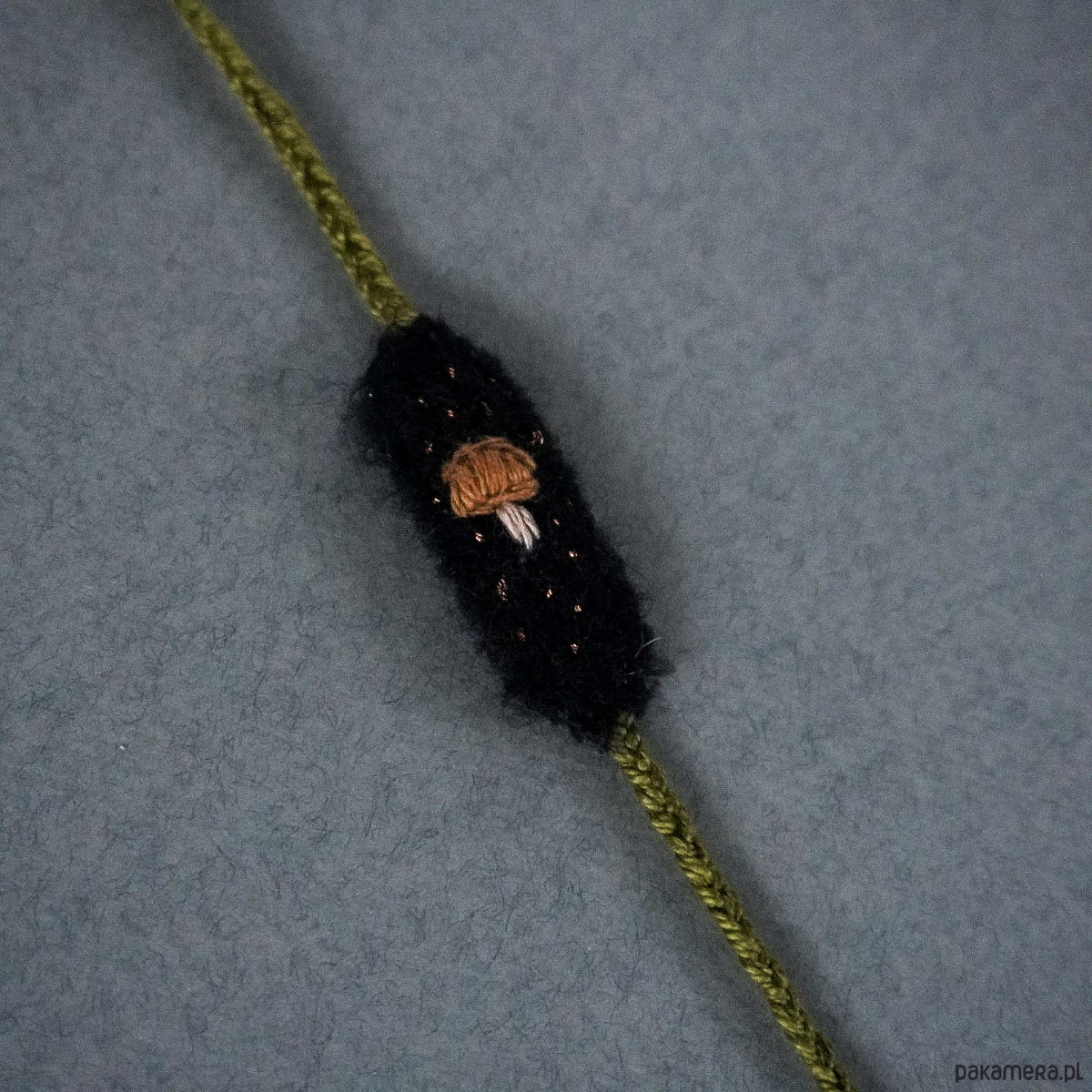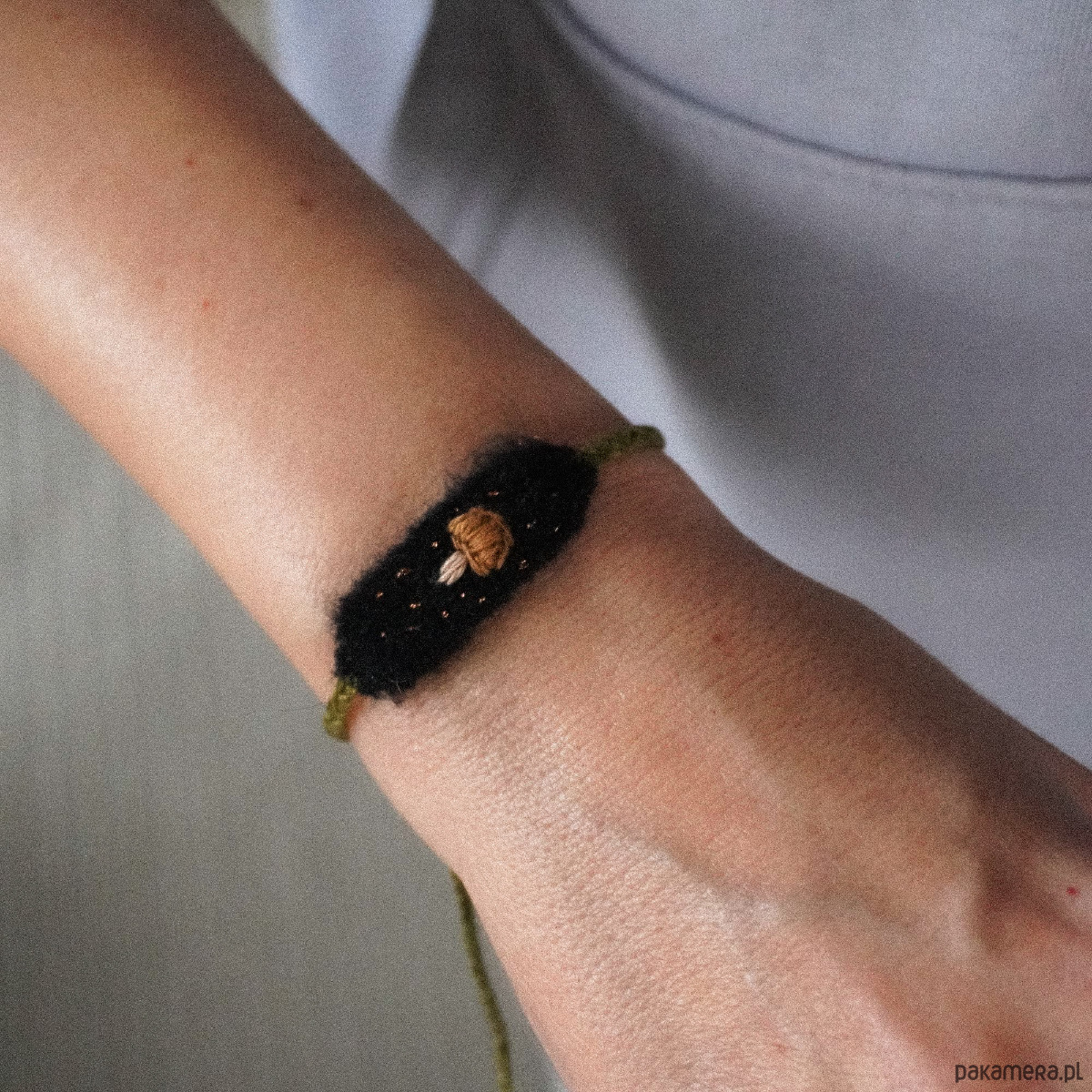 Uniaktowa bransoletka tkana i haftowana ręcznie z grzybkiem . To idealny dodatek dla jesieniary :)))Część tkana ma około 4 cm długości, około 1 cm szerokości. Bransoletkę wiążemy samodzielnie, dość mocno na supełek.