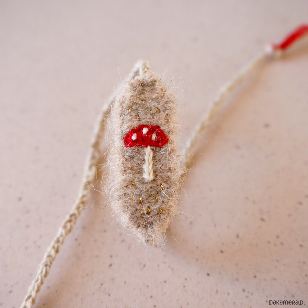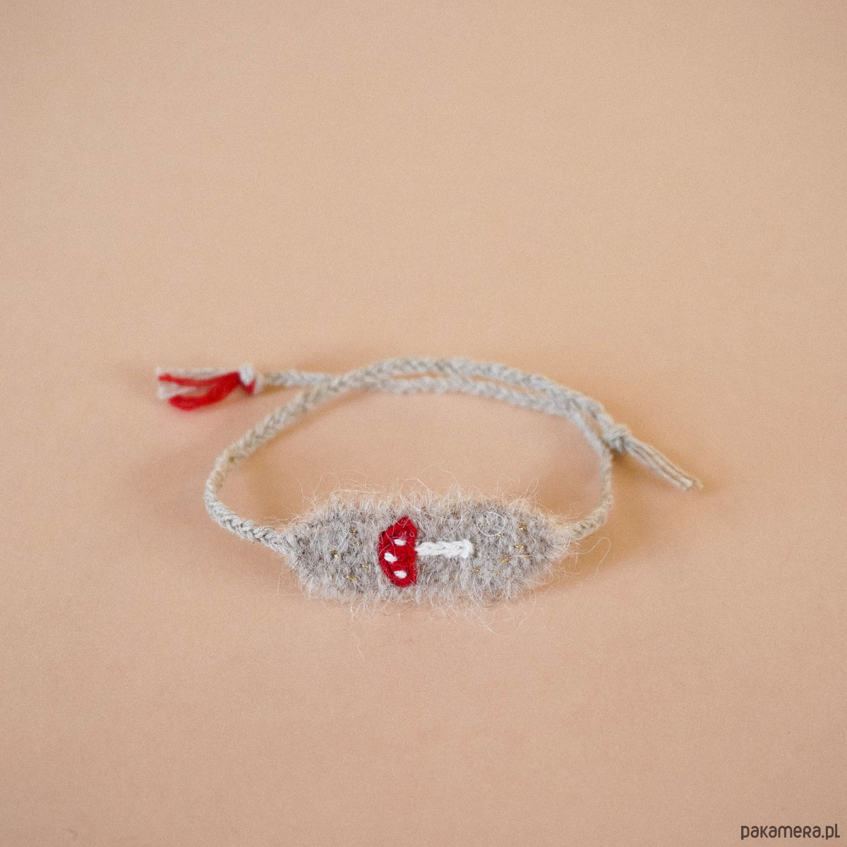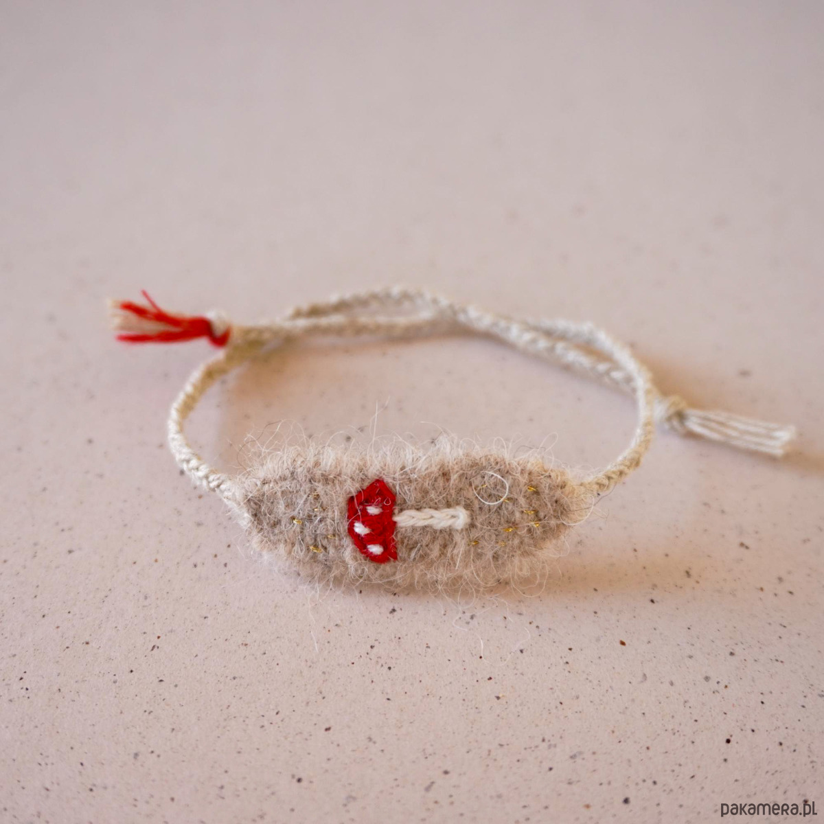 Uniaktowa bransoletka tkana i haftowana ręcznie z muchomorkiem . To idealny dodatek dla jesieniary :))) Część tkana ma około 4 cm długości, około 1 cm szerokości. Bransoletkę wiążemy samodzielnie, dość mocno na supełek.