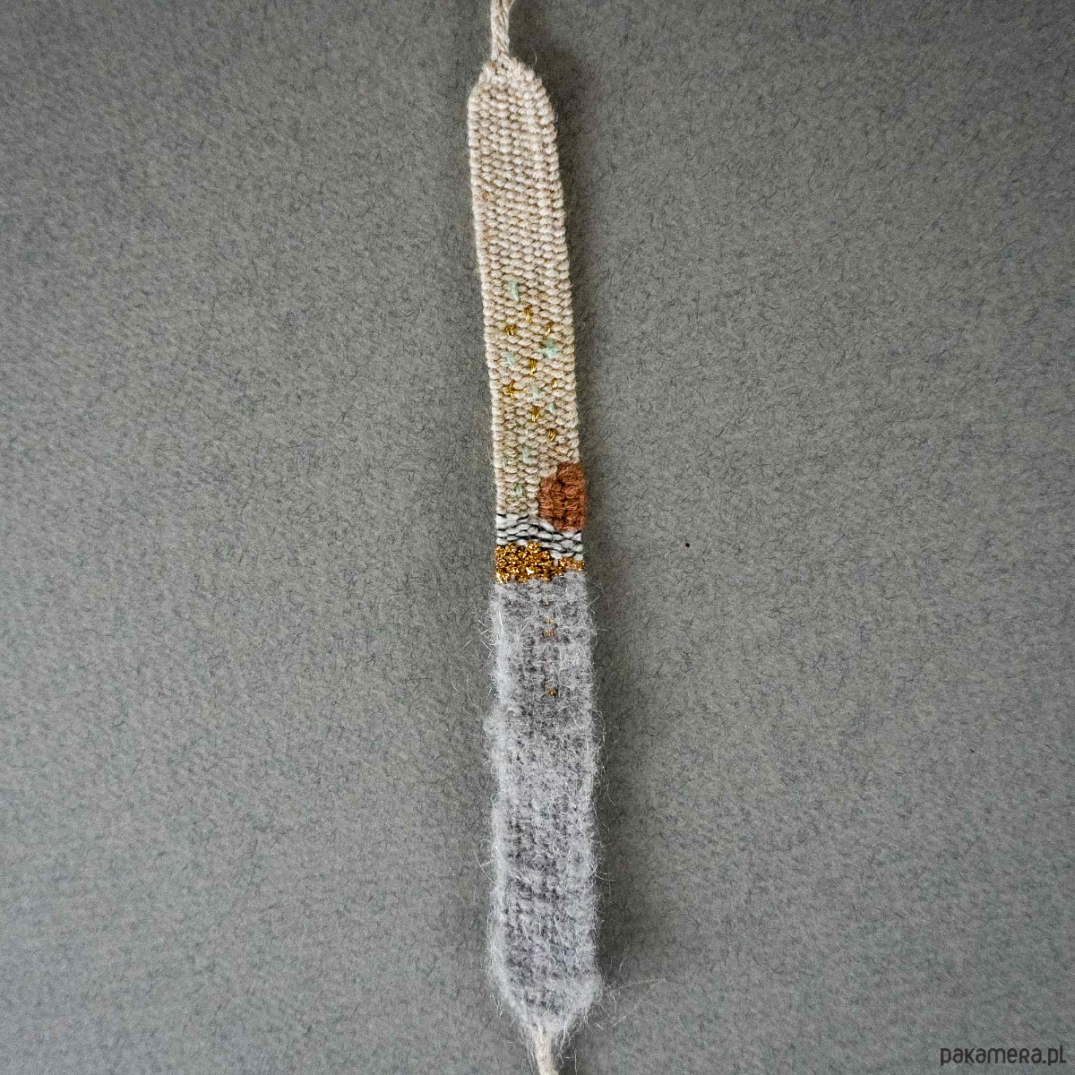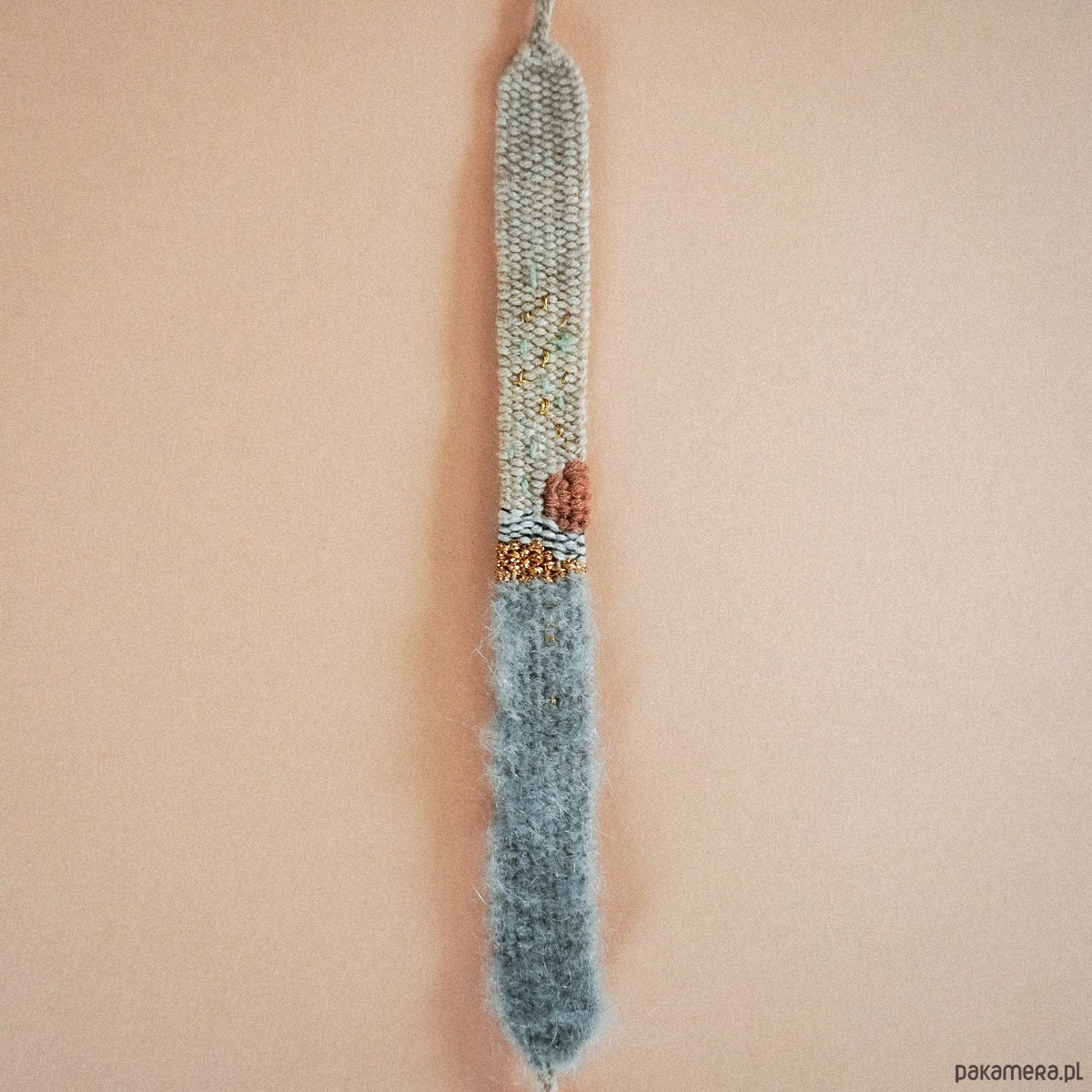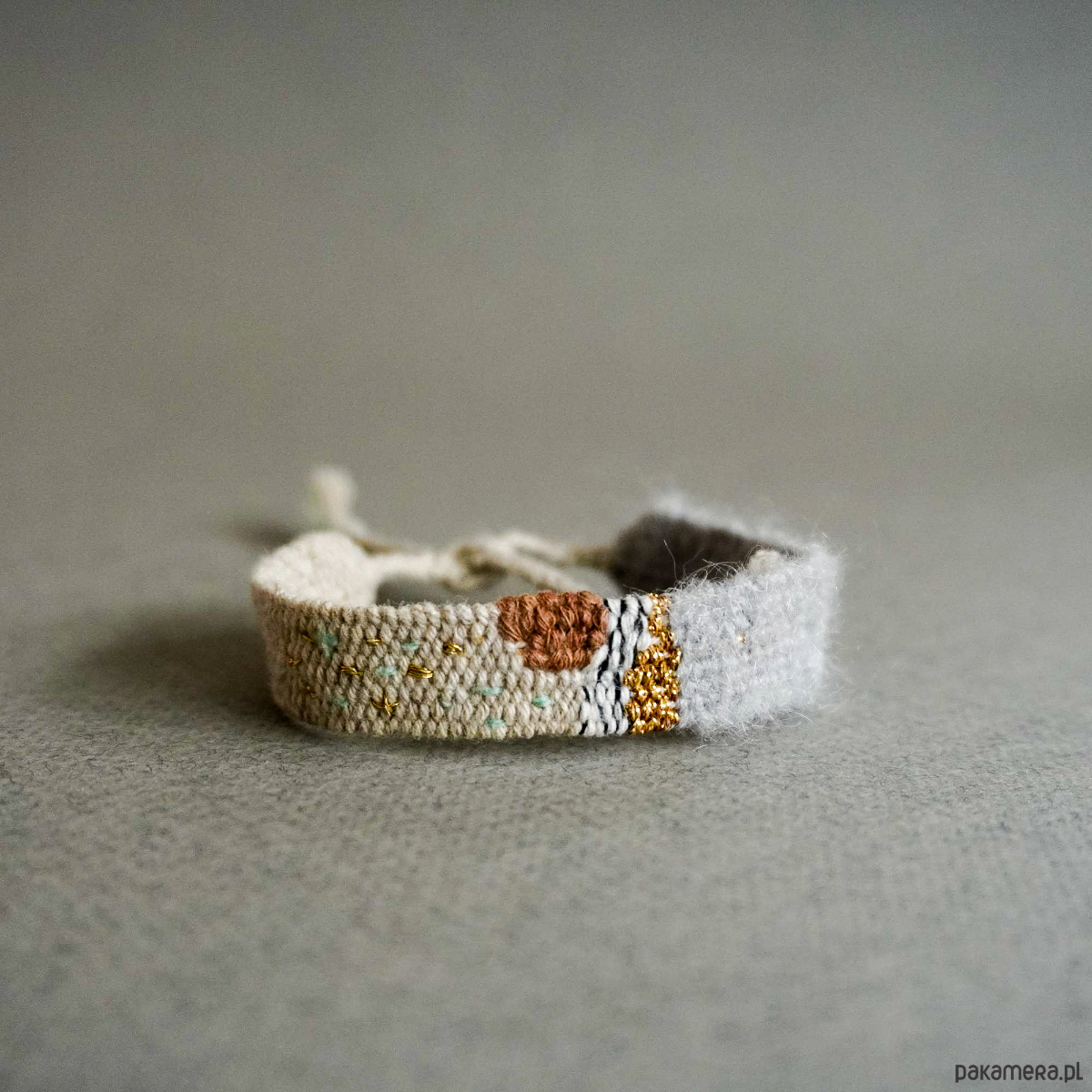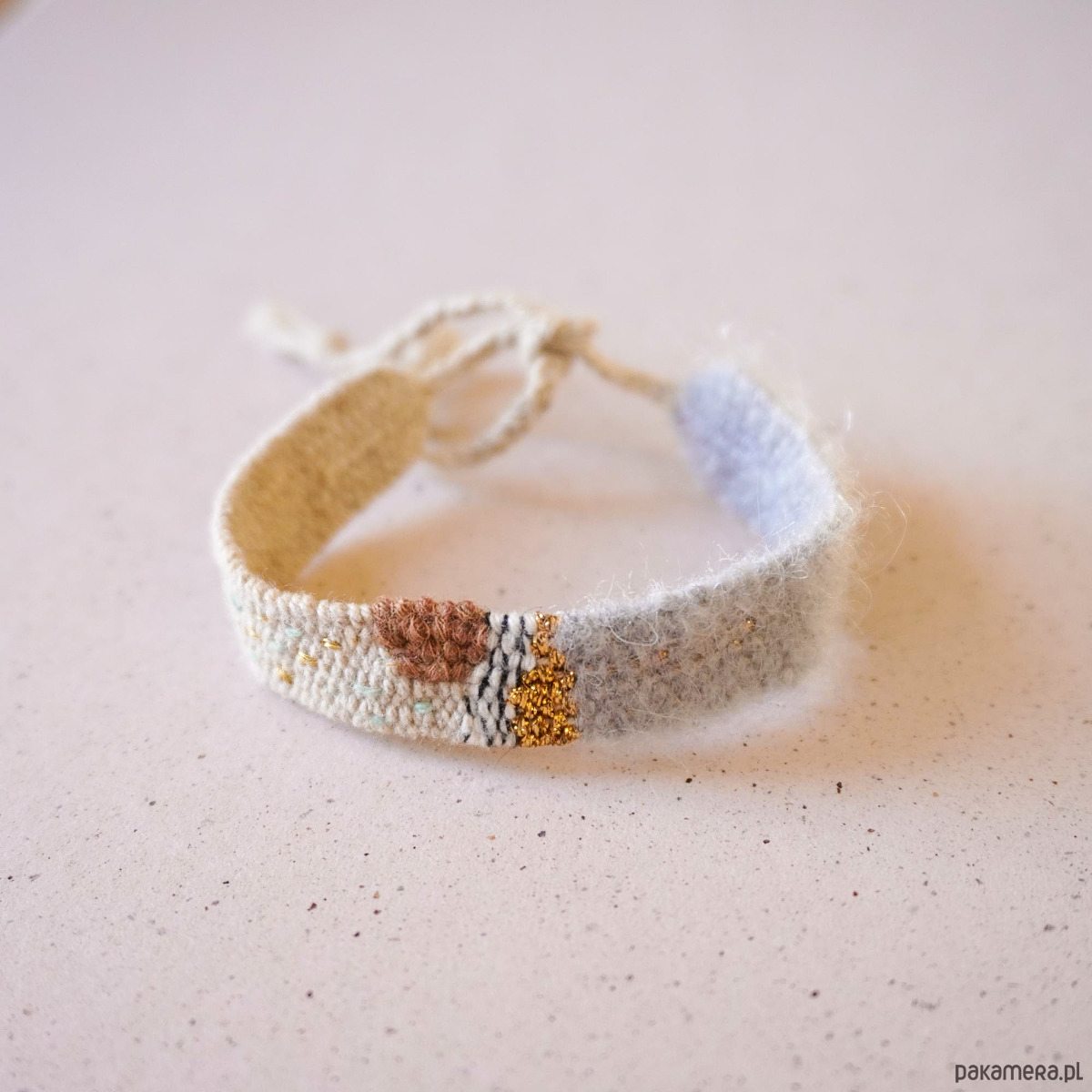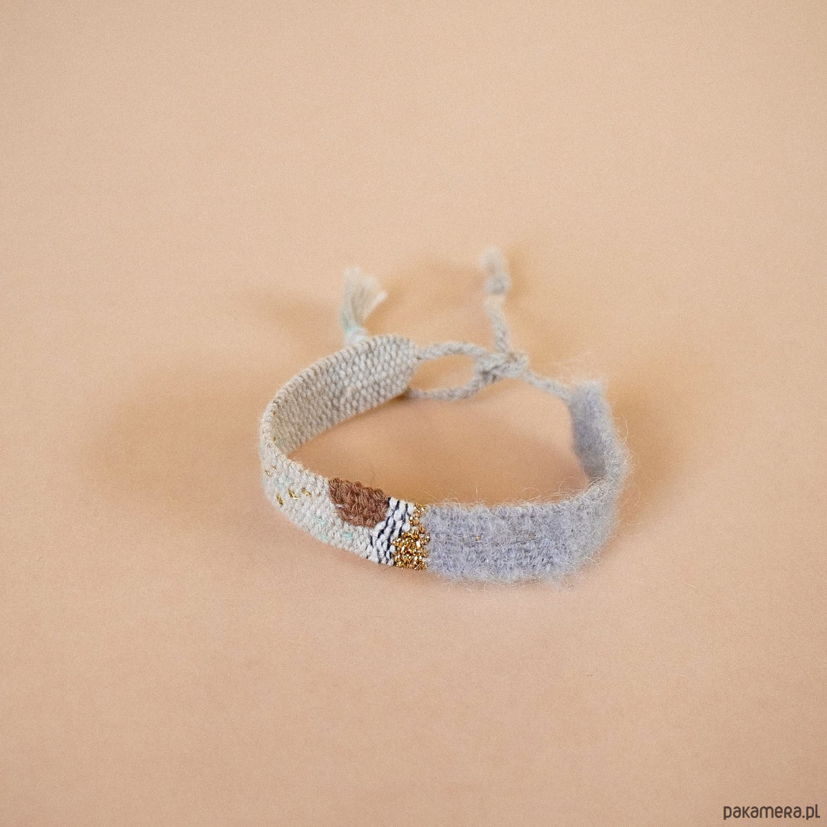 Prześliczna bransoletka tkana na krośnie w stonowanych, pastelowych kolorach. Mi osobiście kojarzy się ze stylem marynarskim. Szerokość 1 do 1,5 cm. Długość części tkanej 14,15 cm plus sznureczki do samodzielnego wiązania na supełek (należy go mocno zawiązać). Polecam serdecznie ♡