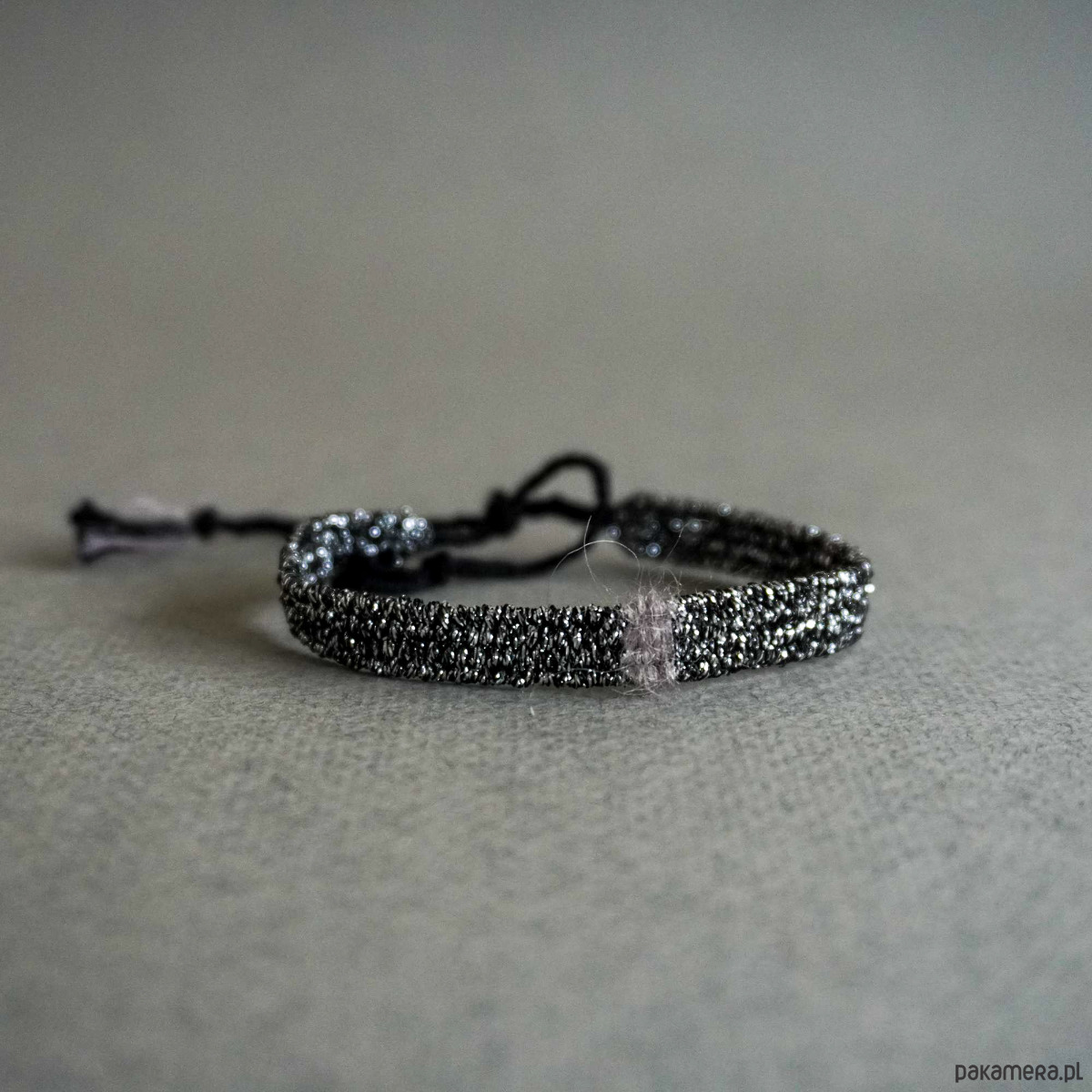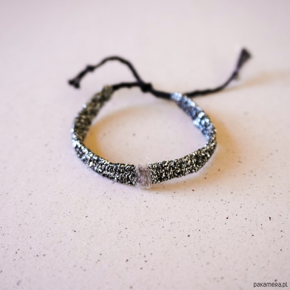Absolutnie przepiekna, wyjątkowa bransoletka wykonana na krośnie, utkana z metalizowanej, błyszczącej nici w odcieniu ciemnego srebra i szarą kreseczką (mieszanka z moherem). Ten model jest bardzo neutralny i pięknie komponuje się z różnymi zestawami biżuterii.