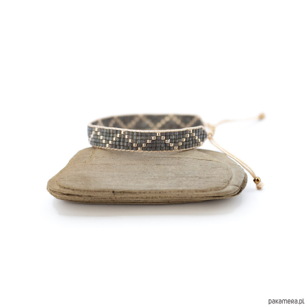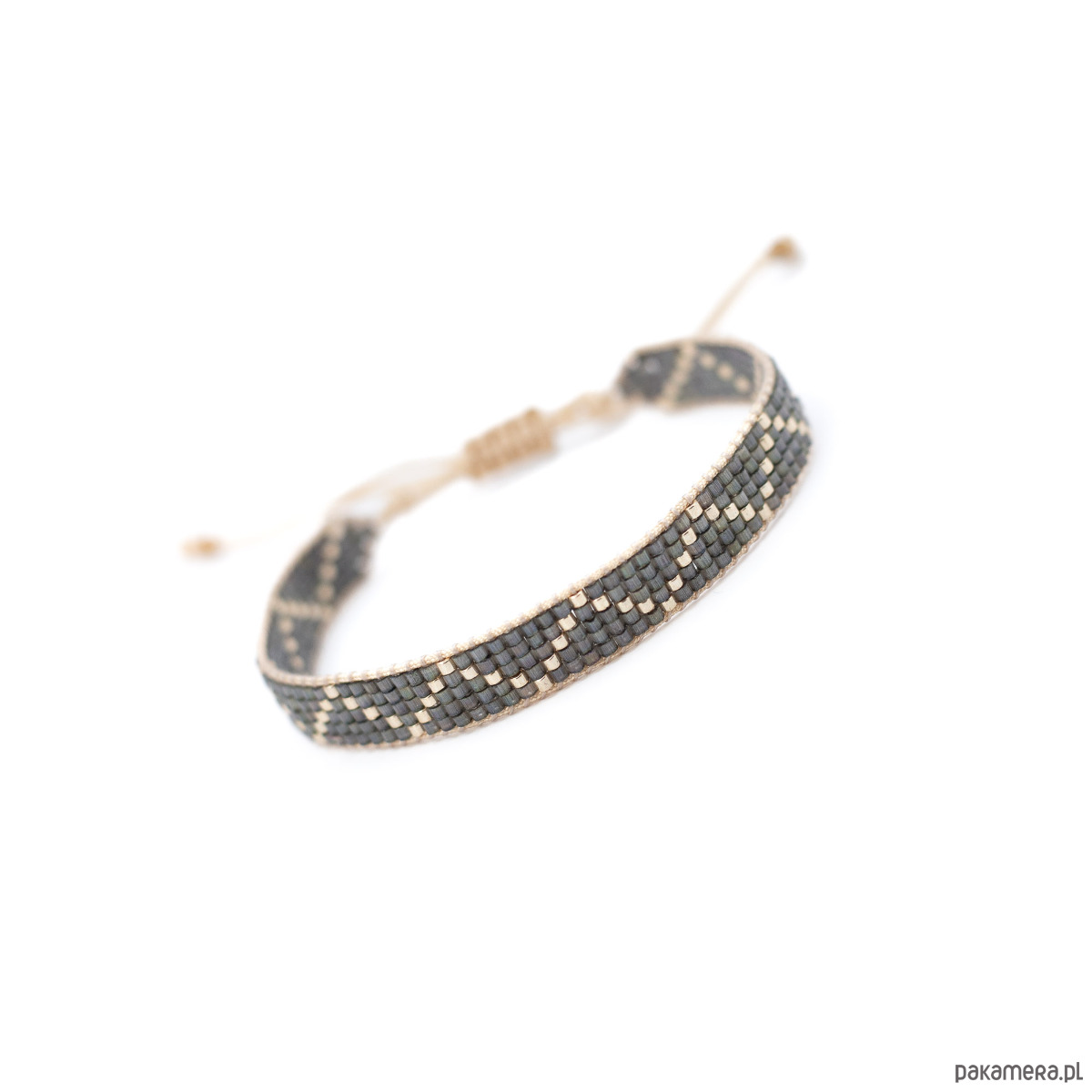 Bransoletka wykonana z koralików szklanych Miyuki Delica oraz nici i sznurka nylonowego. Kolory: półprzeźroczysty, zmrożony grafitowy, jasne złoto.