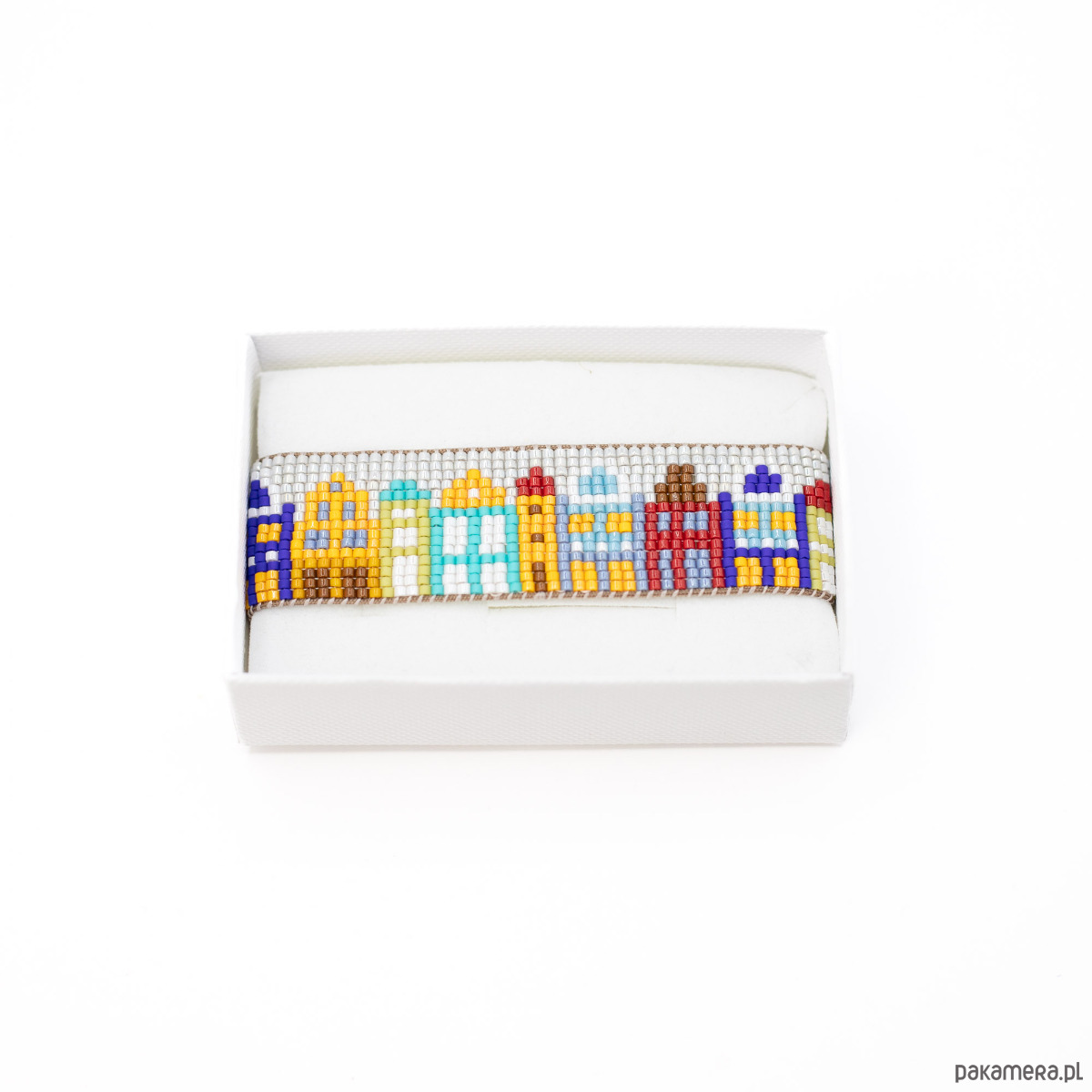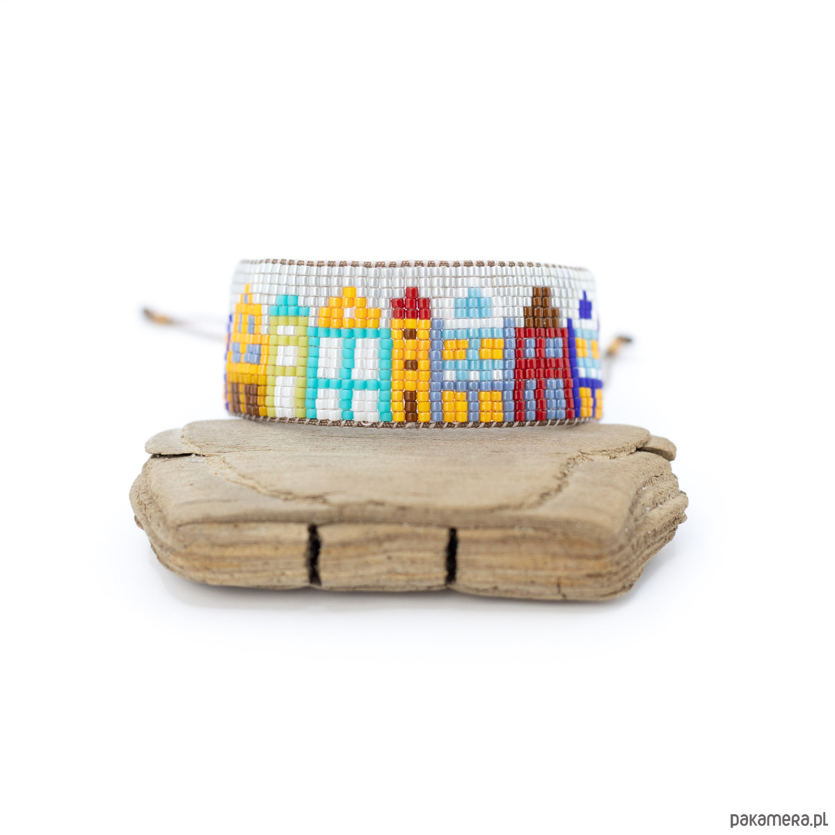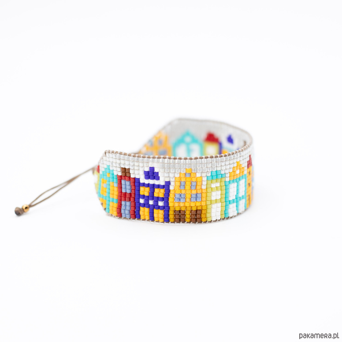 Bransoletka wykonana z koralików szklanych Miyuki Delica oraz nici i sznurka nylonowego. Inspirowana kolorowymi kamieniczkami polskich miast i pięknych, zabytkowych ryneczków. Niebo w kolorze jasnopopielatym.