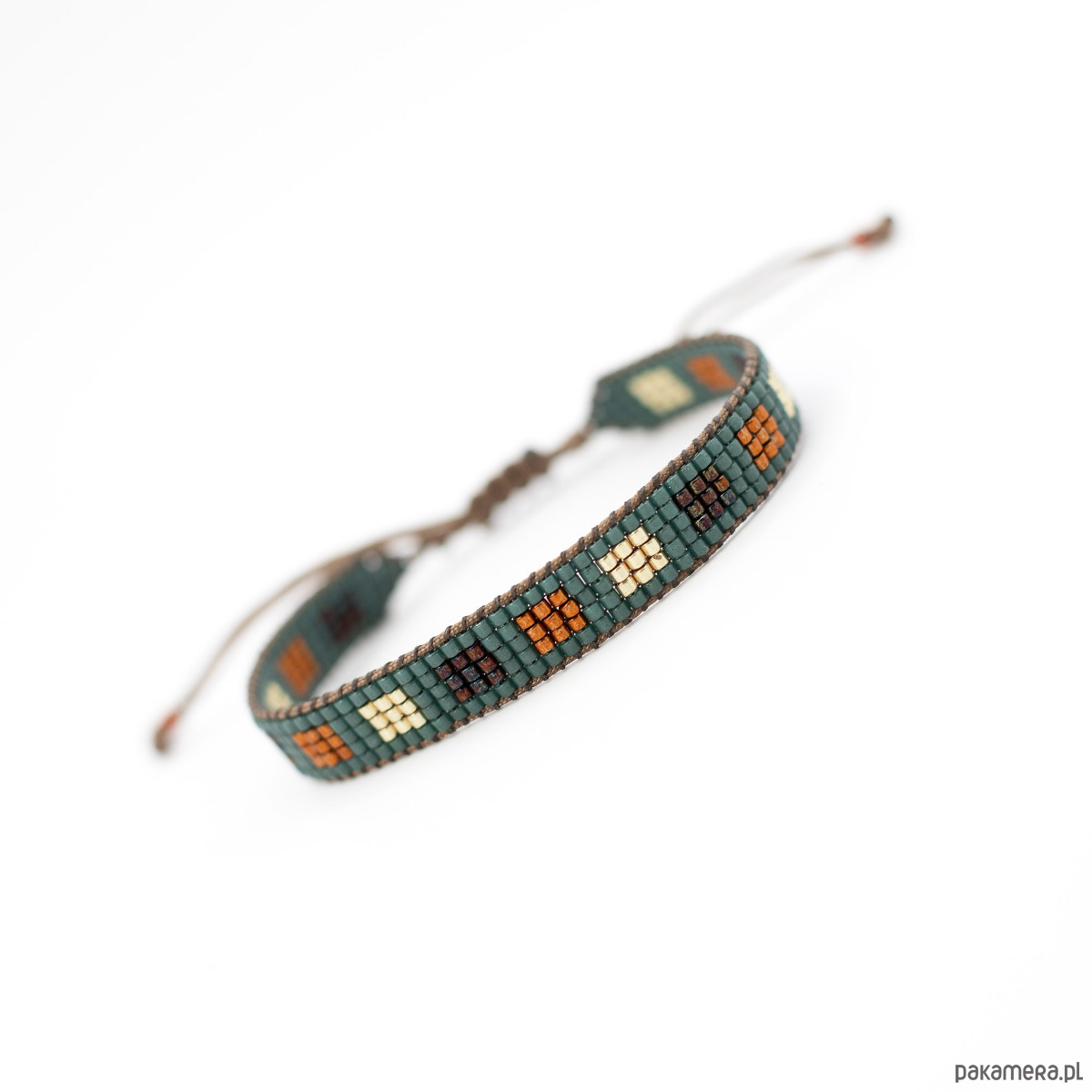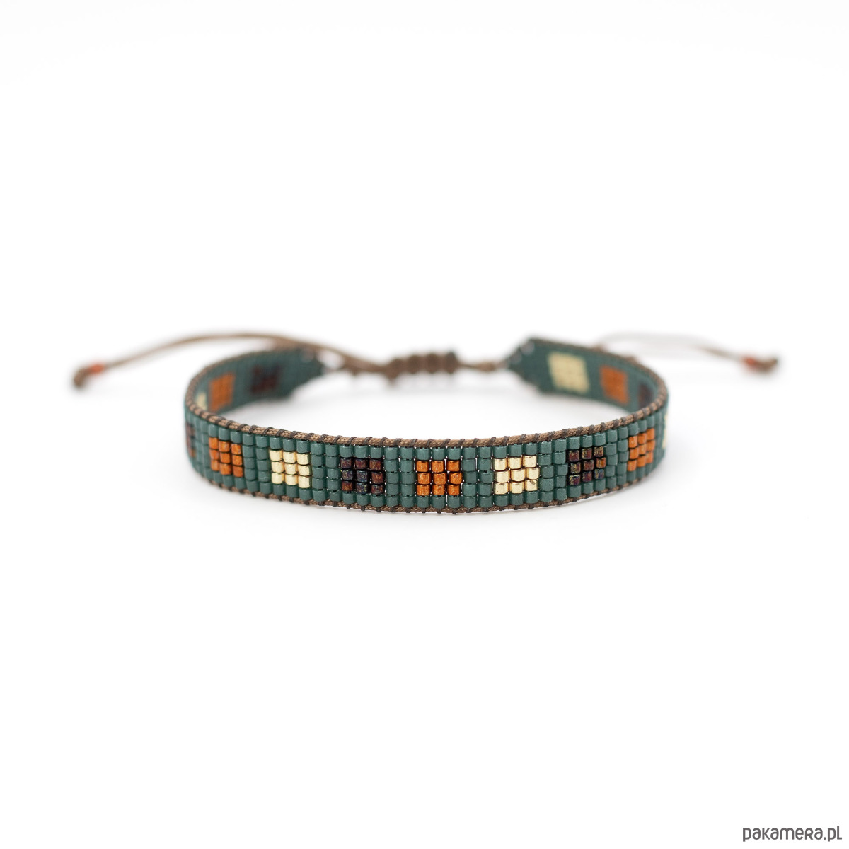 Bransoletka tkana z koralików - kolorowe kwadraty z zielenią