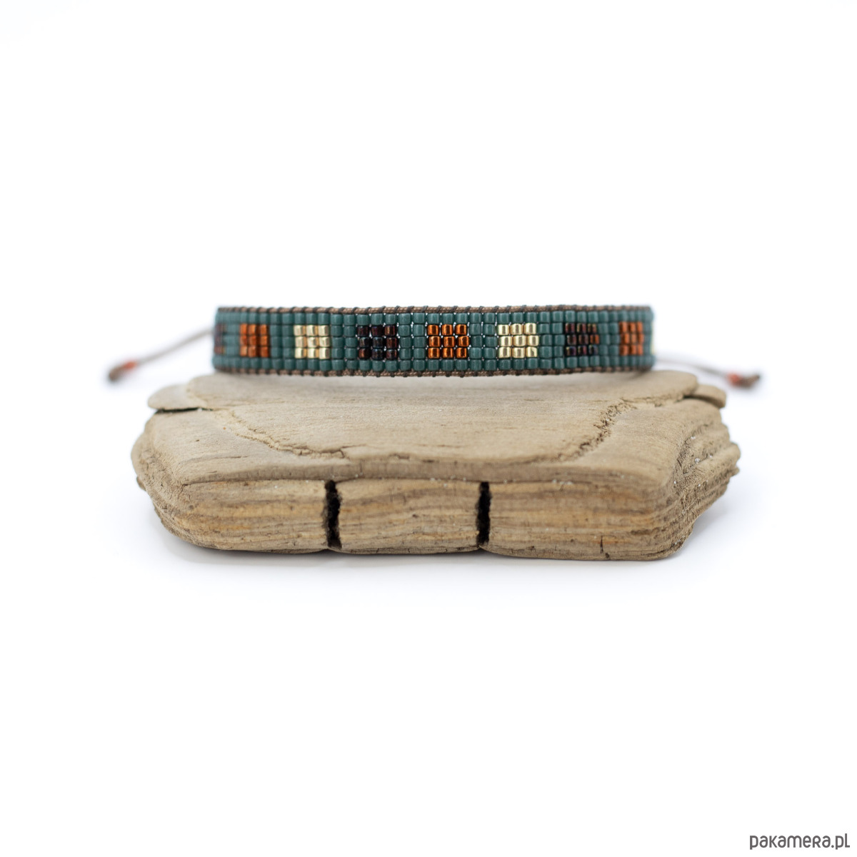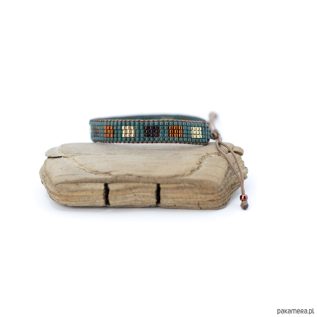 Bransoletka wykonana z koralików szklanych Miyuki Delica oraz nici i sznurka nylonowego. Kolory: ciemna zieleń, jasne złoto, metaliczny ciemny brąz.