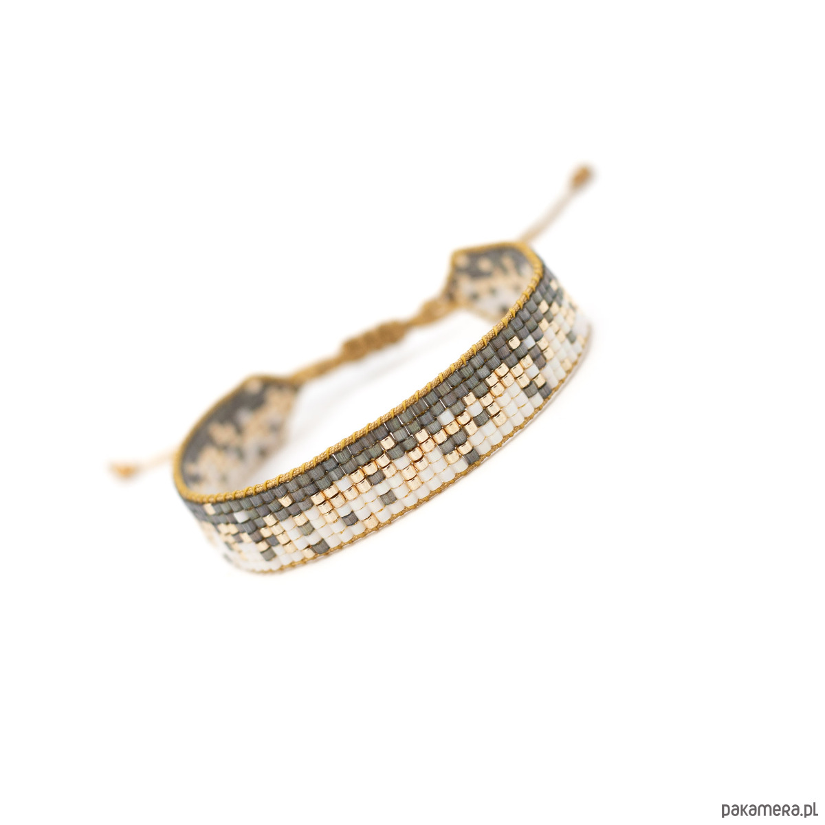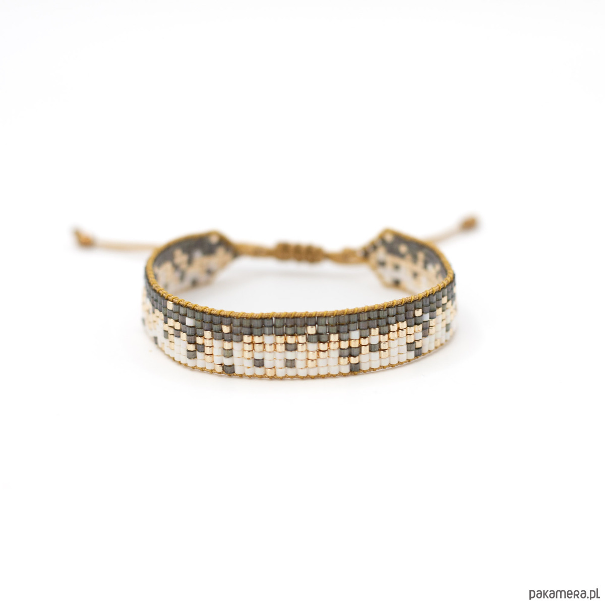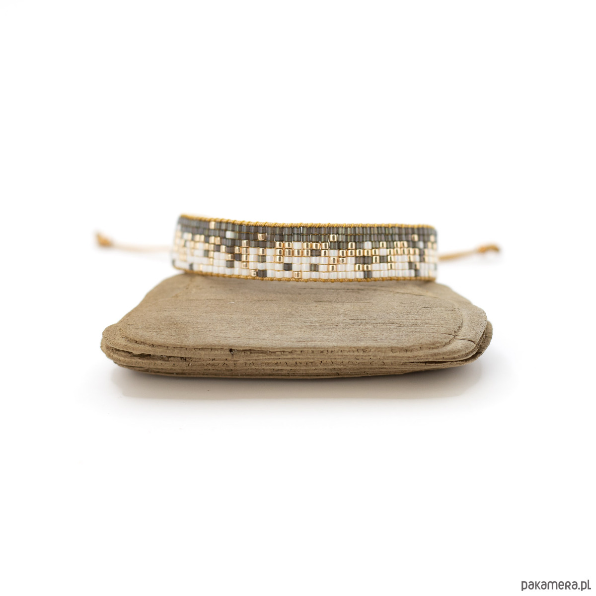 Bransoletka wykonana z koralików szklanych Miyuki Delica oraz nici i sznurka nylonowego. Kolory: półprzeźroczysty, zmrożony grafitowy, jasne złoto, biel.