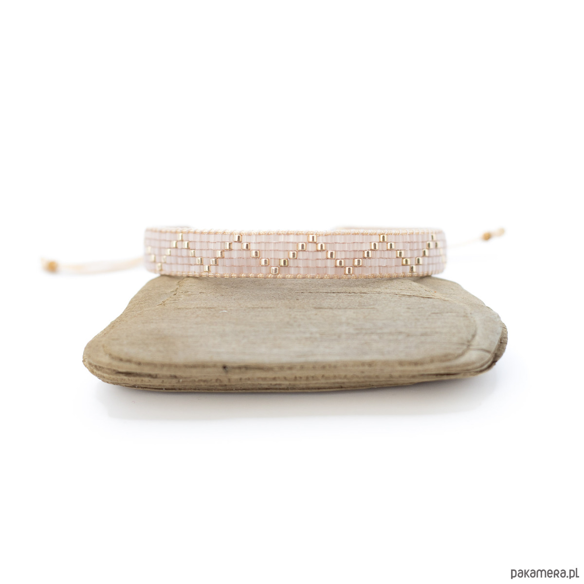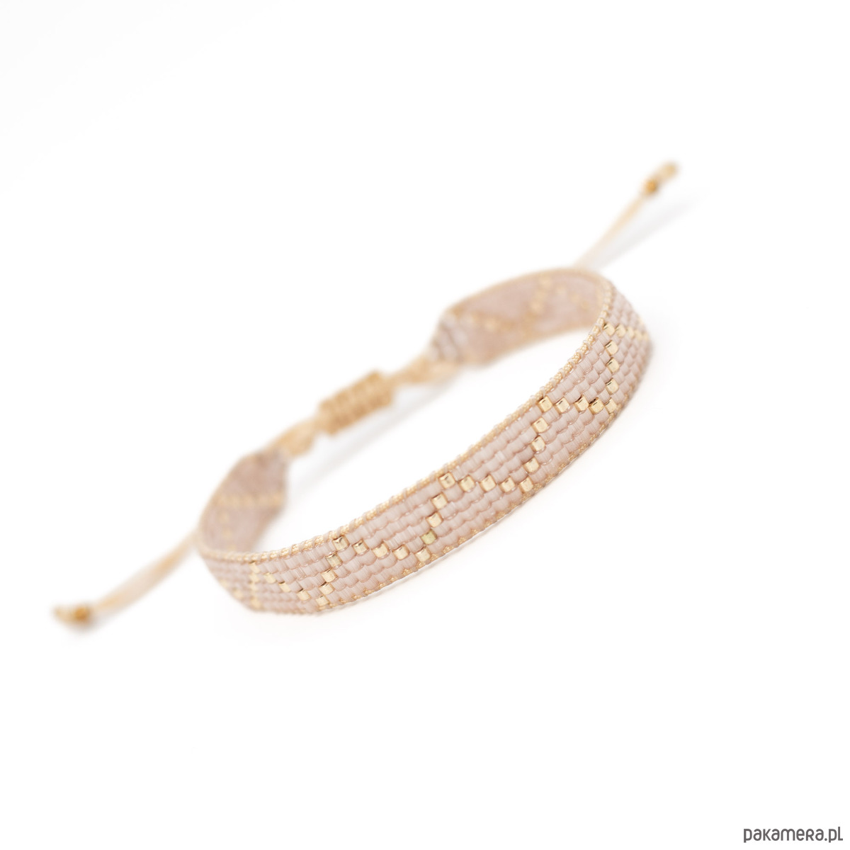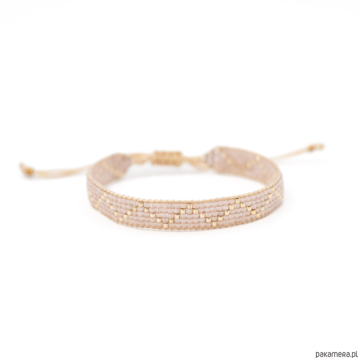 Bransoletka wykonana z koralików szklanych Miyuki Delica oraz nici i sznurka nylonowego. Kolory: półprzeźroczysty, zmrożony pudrowy róż, jasne złoto.