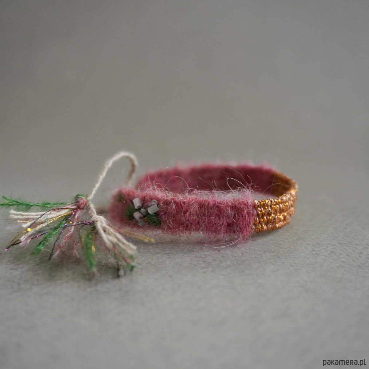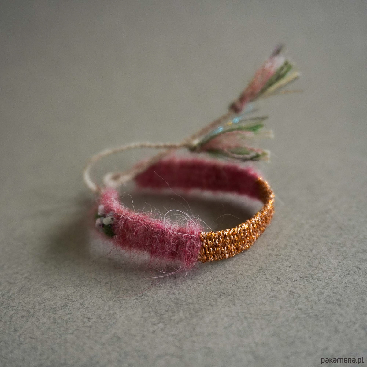 Śliczna bransoletka tkana na krośnie. Gustowne połączenie puszystego różu, błyszczącego, różowego złota i ten uroczy detal z boku, delikatny hafcik :).