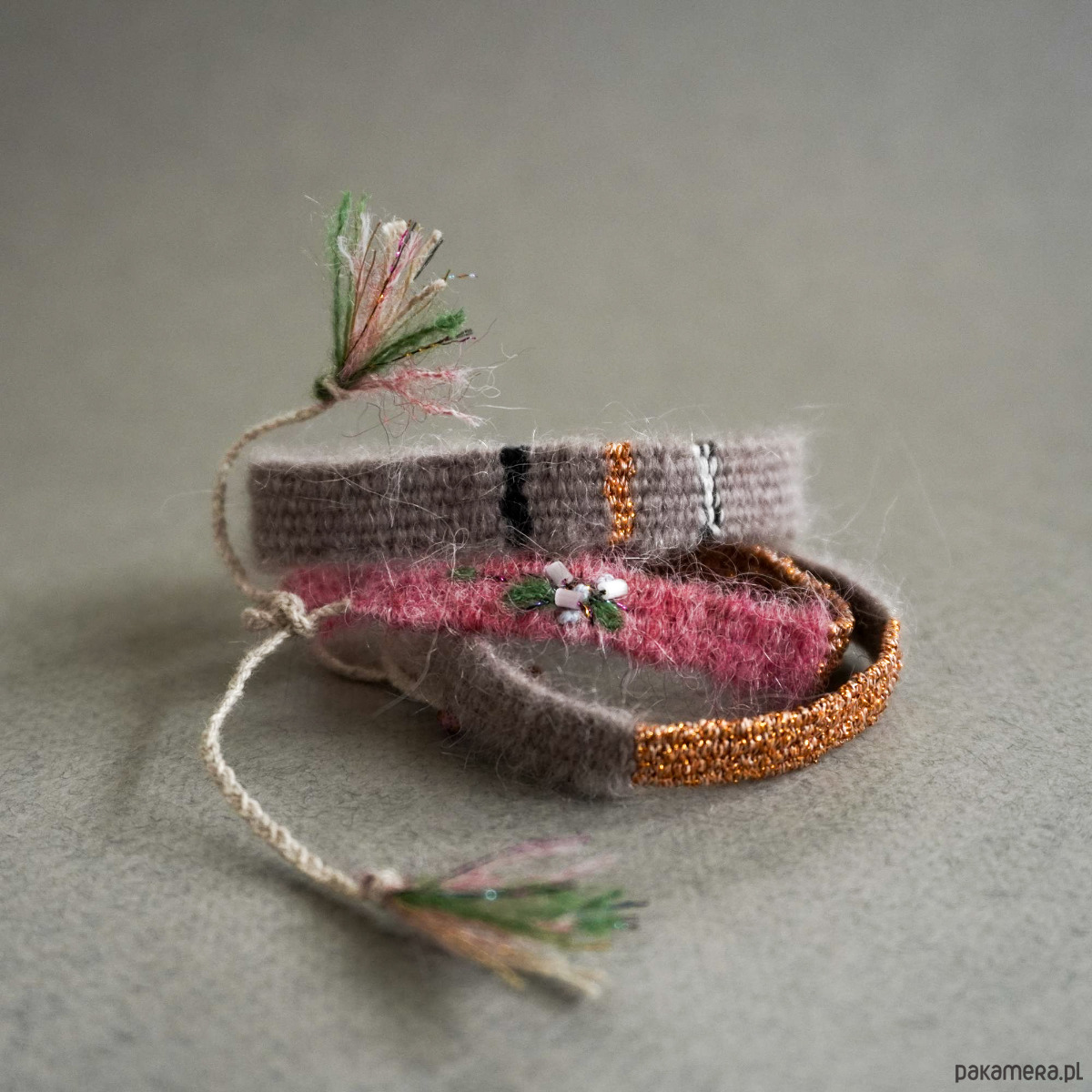 Bransoletka tkana z włóczki, z błyszczącym środkiem i haftem