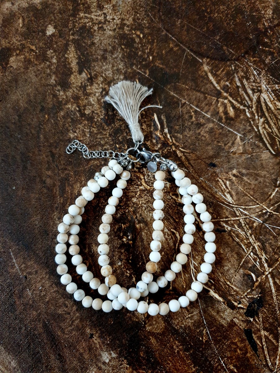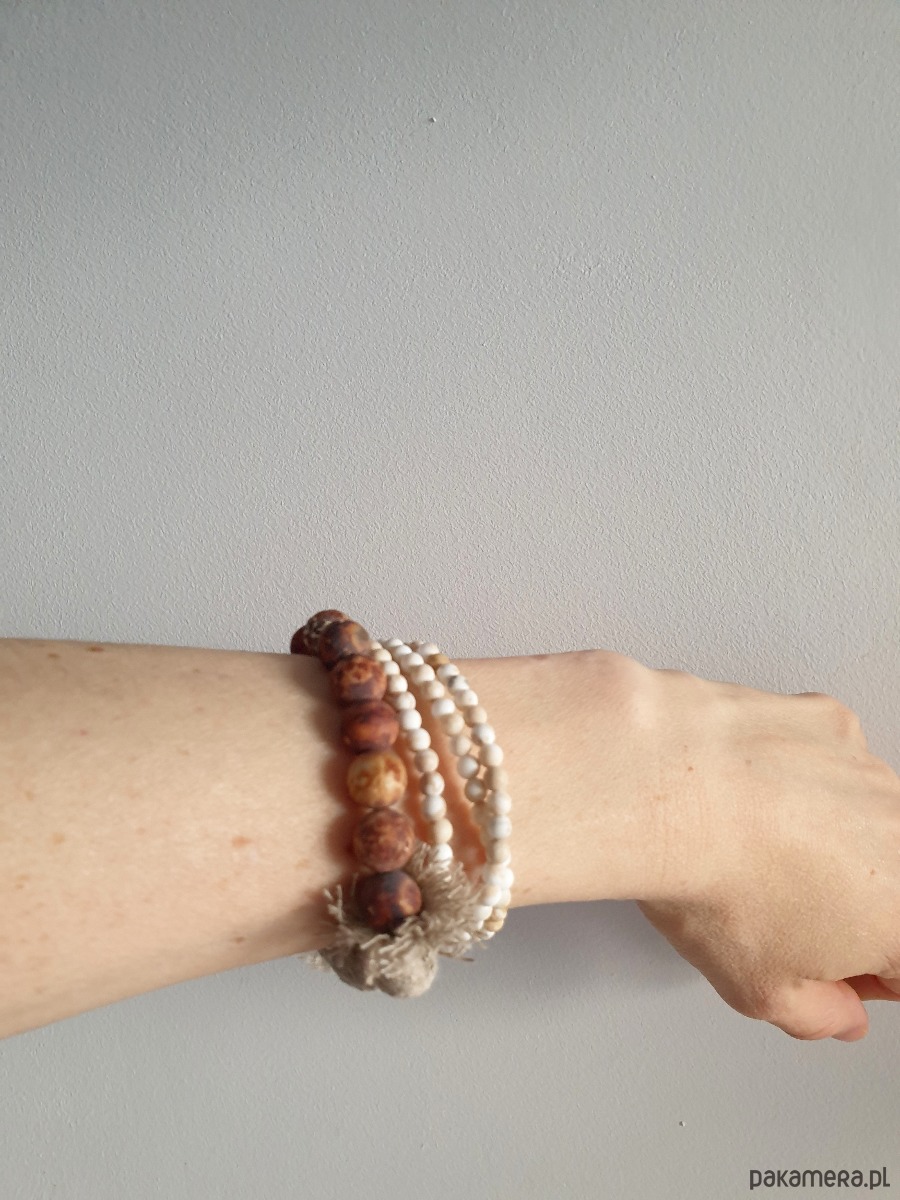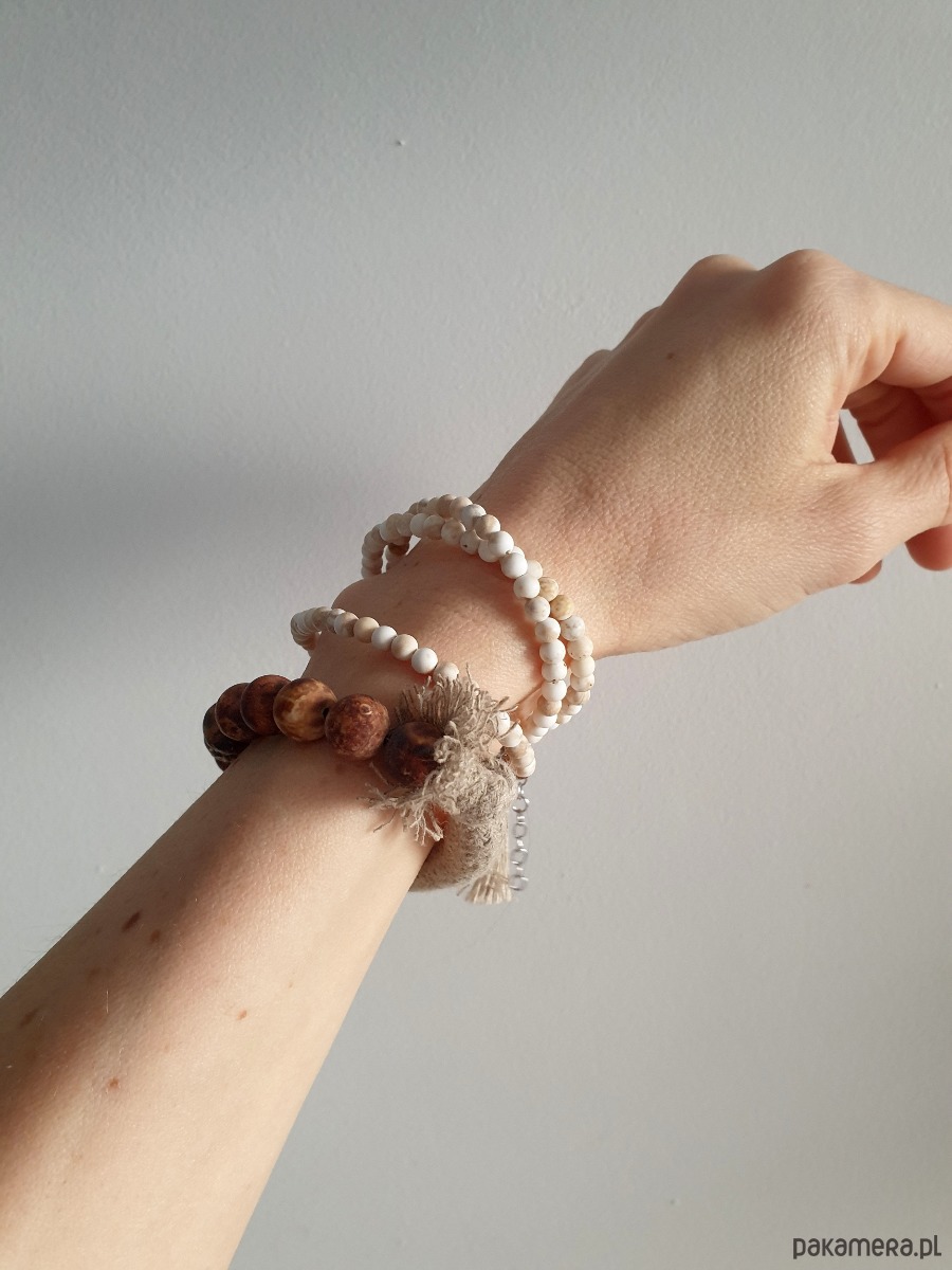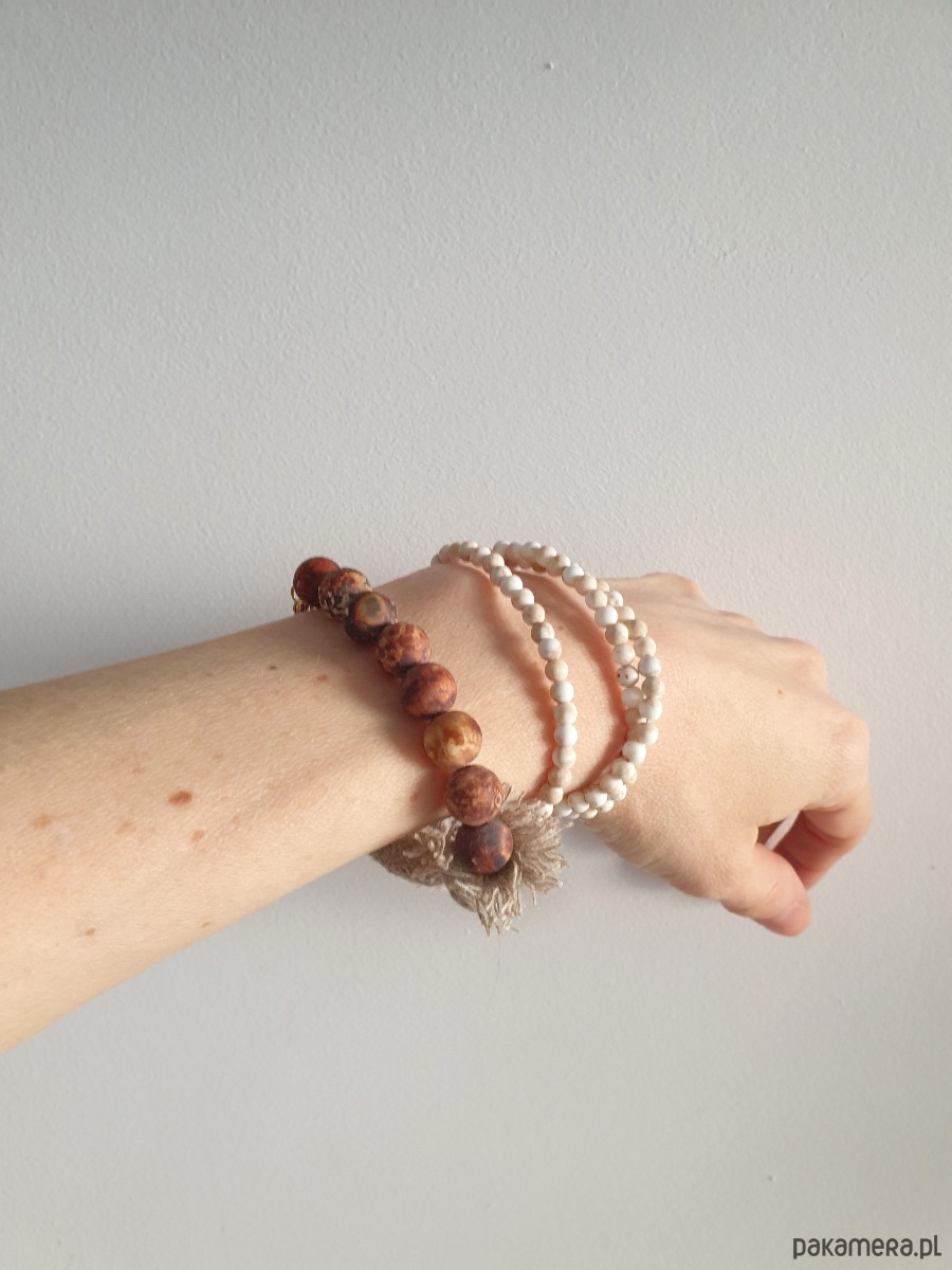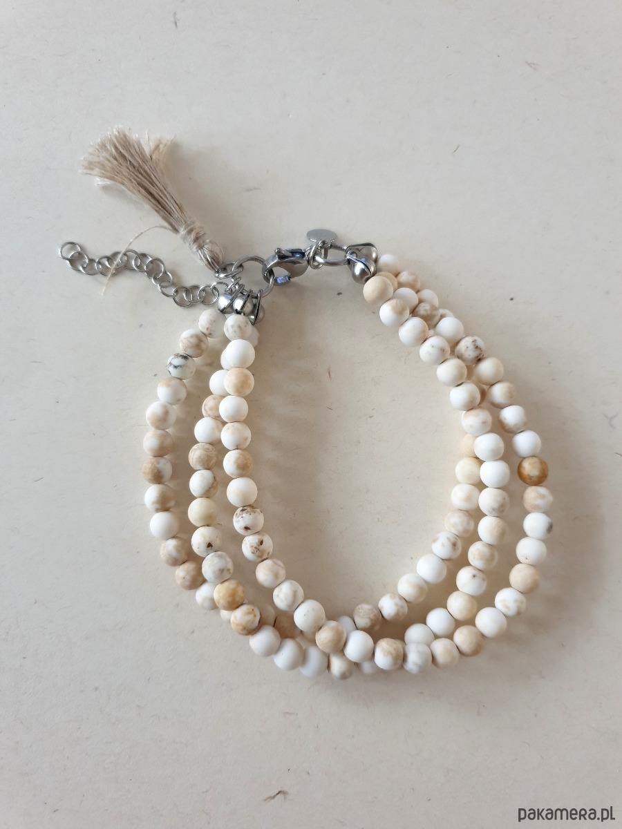 Autorska minimalistyczna bransoletka z kolekcji TRIO. Tworzona ręcznie z kamieni naturalnych, elementów ze stali szlachetnej (antyalergicznej) z lnianym chwostem. W tej - matowa kulka howlit kremowy. Nieźle wygląda wraz z innymi bransoletkami w tej samej tonacji :)