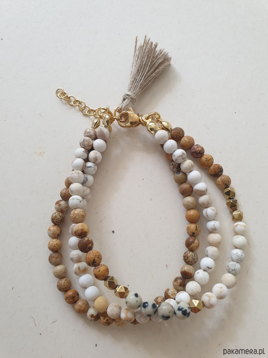 Bransoletka TRIO jaspis dalmatyński, obrazkowy, howlit, hematyt, lniany chwost
