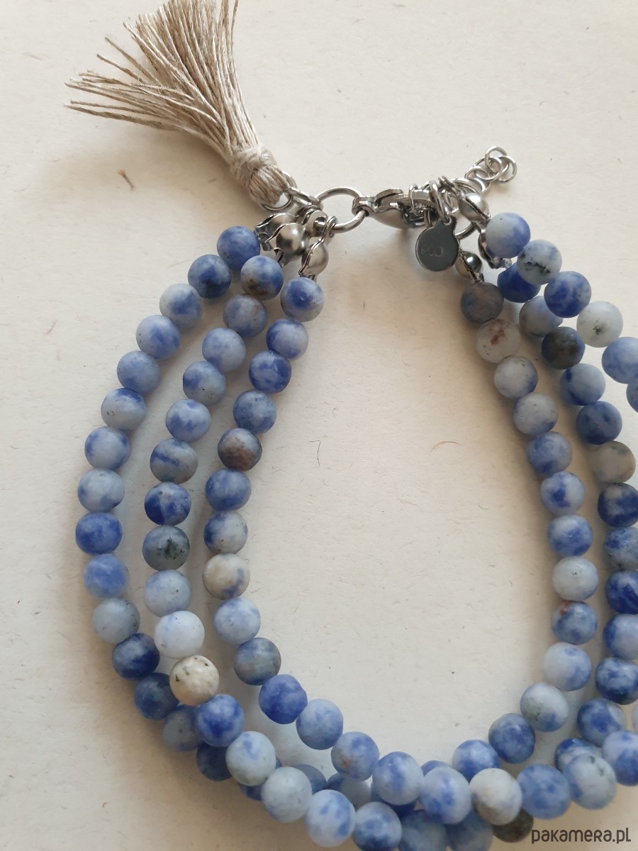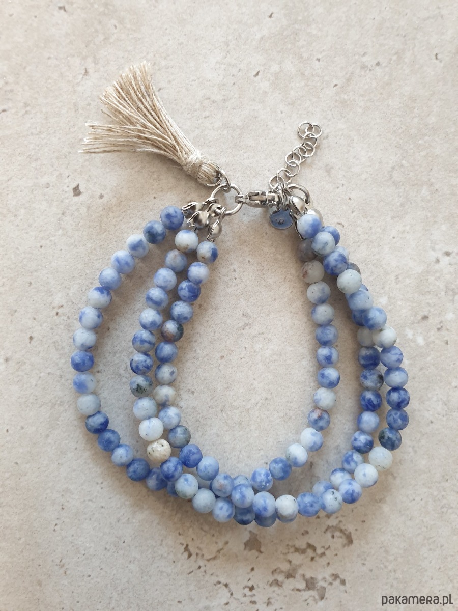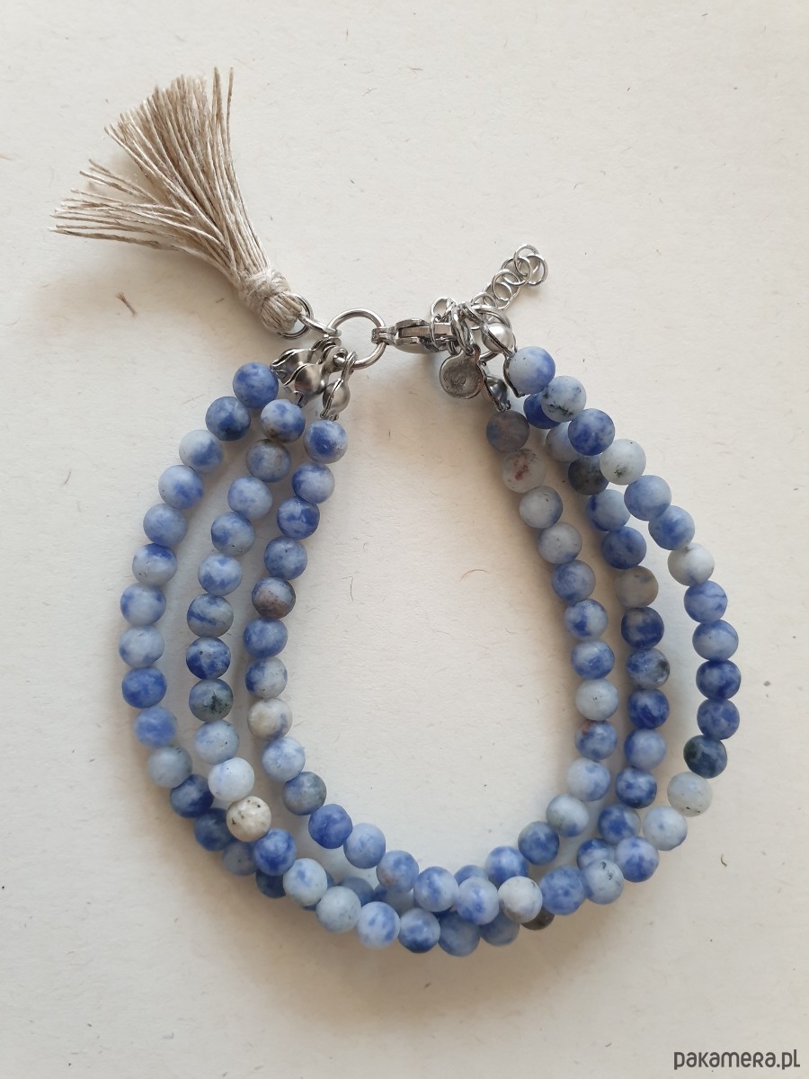 Autorska minimalistyczna bransoletka z kolekcji TRIO. Tworzona ręcznie z kamieni naturalnych, elementów ze stali szlachetnej (antyalergicznej) z lnianym chwostem. W tej - matowa kulka jaspis niebieski. Nieźle wygląda wraz z innymi bransoletkami w tej samej tonacji :) Bransoletka tworozna na zamówienie z tych samych kamieni, ale mogą być minimalne różnice bo każdy kamień jest wyjątkowy.