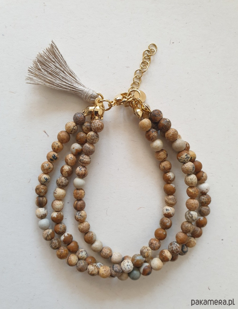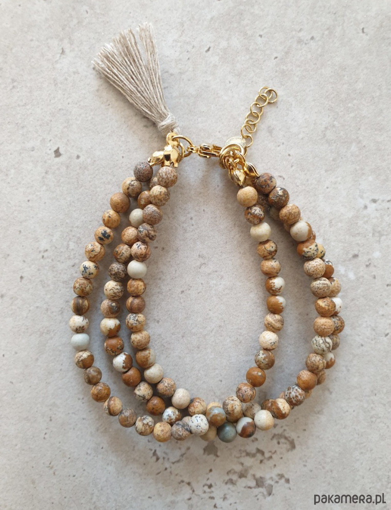 Autorska minimalistyczna bransoletka z kolekcji TRIO. Tworzona ręcznie z kamieni naturalnych, elementów ze stali szlachetnej (antyalergicznej) tutaj w kolorze złotym, z lnianym chwostem. W tej - matow a kulka jaspis obrazkowy.
