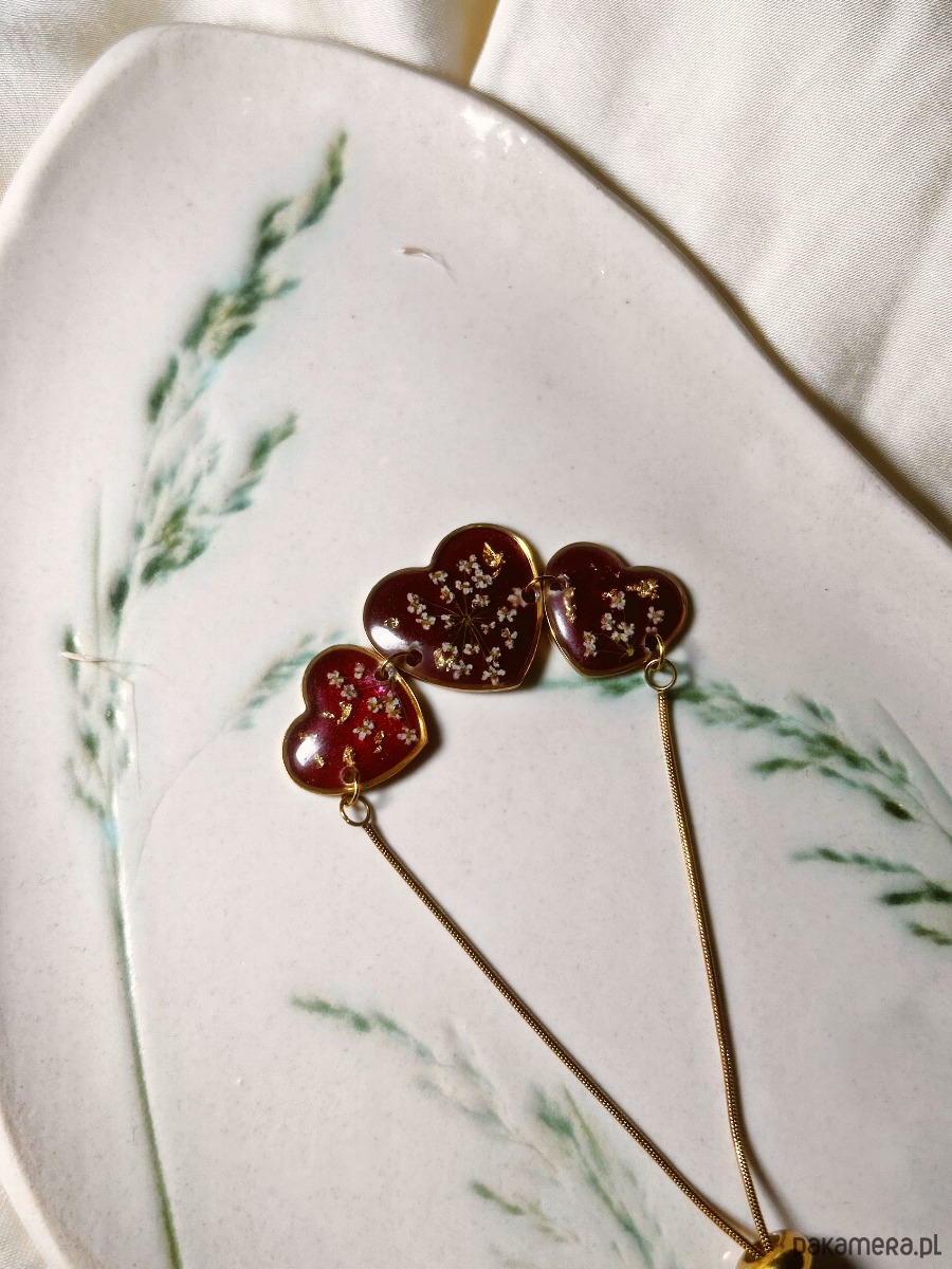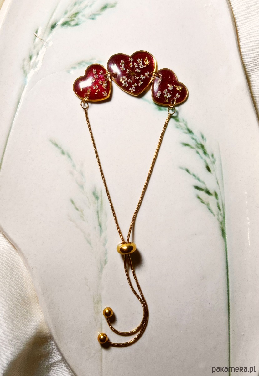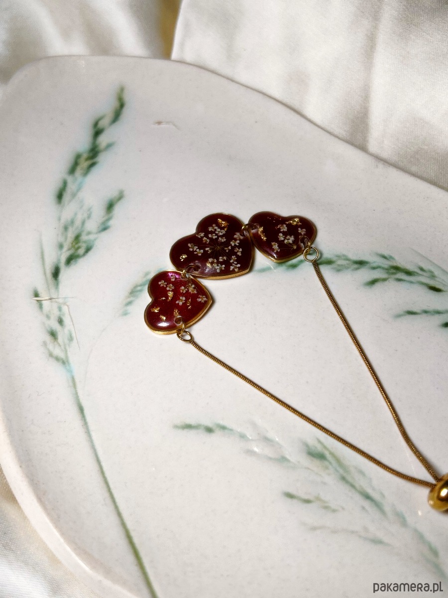 Ta bransoletka to kwintesencja subtelnej kobiecości. Trzy maleńkie serca, utrzymane w głębokim bordowym odcieniu i wypełnione drobnymi kwiatuszkami, tworzą lekką, harmonijną kompozycję, która pięknie mieni się na nadgarstku przy każdym ruchu.