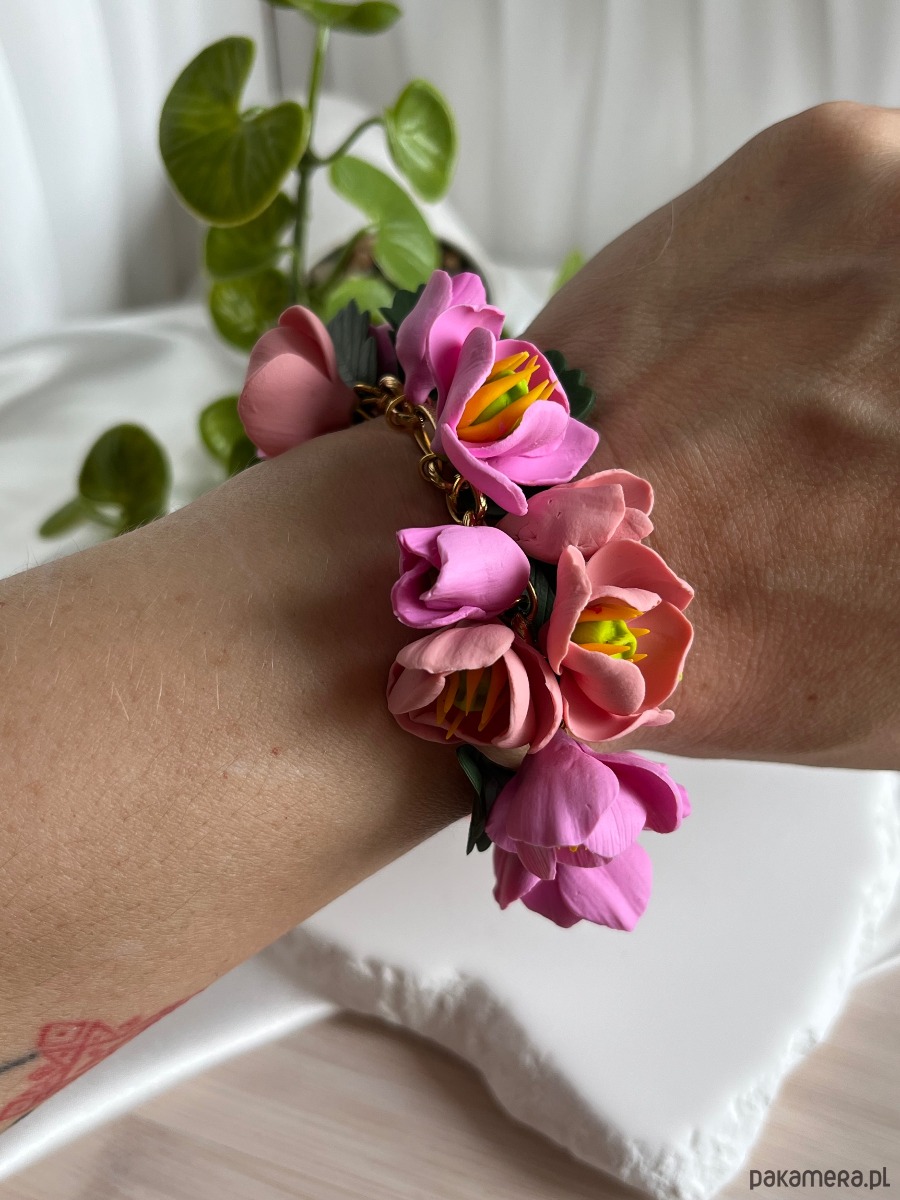 Bransoletka z różowymi tulipanami – ręcznie robiona biżuteria kwiatowa