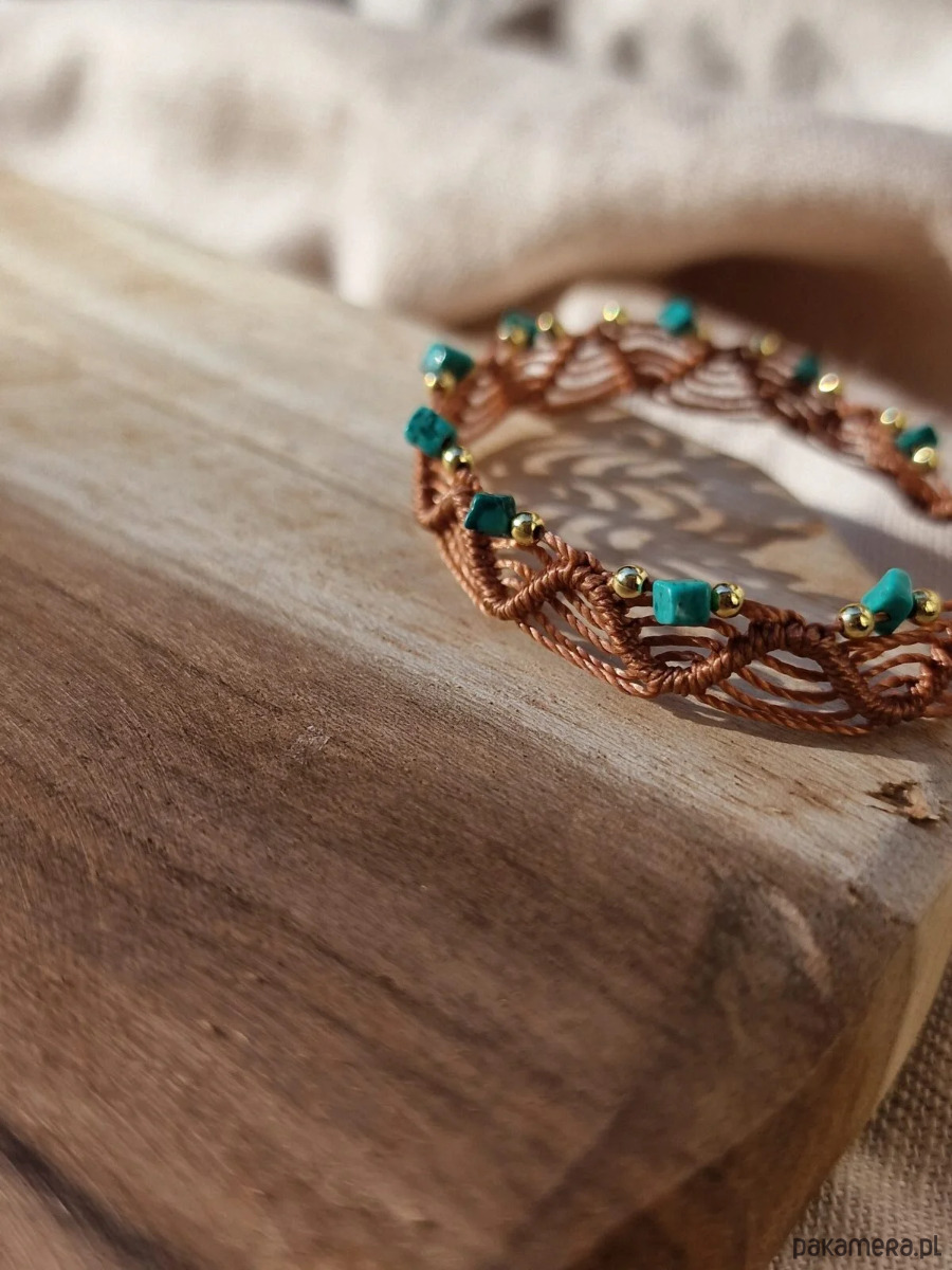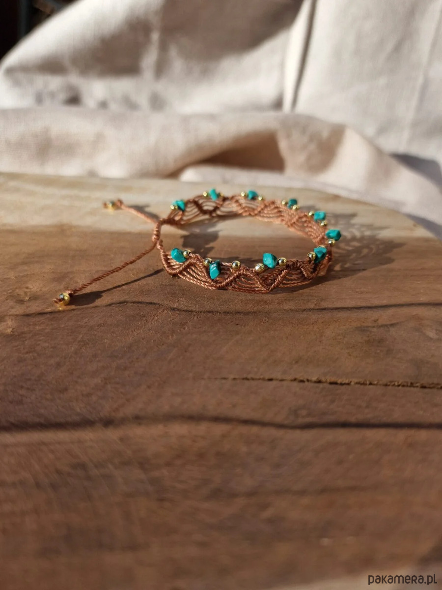 Bransoletka pleciona, wykonana z nylonowego sznurka i kamieni: naturalnego turkusu i hematytu.