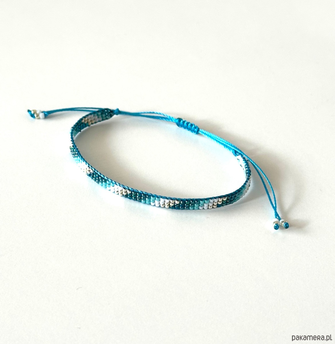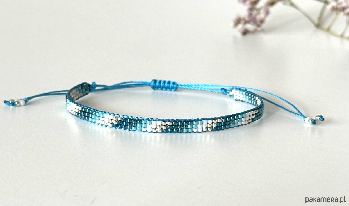 Bransoletka w odcieniach turkusu, białego i srebrnego, tkana na krośnie ze szklanych, odpornych na ścieranie koralików toho. Delikatna, kobieca, pasuje na każdy nadgarstek.