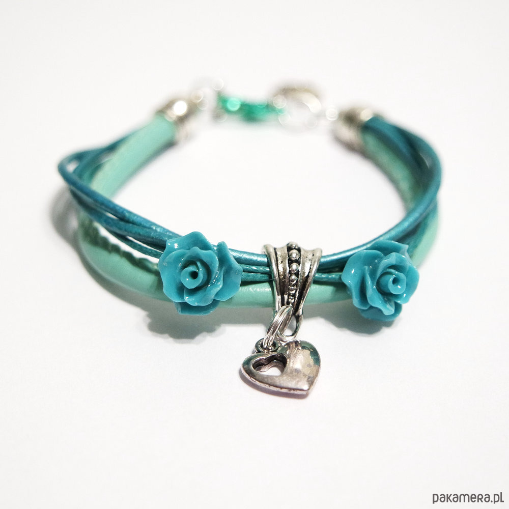 Bransoletka z różyczek z korala oraz woskowanych sznureczków, rzemieni ze skóry naturalnej i ekologicznej.