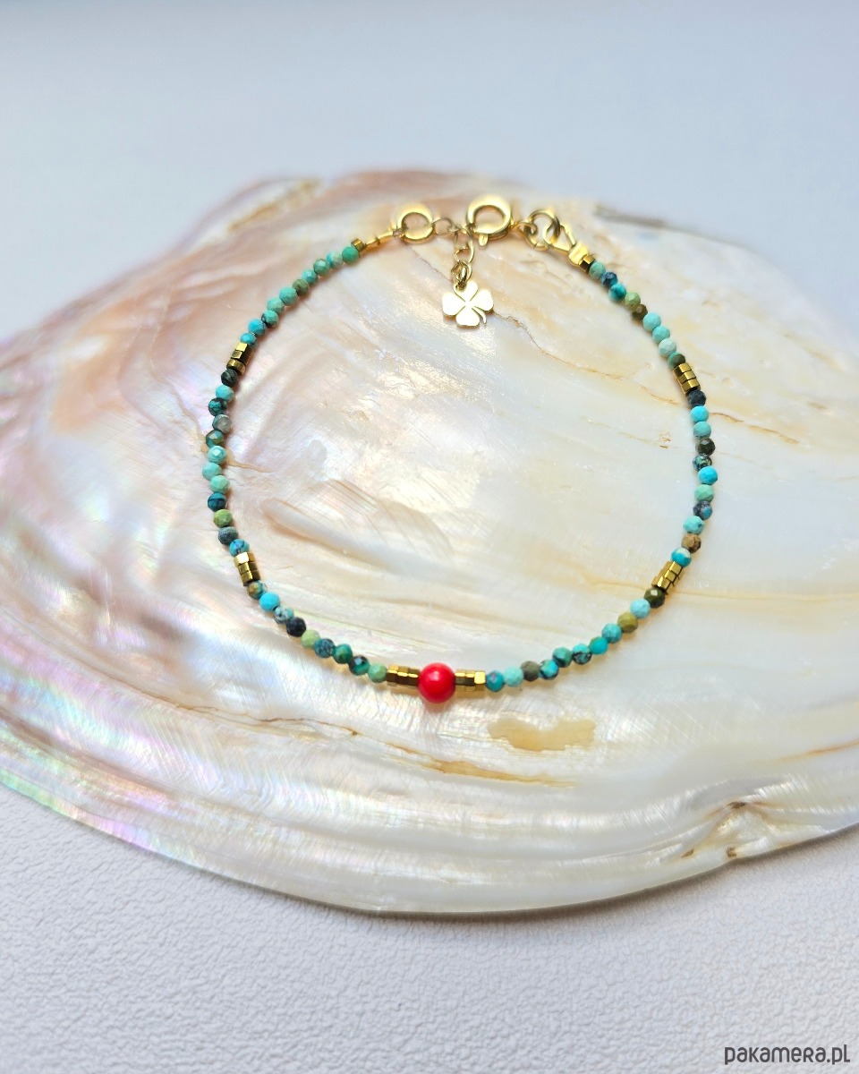 malutkich, 2mm kamieni turkusu i złoconego hematytu, z akcentem z czerwonego korala