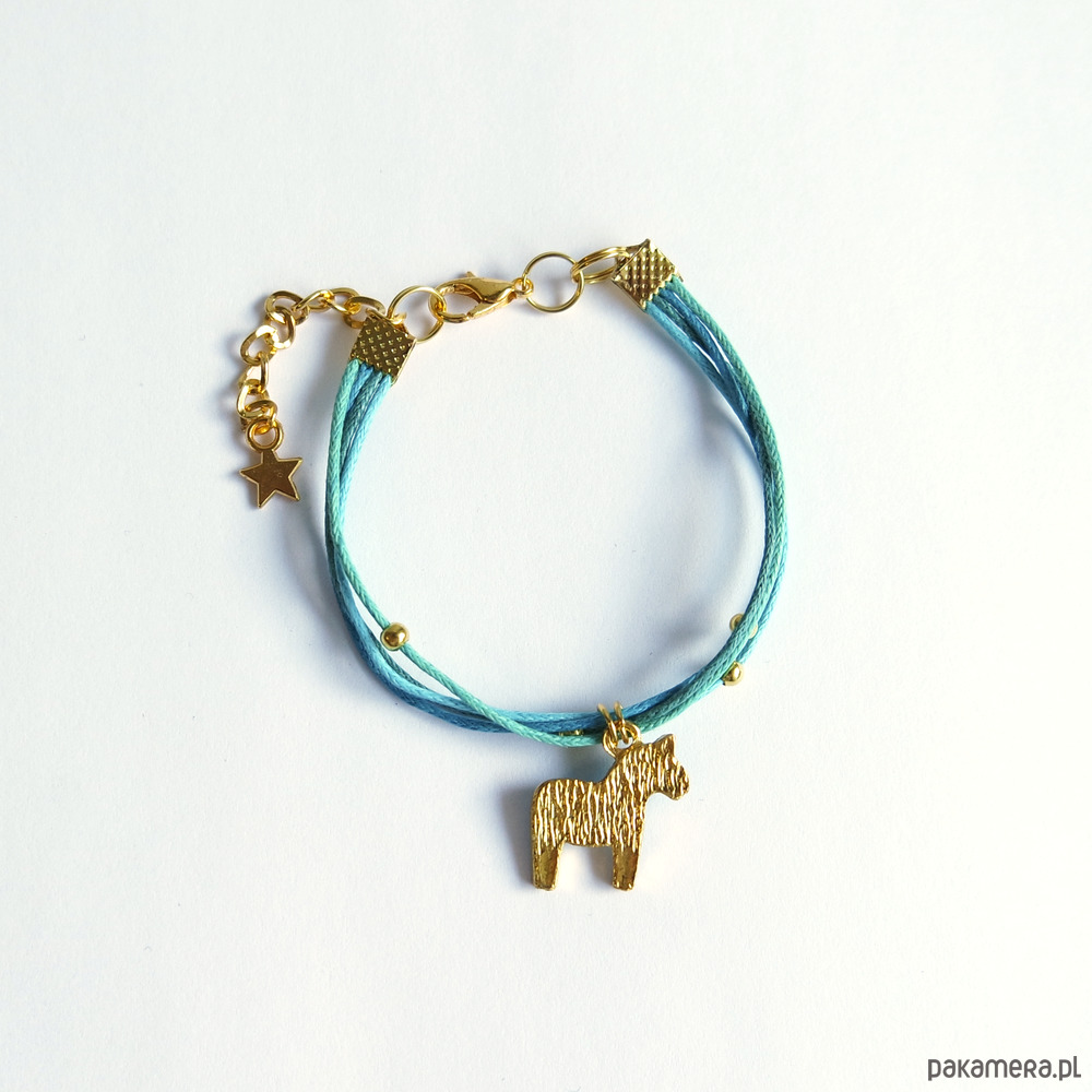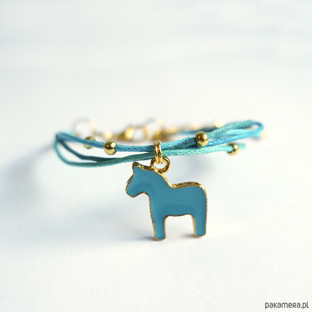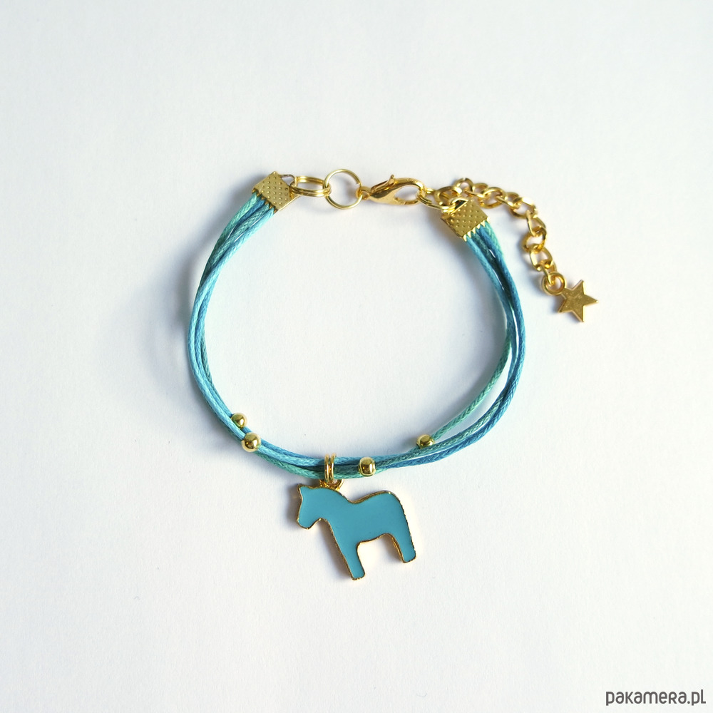 Niezwykła, subtelna bransoletka z piękną , emaliowaną, metalową zawieszką w kształcie konika.