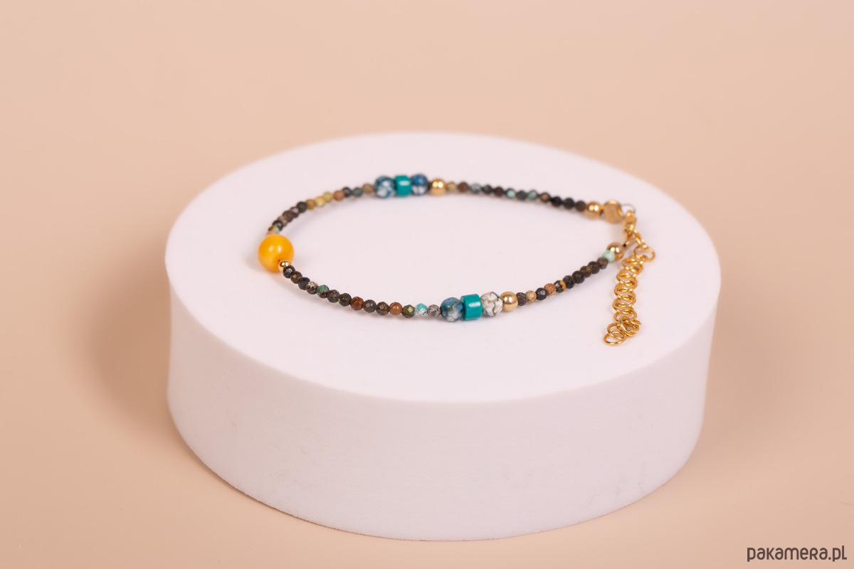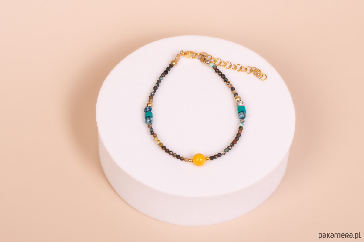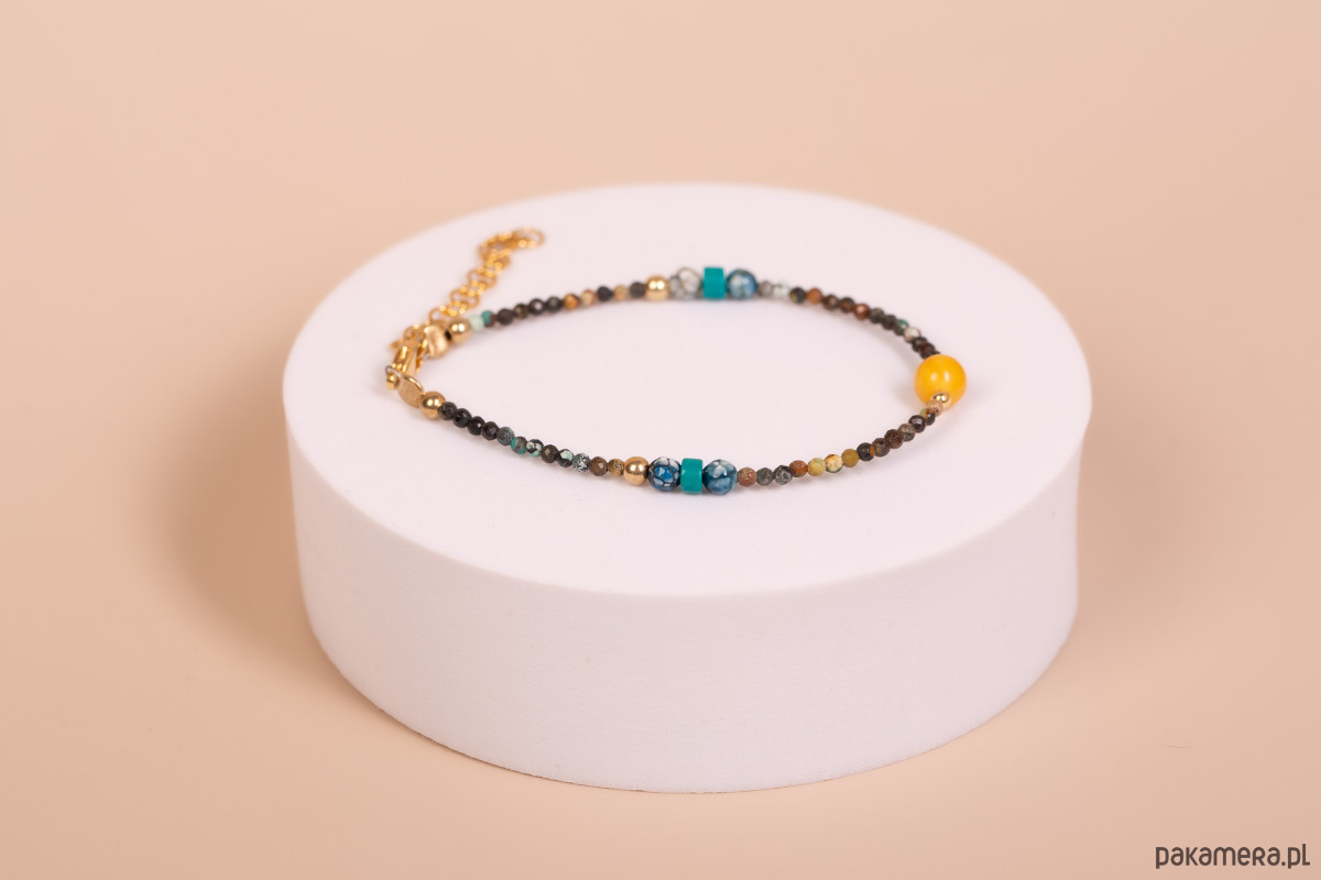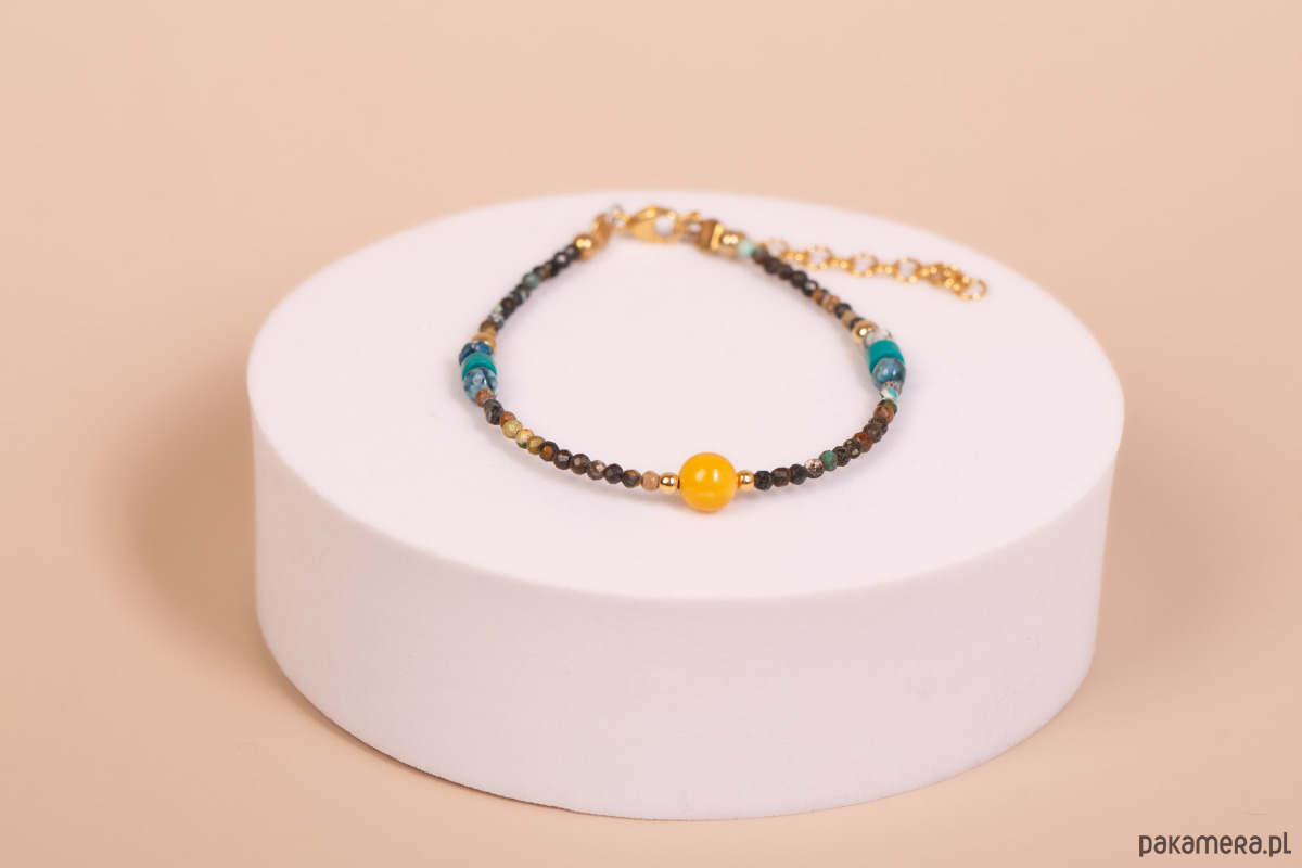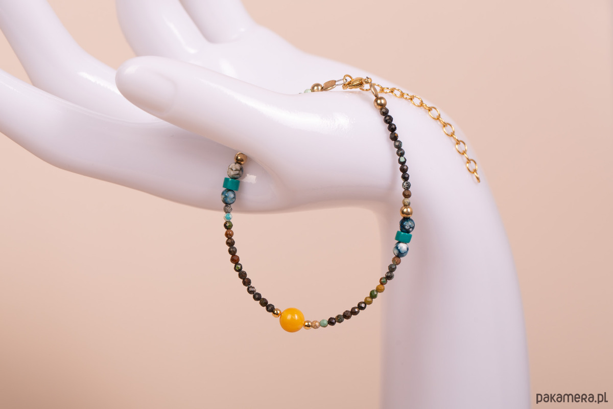 Forma i charakter: Bransoletka wyróżnia się dynamicznym zestawieniem kolorów – słoneczna żółć bursztynu pięknie kontrastuje z błękitem apatytu i morską zielenią jaspisu. Ziemiste tony turmalinu stanowią dla nich idealne, stonowane tło. Złociste akcenty ze srebra próby 925 pozłacanego wprowadzają do kompozycji szlachetny blask, łącząc różnorodne minerały w spójną, biżuteryjną całość. To idealny dodatek dla osób ceniących unikatowe, wielobarwne projekty.