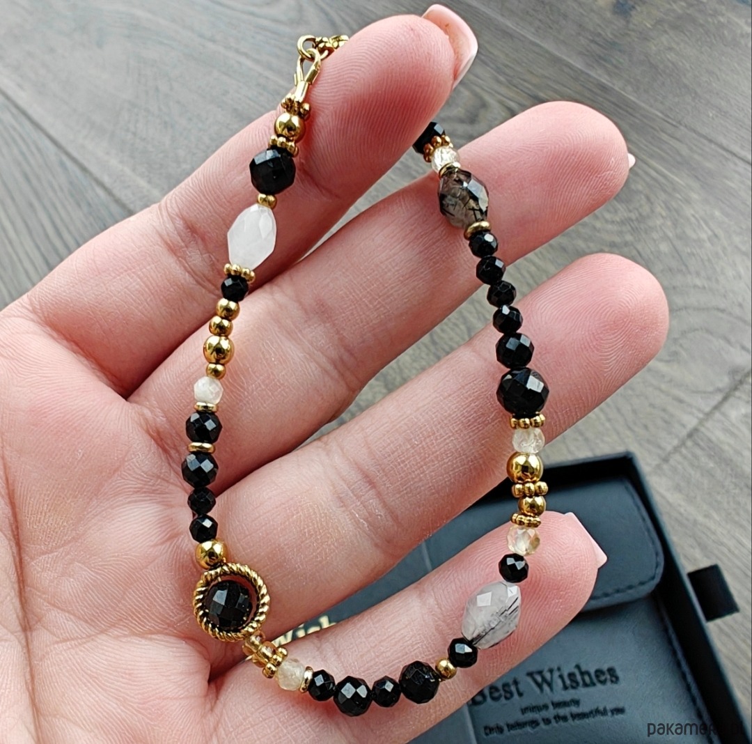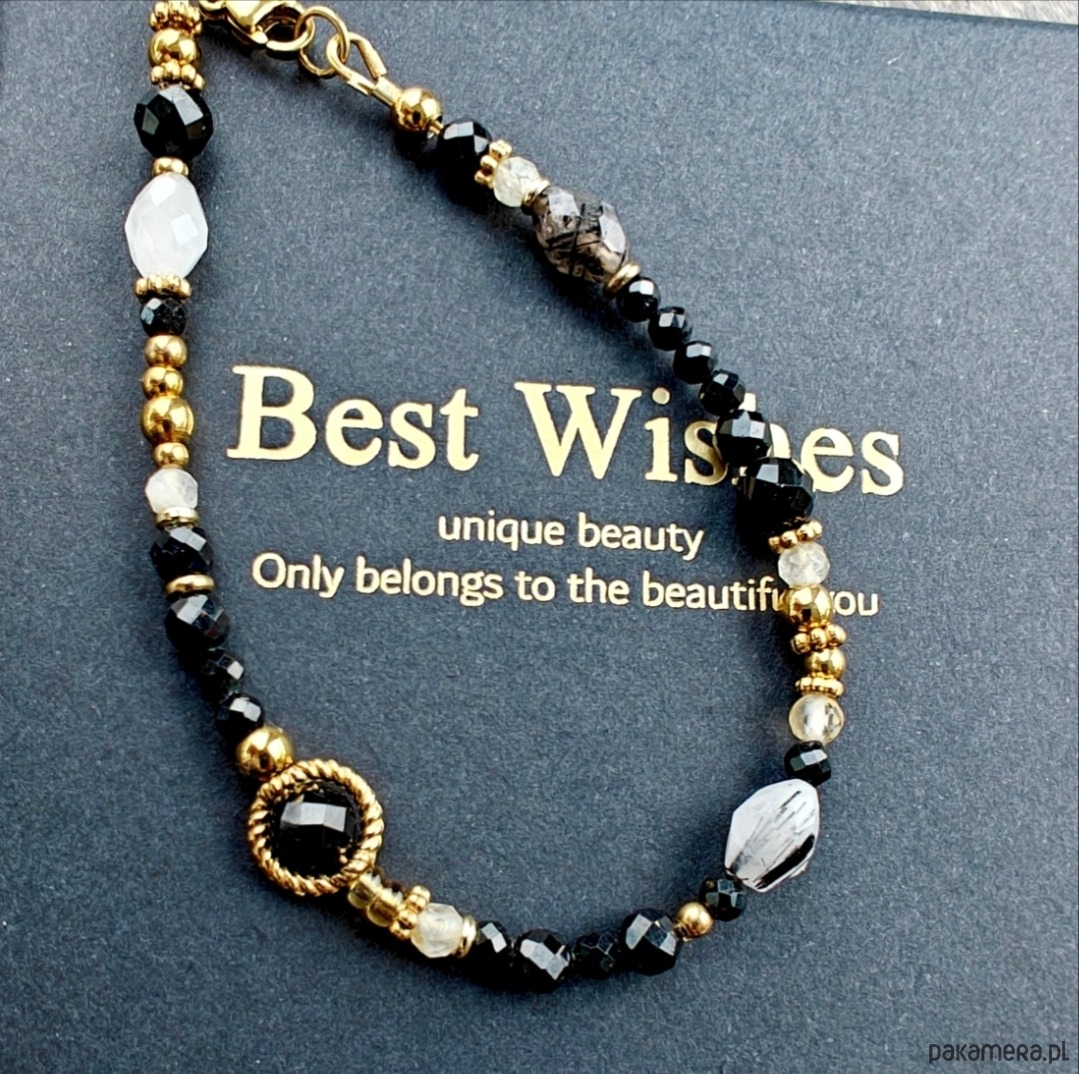 Połączenie energetycznego turmalinu, promiennego cytrynu i przejrzystego kryształu górskiego tworzy kompozycję pełną harmonii i dobrej energii.
