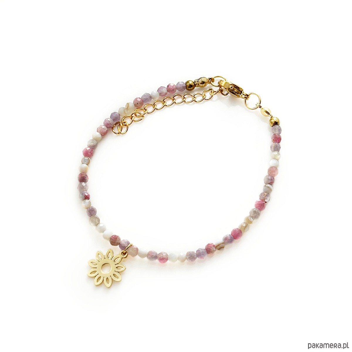 Bransoletka z kamieniami turmalinu i masy perłowej, metalowe elementy są ze stali szlachetnej/chirurgicznej.