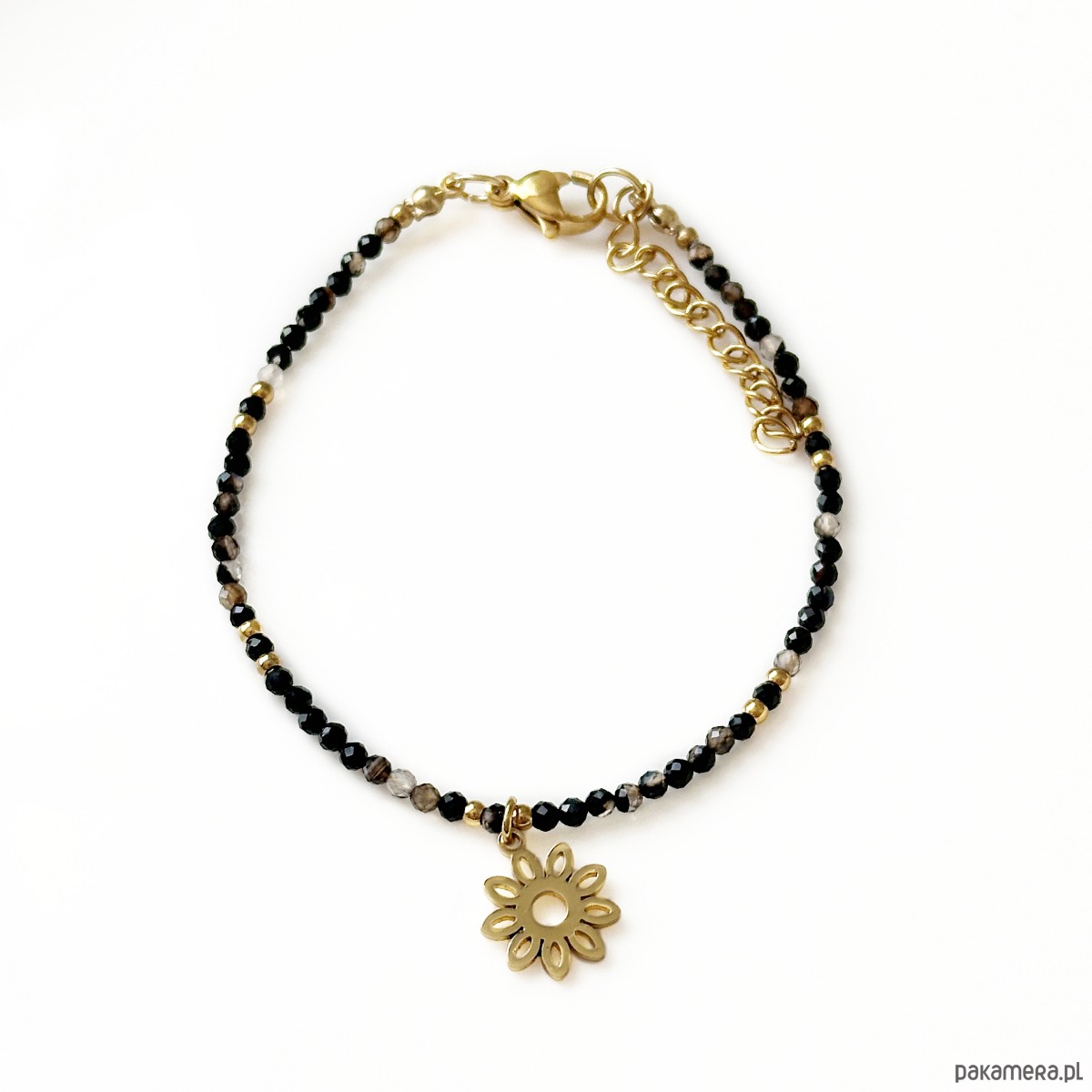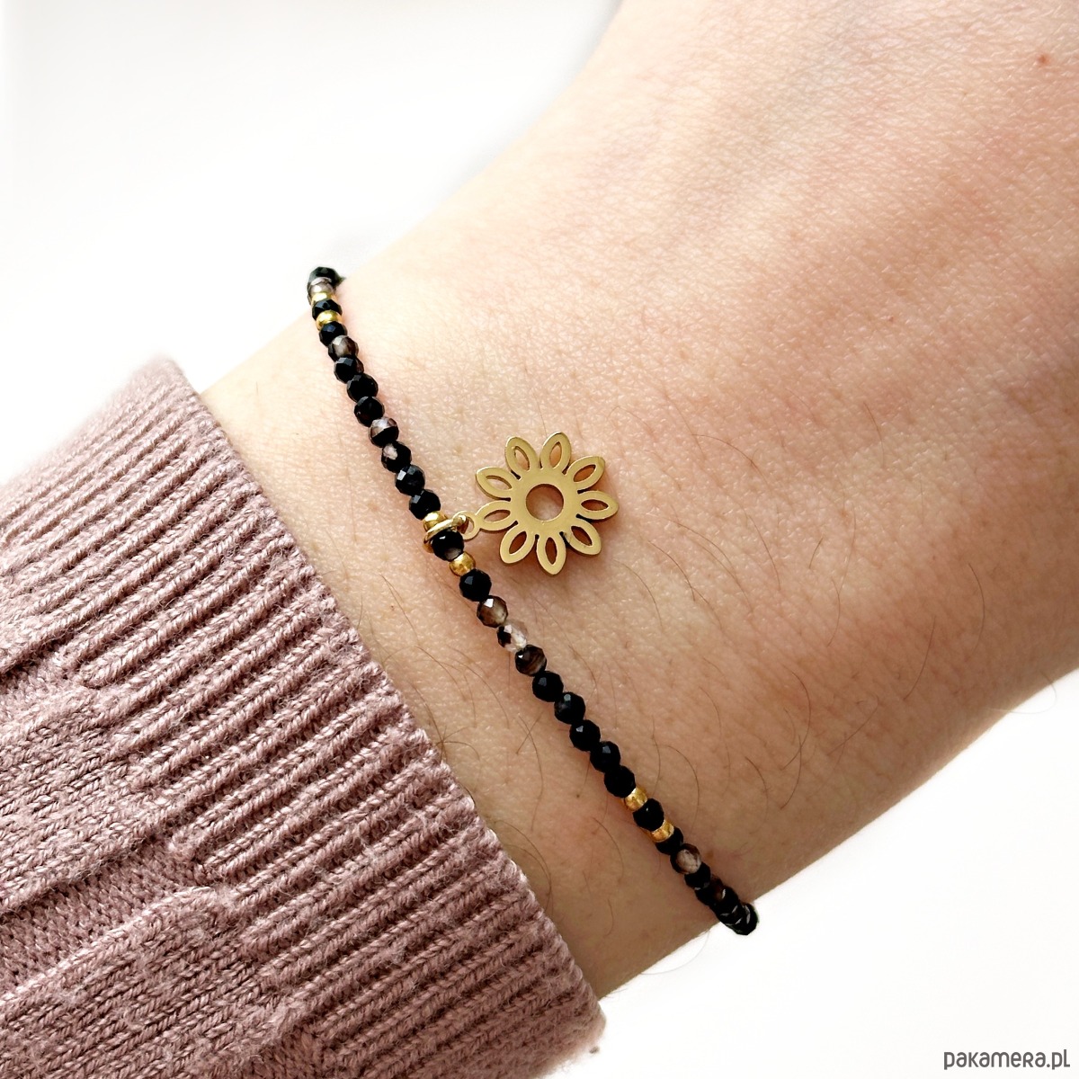 Bransoletka z kamieniami turmalinu i masy perłowej, metalowe elementy są ze stali szlachetnej/chirurgicznej.
