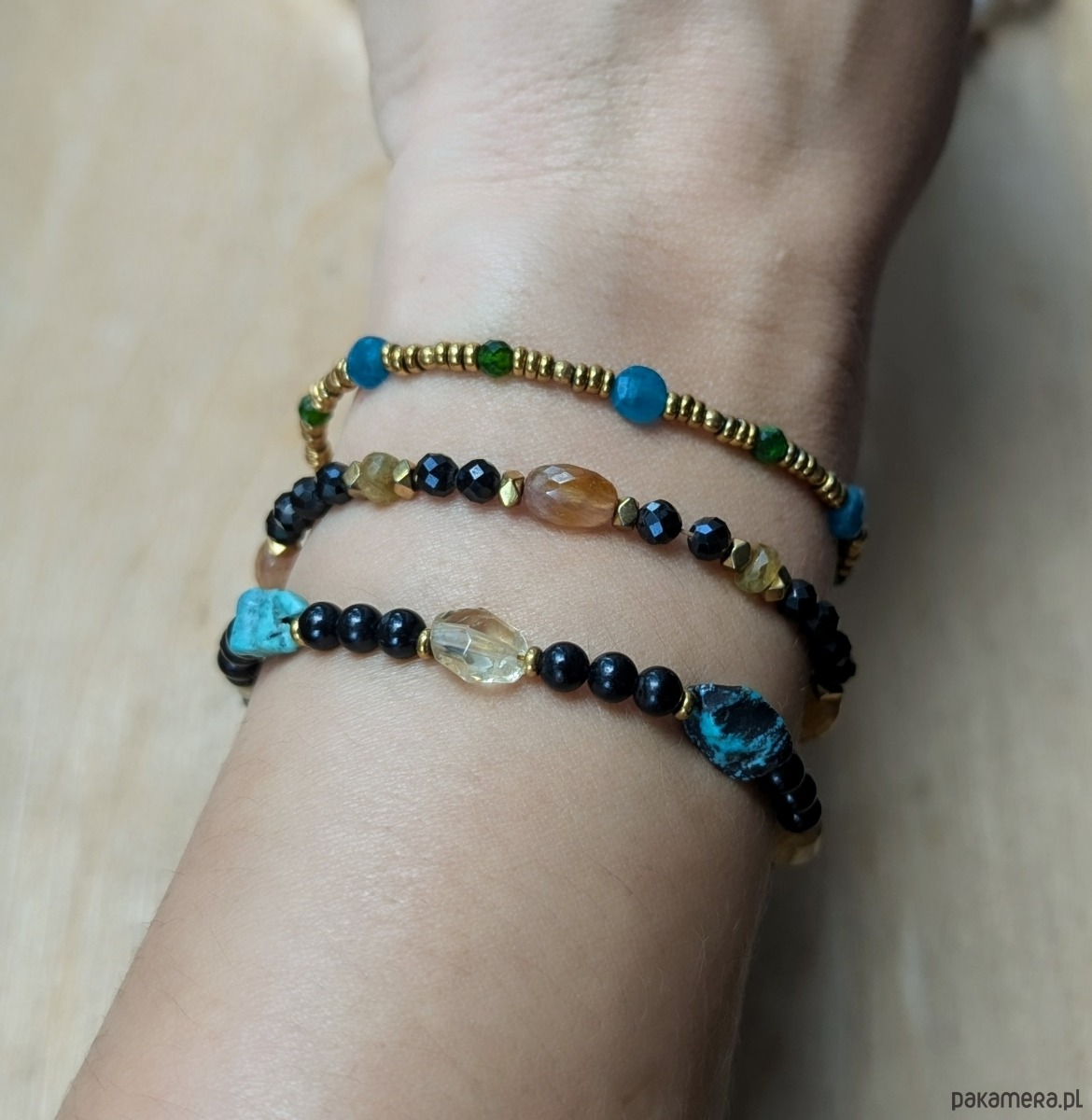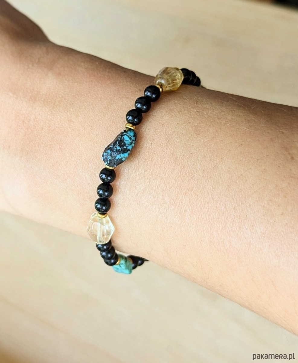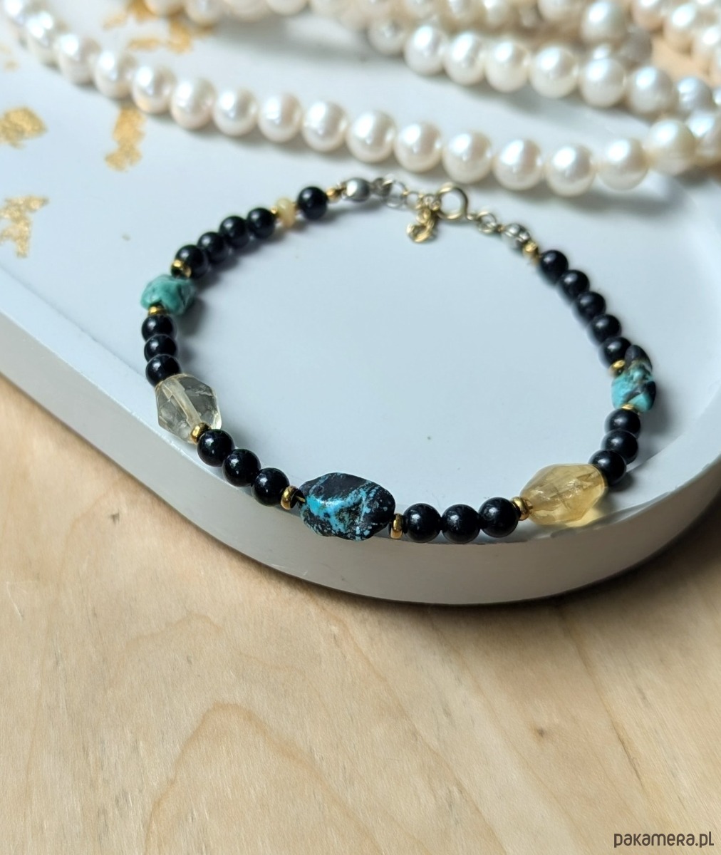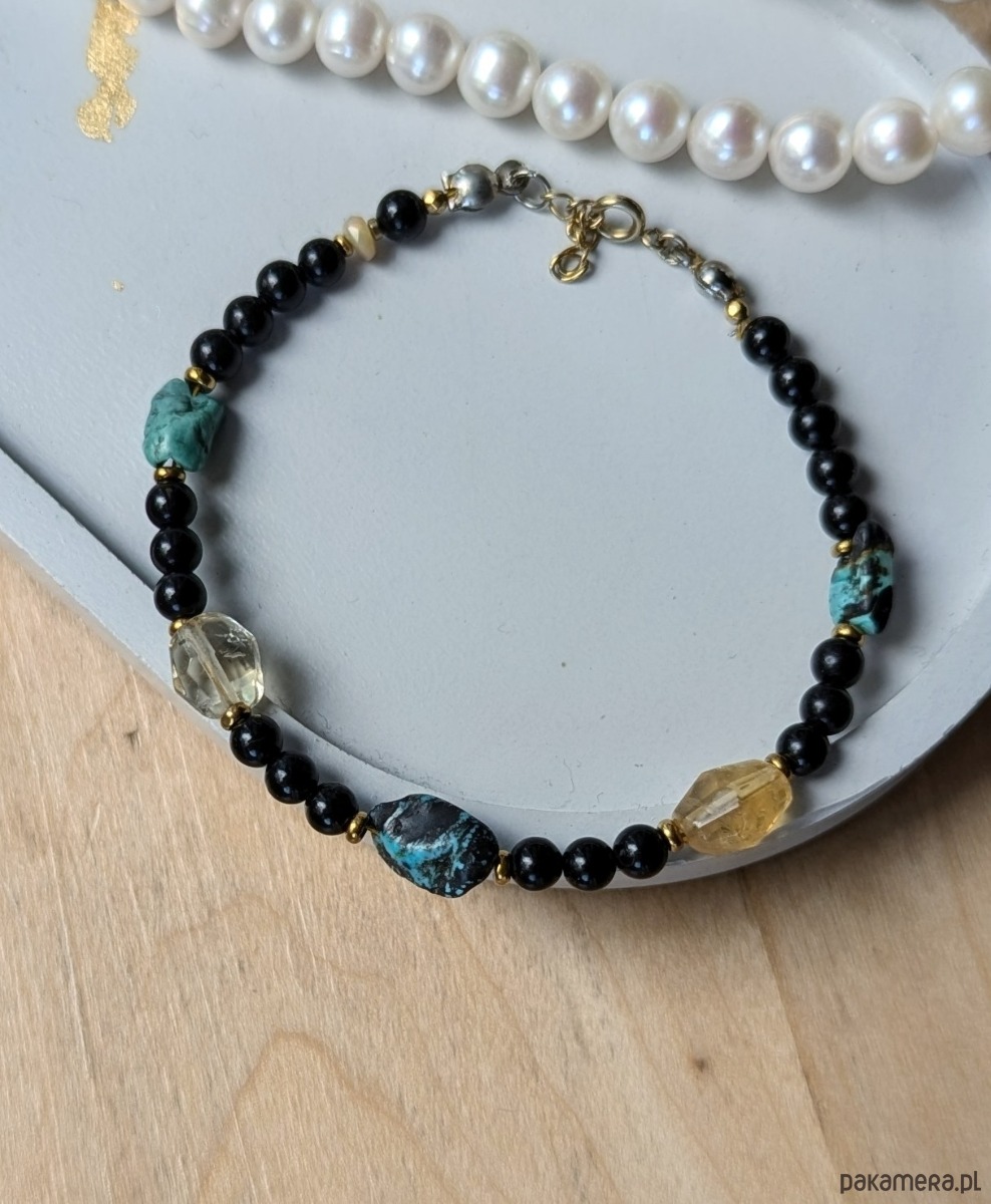 Bransoleta z turmalinu z dodatkiem bryłek pięknego turkusu i świetlistego cytrynu. Wykończona pozłacanym srebrem. Bransoletka jest bardzo atrakcyjna, podkreśla stylizację. Pasuje zarówno na letnie miesiące, jak i na chłodne okresy. Dobrze komponuje się z denimem oraz naturalnymi tkaninami.