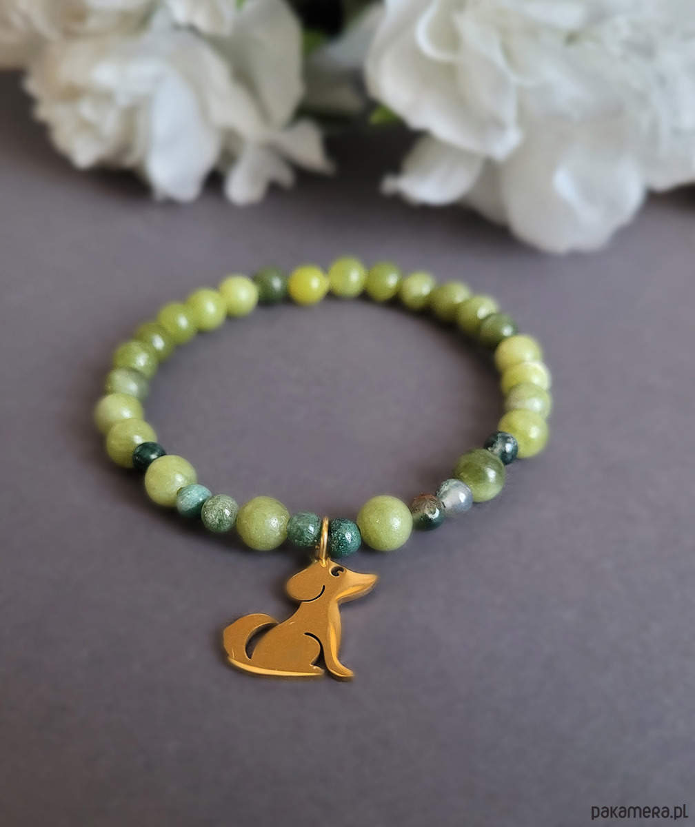 Piękna bransoletka z kamieni naturalnych - Jadeitu zielonego oraz Agatu indyjskiego z przywieszką w kolorze złotym- psem. Idealna dla miłośników psów (psiarzy) ;).