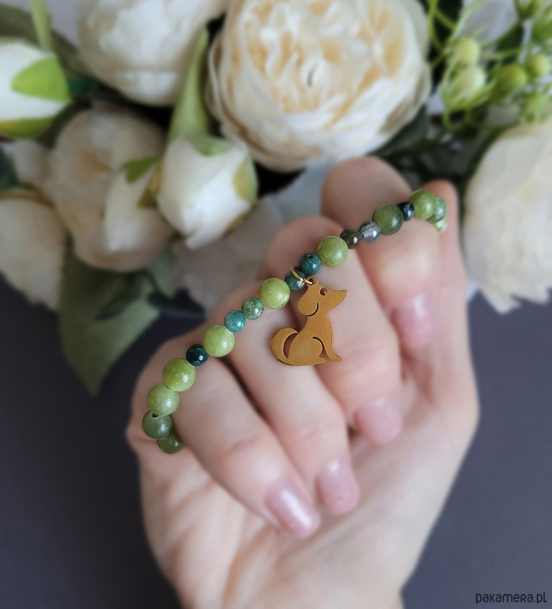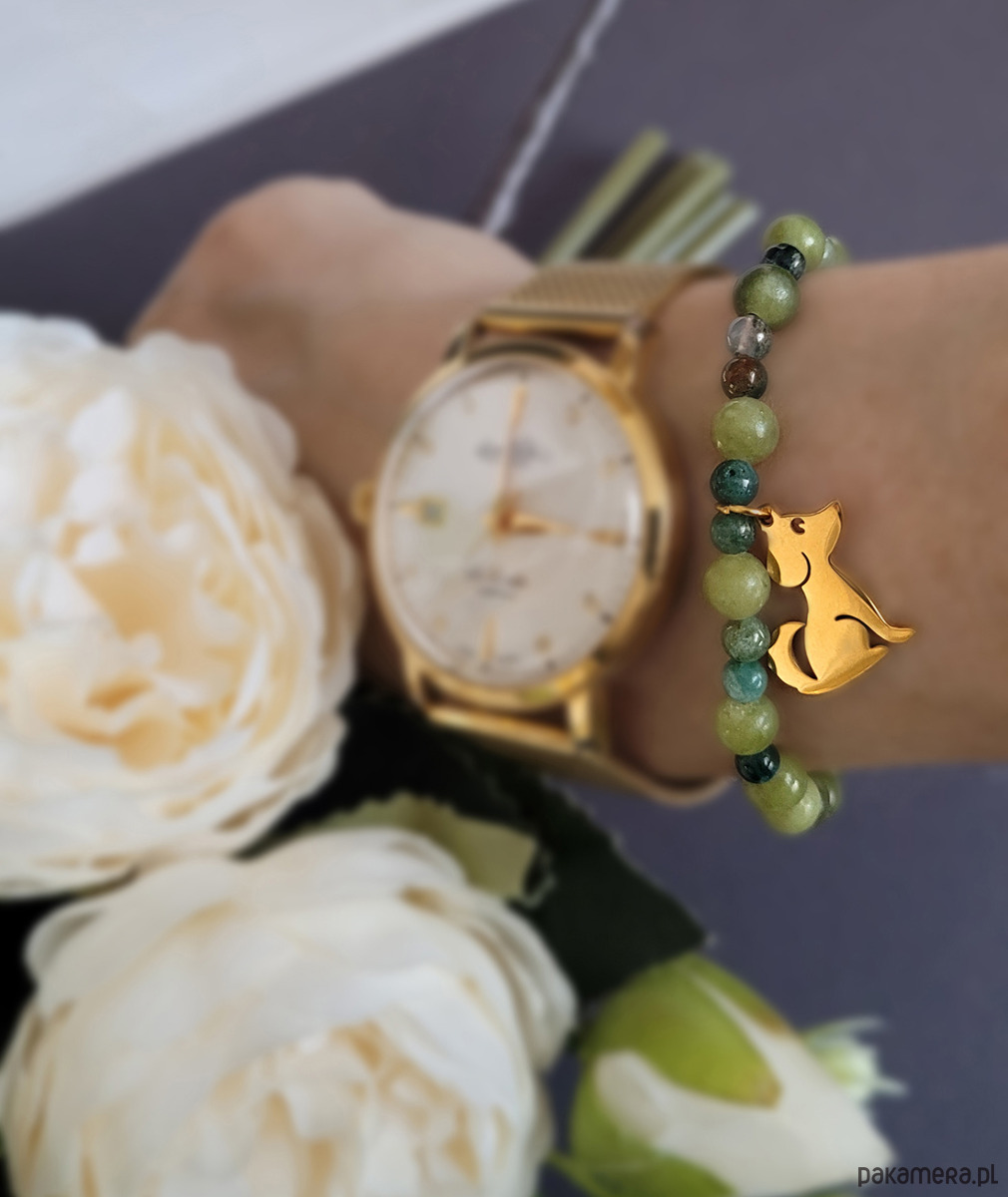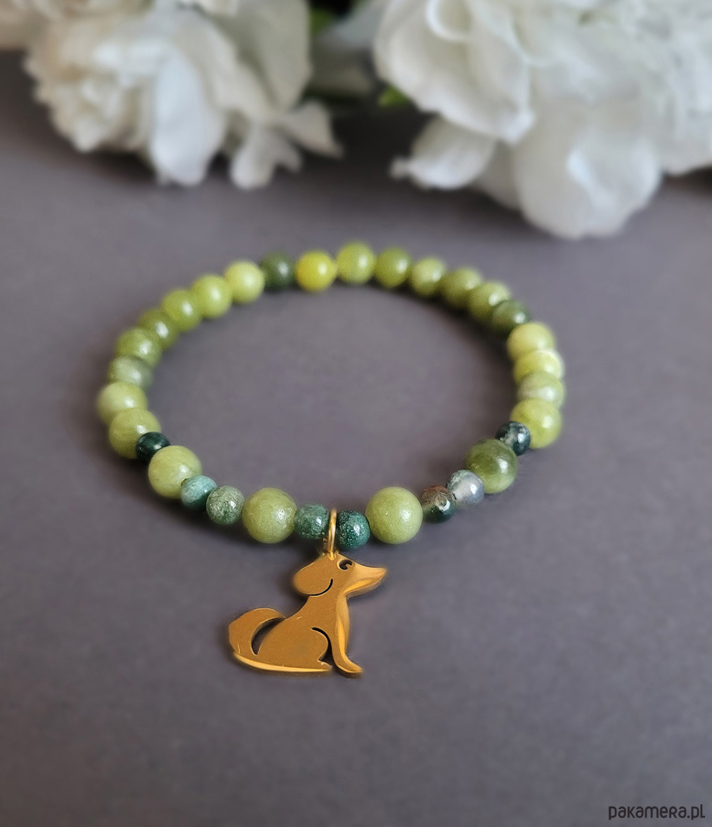Piękna bransoletka z kamieni naturalnych - Jadeitu zielonego oraz Agatu indyjskiego z przywieszką w kolorze złotym- psem. Idealna dla miłośników psów (psiarzy) ;).