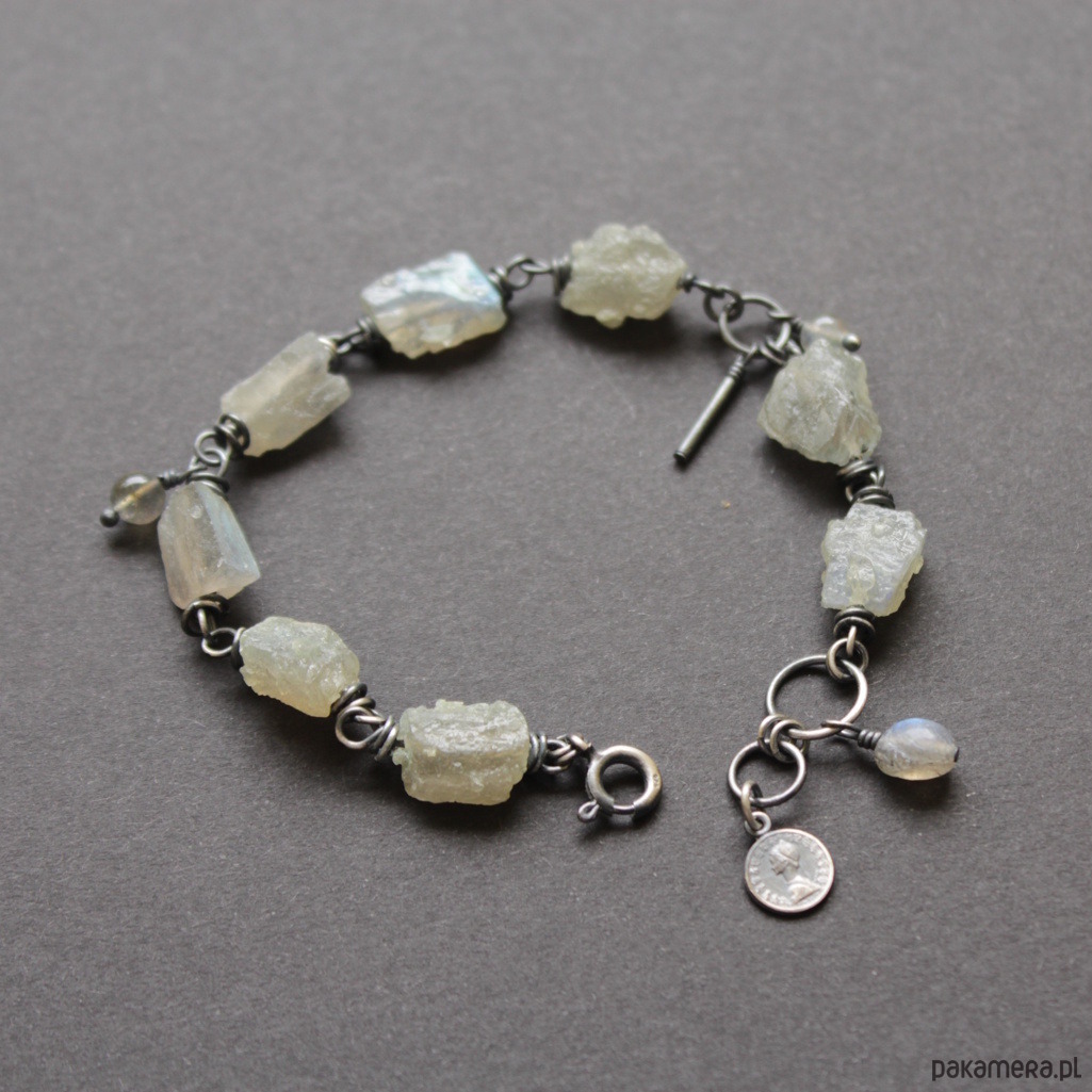 Bransoletka UNIKAT wykonana została z oksydowanego srebra próby 925 oraz surowych bryłek jsnych labradorytów wielkości 0,7-1,1 cm.