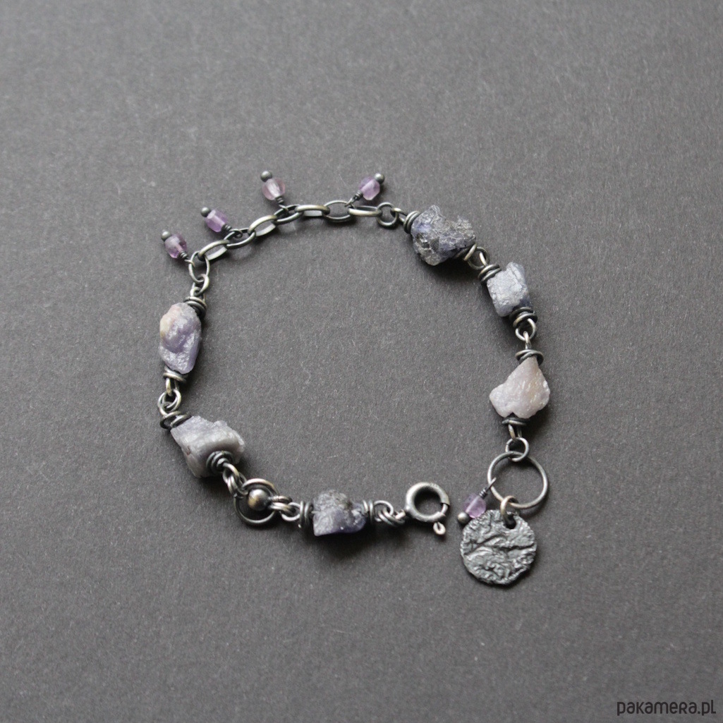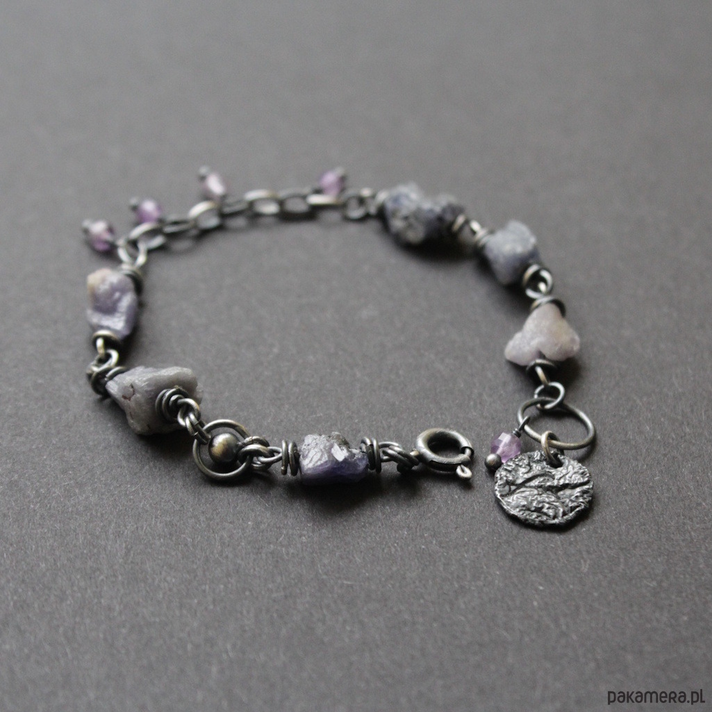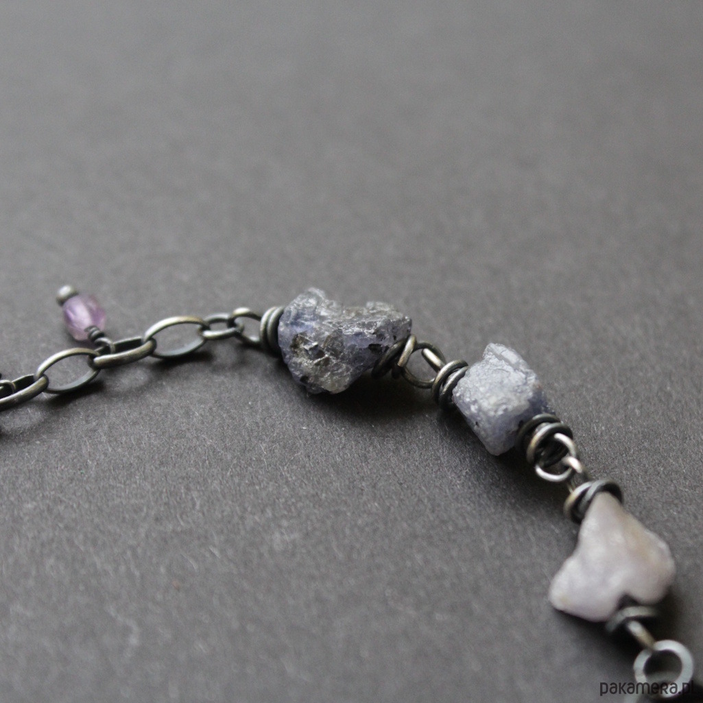 Bransoletka UNIKAT wykonana została z oksydowanego srebra próby 925 oraz surowych bryłek tanzanitów wielkości 0,5-1 cm w towarzystwie fasetowanych ametystów wielkości 0,3 cm.