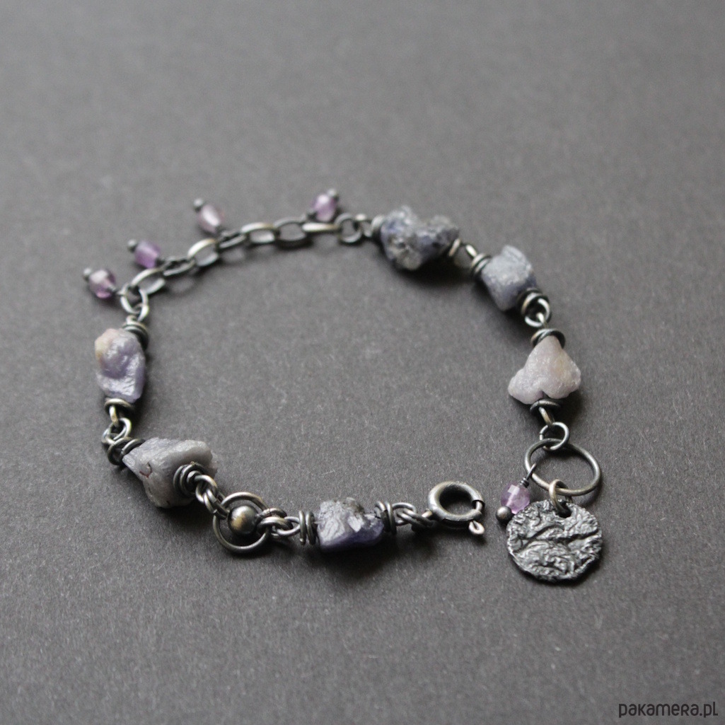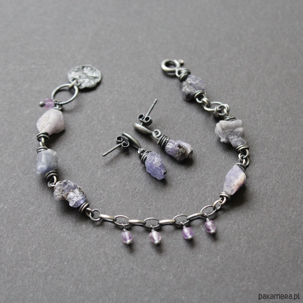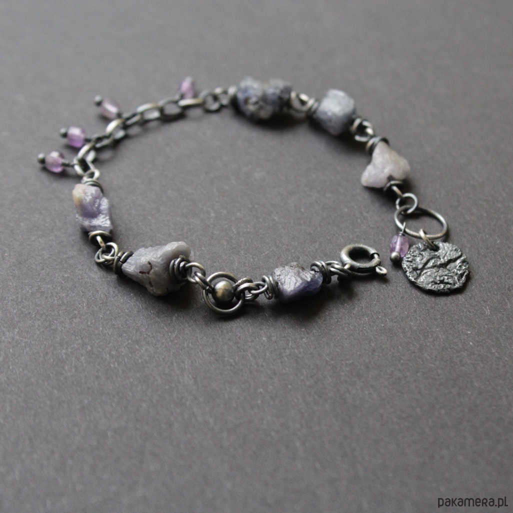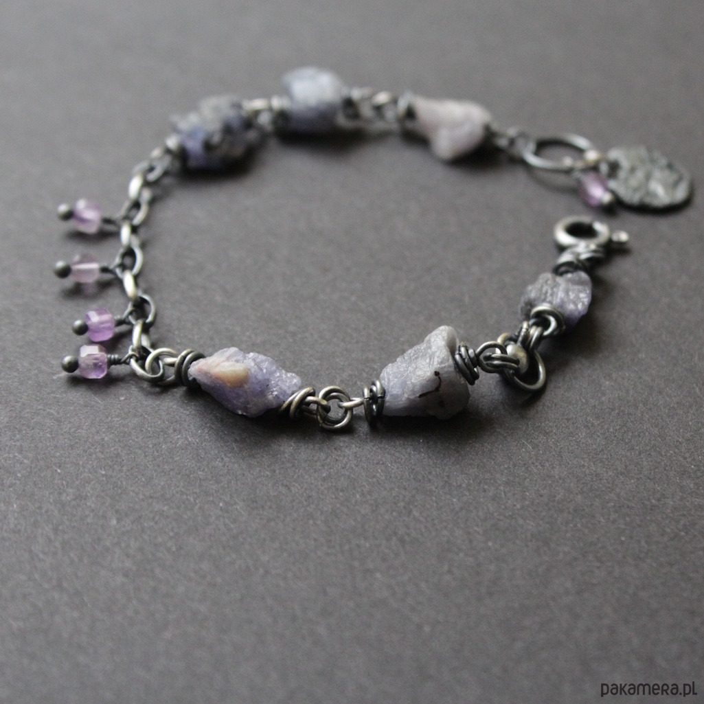 Bransoletka UNIKAT wykonana została z oksydowanego srebra próby 925 oraz surowych bryłek tanzanitów wielkości 0,5-1 cm w towarzystwie fasetowanych ametystów wielkości 0,3 cm.