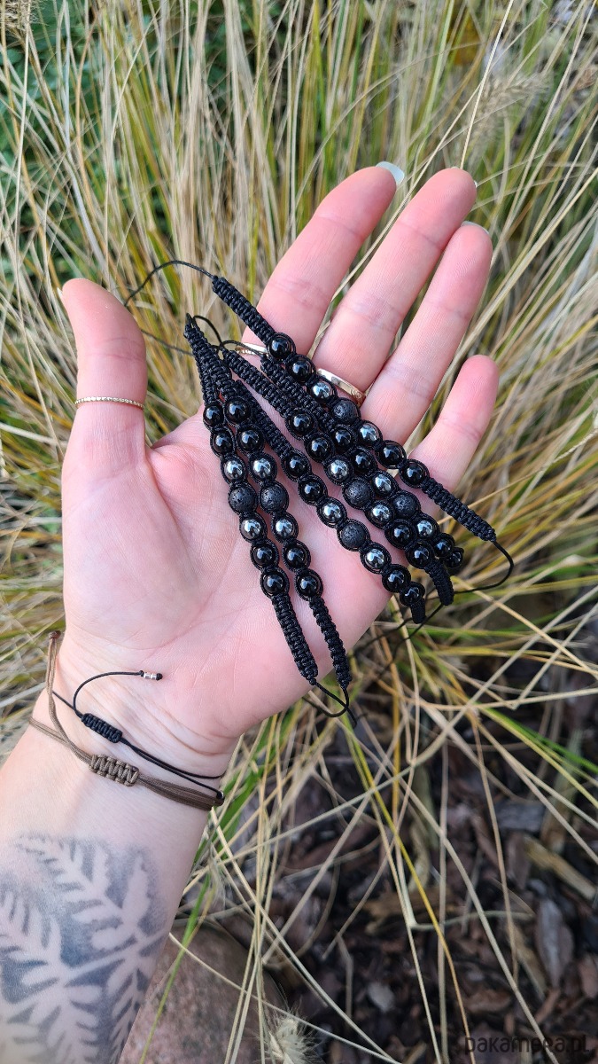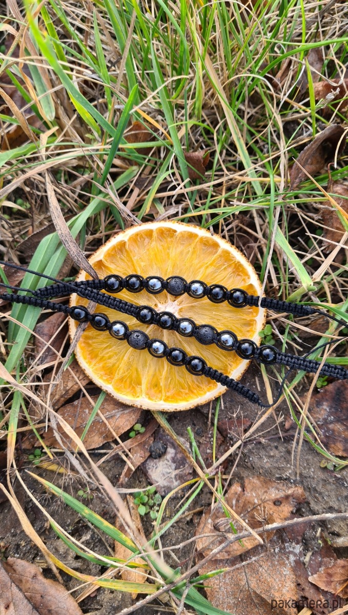 Bransoletka UNISEX, wykonana z kamieni naturalnych (kulki 6mm): lawy wulkanicznej, hematytu oraz onyksu, techniką oplatania. Fajna propozycja na prezent dla Pary.