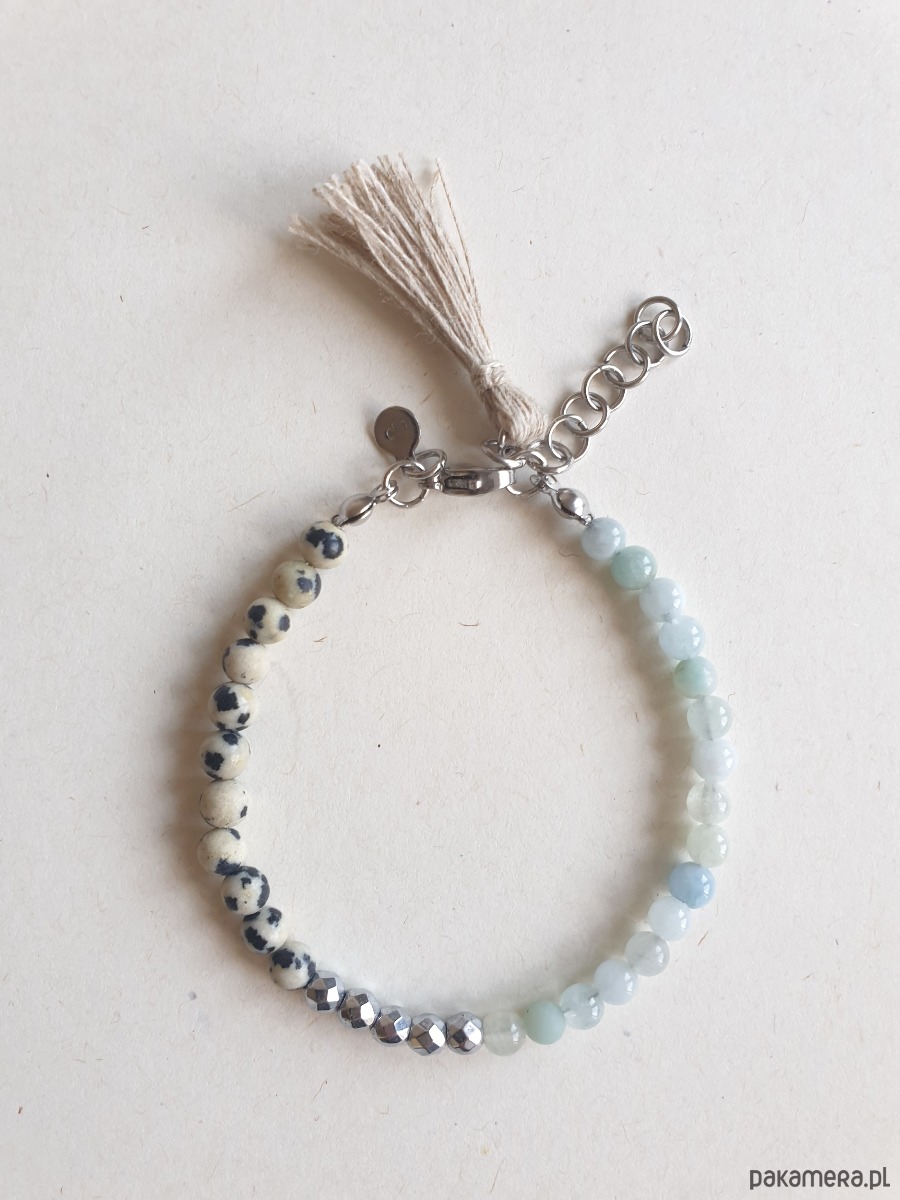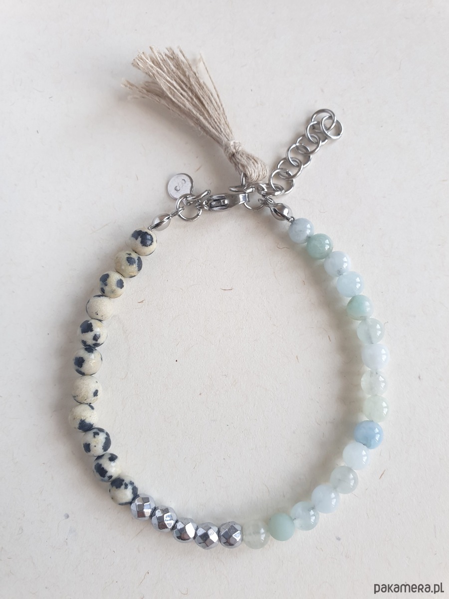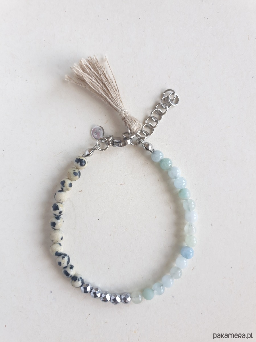 Bransoletka UNO akwamaryn, jaspis dalmatyński, lniany chwost