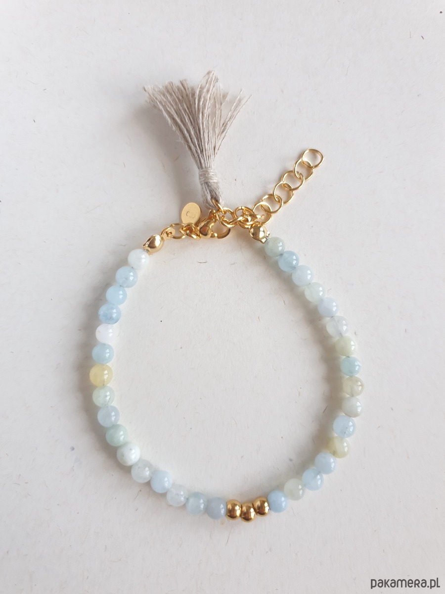 Minimalistyczna delikatna bransoletka UNO. Tworzona ręcznie z kamieni naturalnych, elementów ze stali szlachetnej złoconej (antyalergicznej) i lnianego chwosta. W tej - kulka akwamaryn