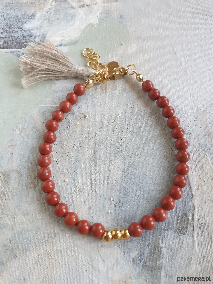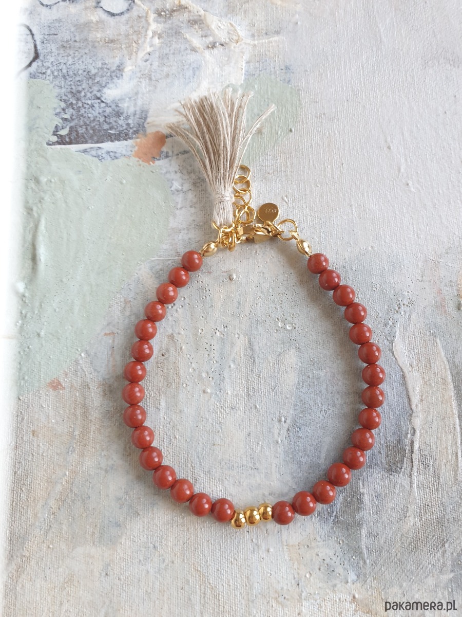 Minimalistyczna delikatna bransoletka UNO .Tworzona ręcznie z kamieni naturalnych, elementów ze złoconej stali szlachetnej (antyalergicznej) złoconej i lnianego chwosta. W tej - kulka jaspis królewski czerwony. Można dokupić naszyjnik i kolczyki w naszym sklepie.