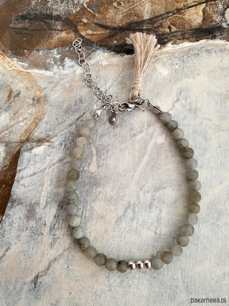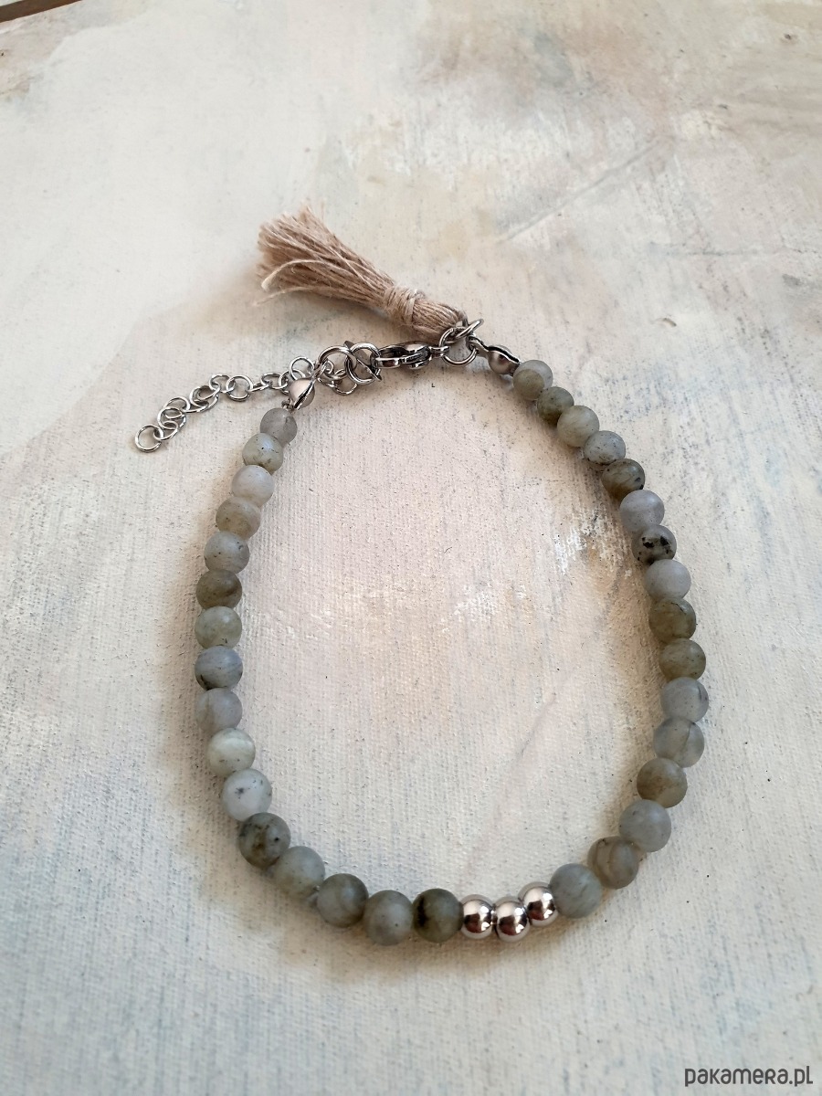 Minimalistyczna delikatna bransoletka UNO midi. Tworzona ręcznie z kamieni naturalnych, elementów ze złoconej stali szlachetnej (antyalergicznej) i lnianego chwosta. W tej - matowa kulka labradoryt