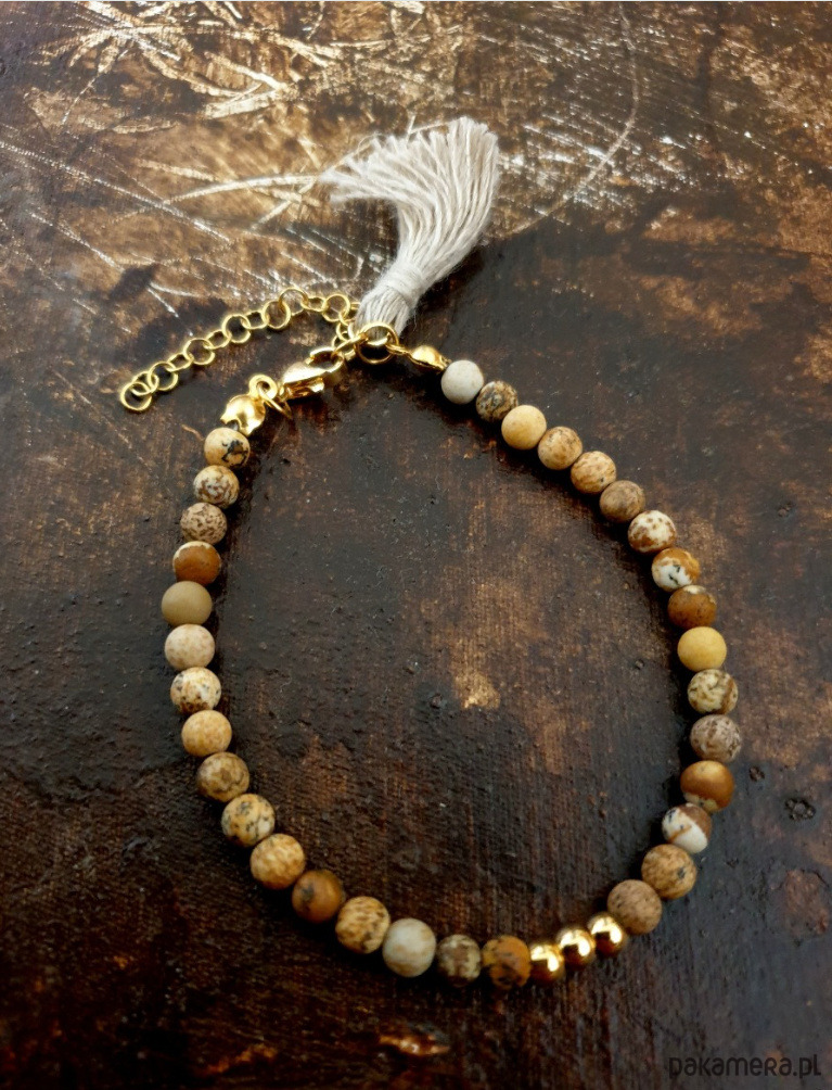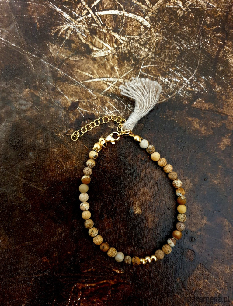 Minimalistyczna delikatna bransoletka UNO midi. Tworzona ręcznie z kamieni naturalnych, elementów ze złoconej stali szlachetnej (antyalergicznej) i lnianego chwosta. W tej - matowa kulka jaspis obrazkowy.